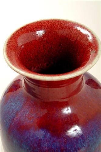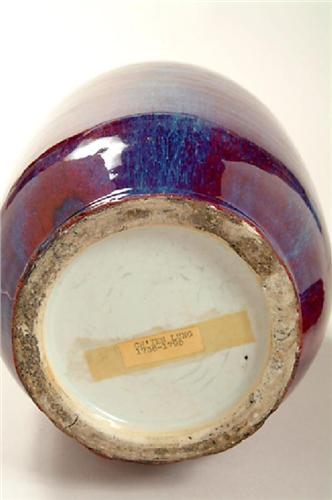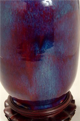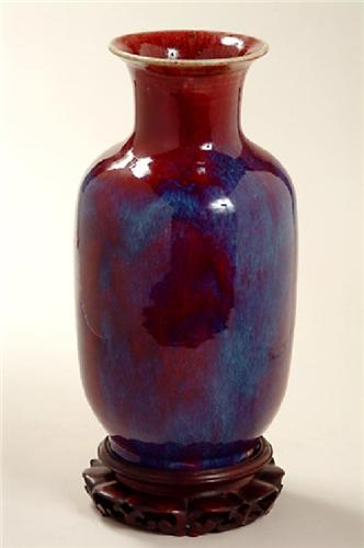 Dated - Ch’ien Lung 1736-1795, 14” by 7 ½” in diameter. Iridescent glaze of brown, red and blue. Very good condition. On a wooden base, 1 7/8” by 7 ¾” in diameter, with five high relief scrolling cutouts. 14” by 7 ½” in diameter.