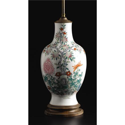 <B>A Chinese Chia Ching Dynasty Vase Fitted as a Lamp</B></I><BR><BR>Unknown maker, China<BR>Circa 1796-1820<BR>Porcelain, wood<BR>Unmarked<BR>30.25 inches high (total)<BR><BR>Of baluster form, with a blossoming peony motif with sprays of flowers on a white ground; mounted on a wood base.<BR><BR> <B>Condition Report:</B> Drilled and wired.<BR><BR><b>Shipping:</b> Requires 3rd Party Shipping (<a target="_blank" href="http://www.heritageauctions.com/common/shipping.php">view shipping information</a>)
