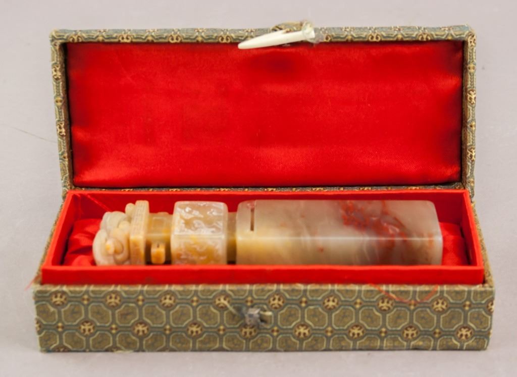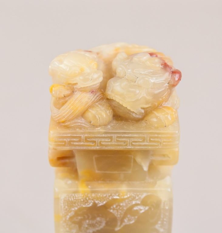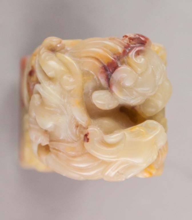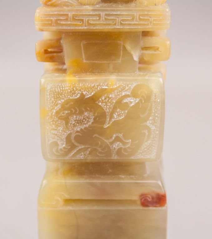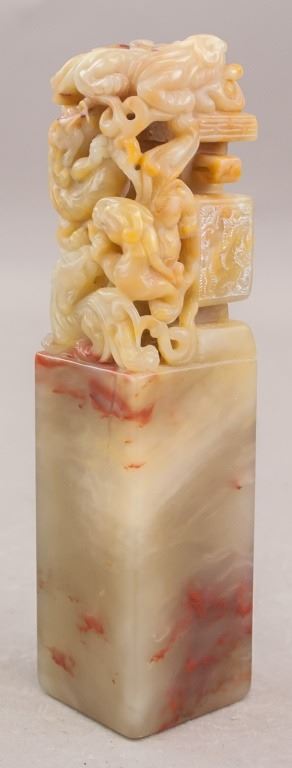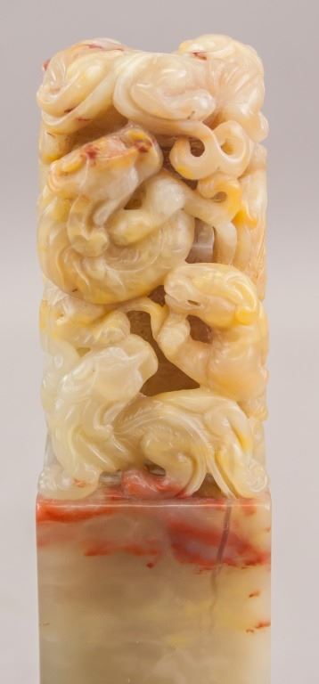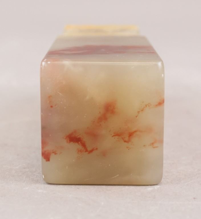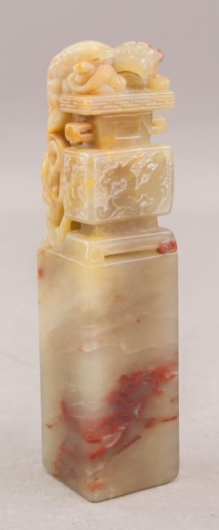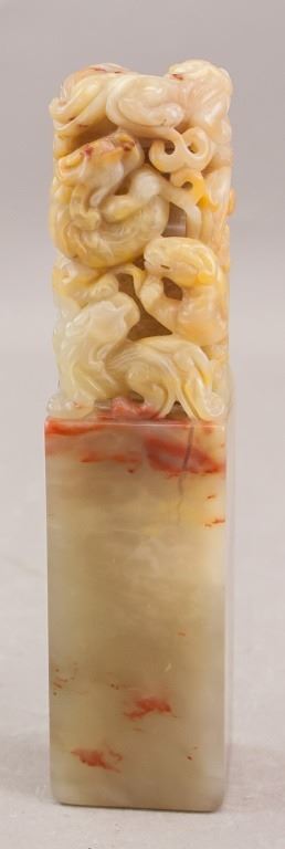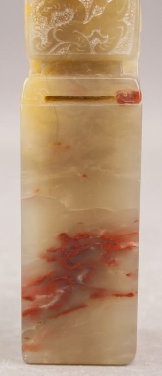Chinese chicken blood stone carved seal. Of light yellow tone with streaks of red. Carved with dragon. 14 x 3.5 cm, 330 g.
