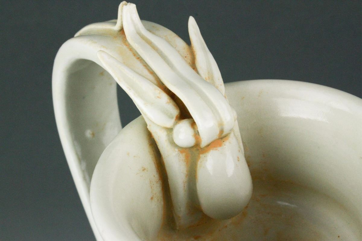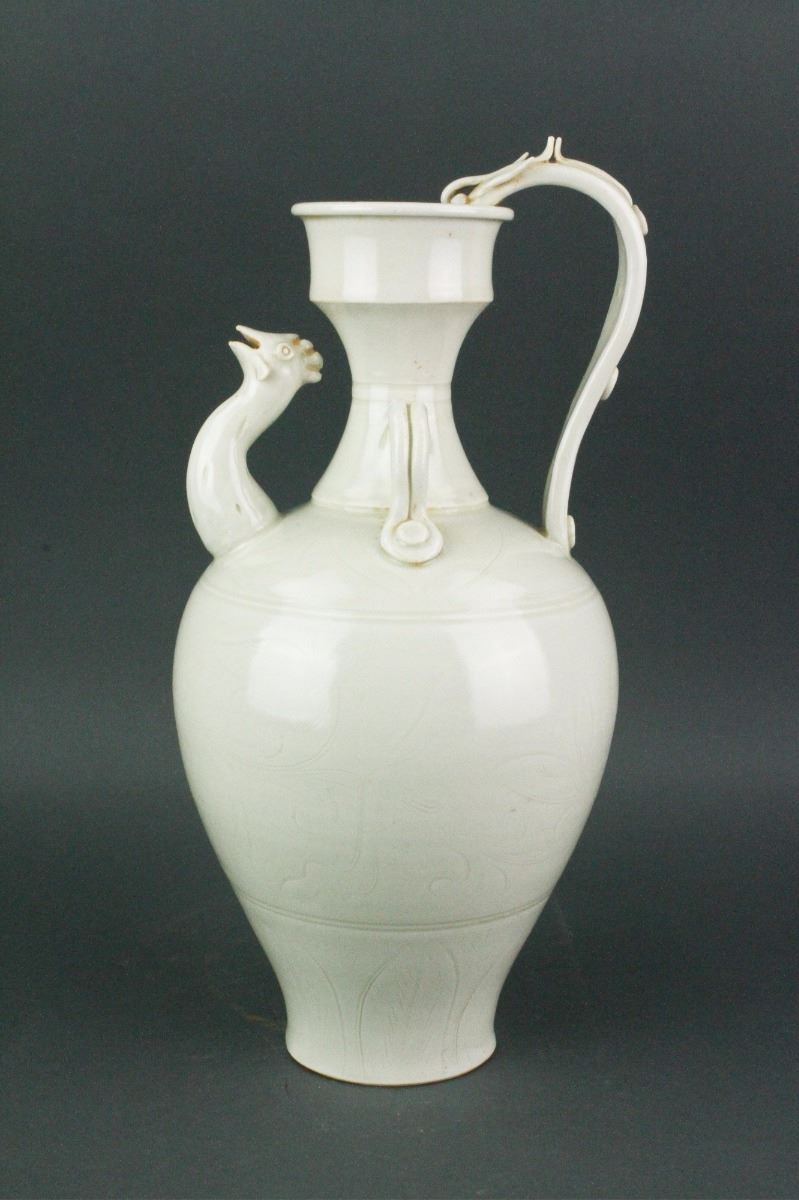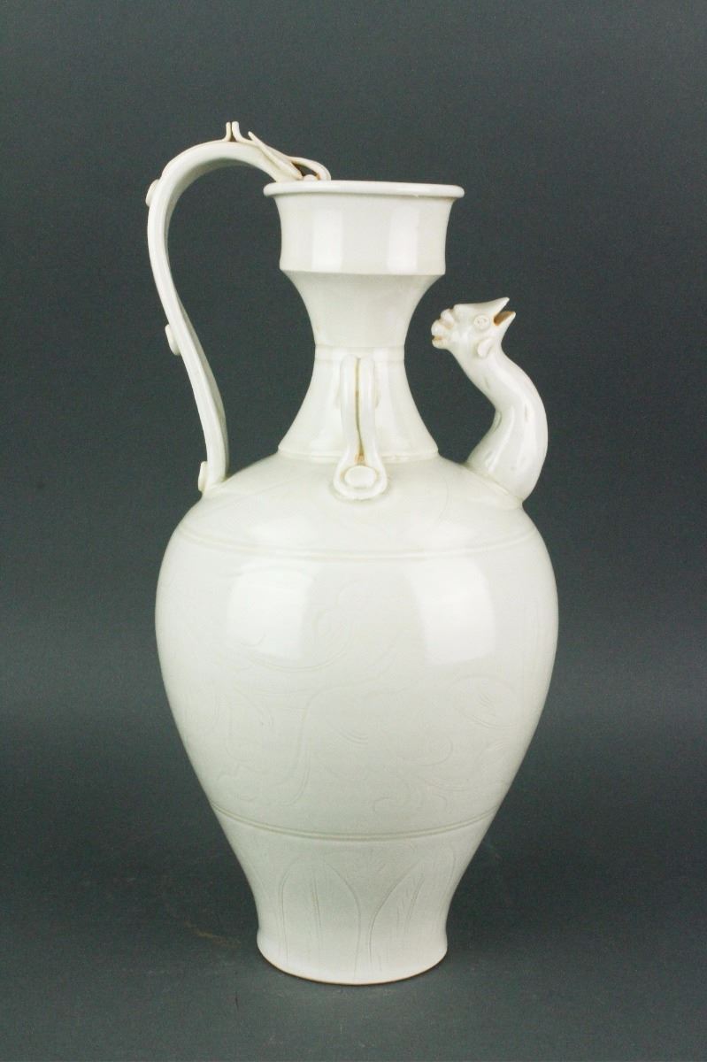 Chinese chicken-head porcelain ewer; Song or Yuan style; of bulbous body tapering towards the base; with a curved handle and a chicken-head mock spout; covered in white glaze with archaistic pattern engravings; one-character Dragon mark on base; H: 30 cm, D: 15 cm, 945 grams