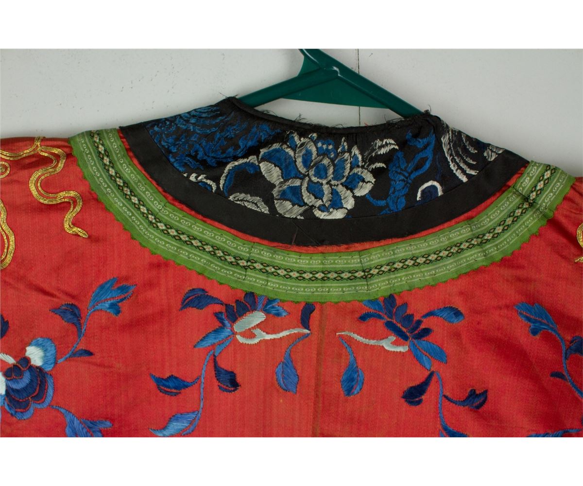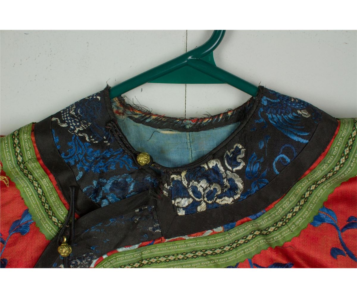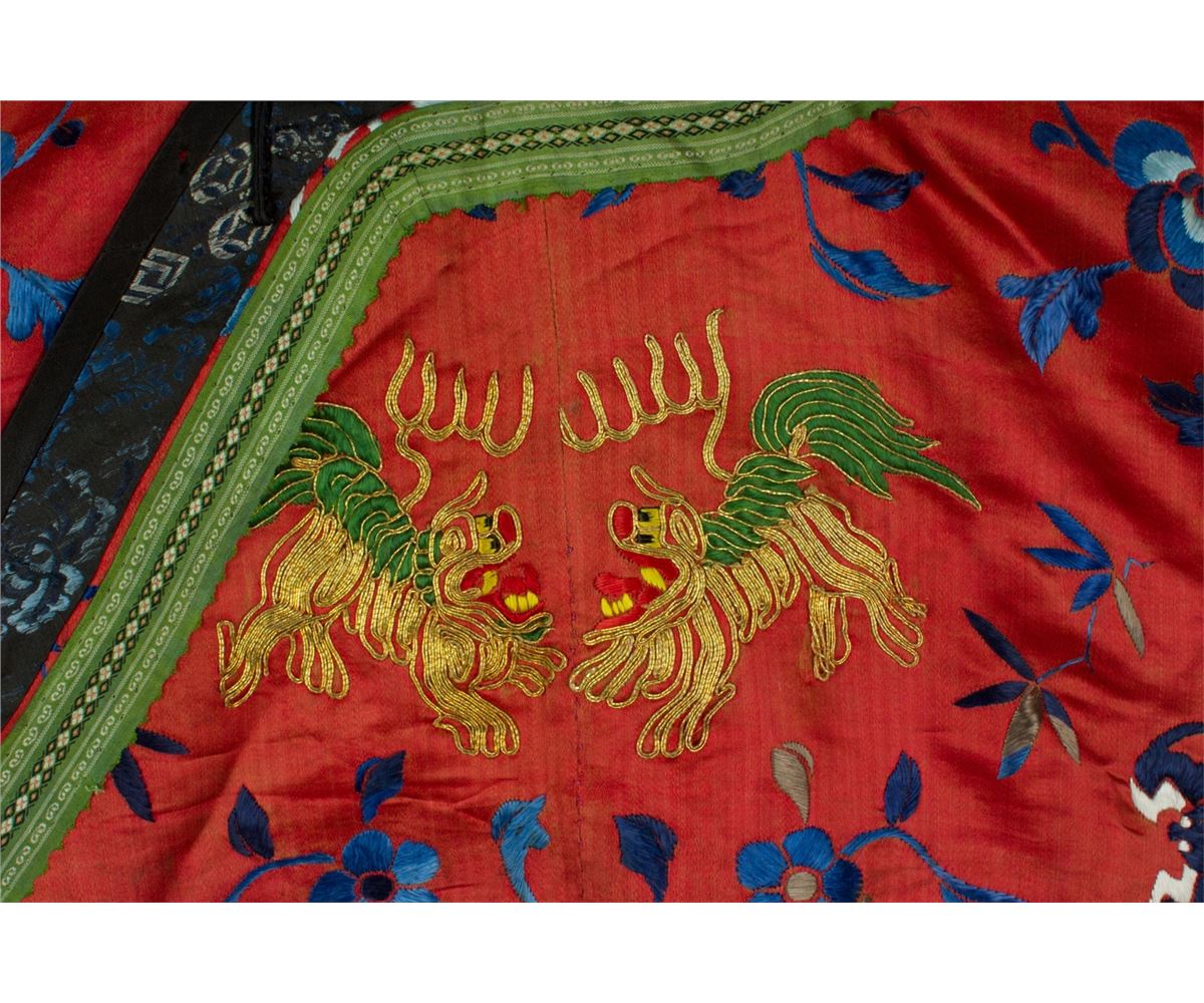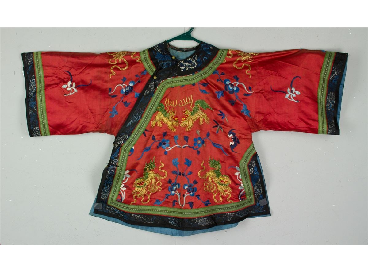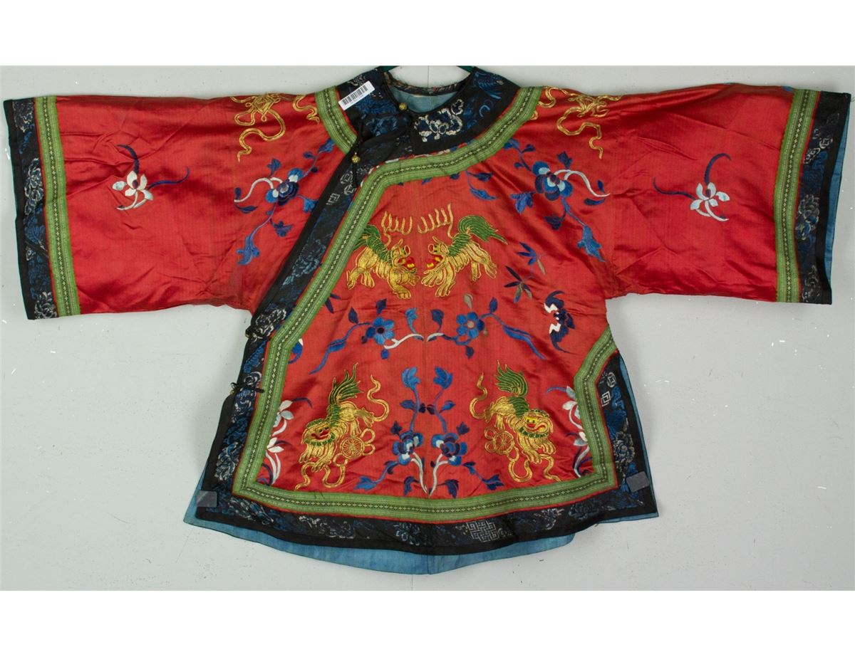 Chinese Children's robe, red ground with embroidery of auspicious plants and animals. L: 61 cm, W: 70 cm