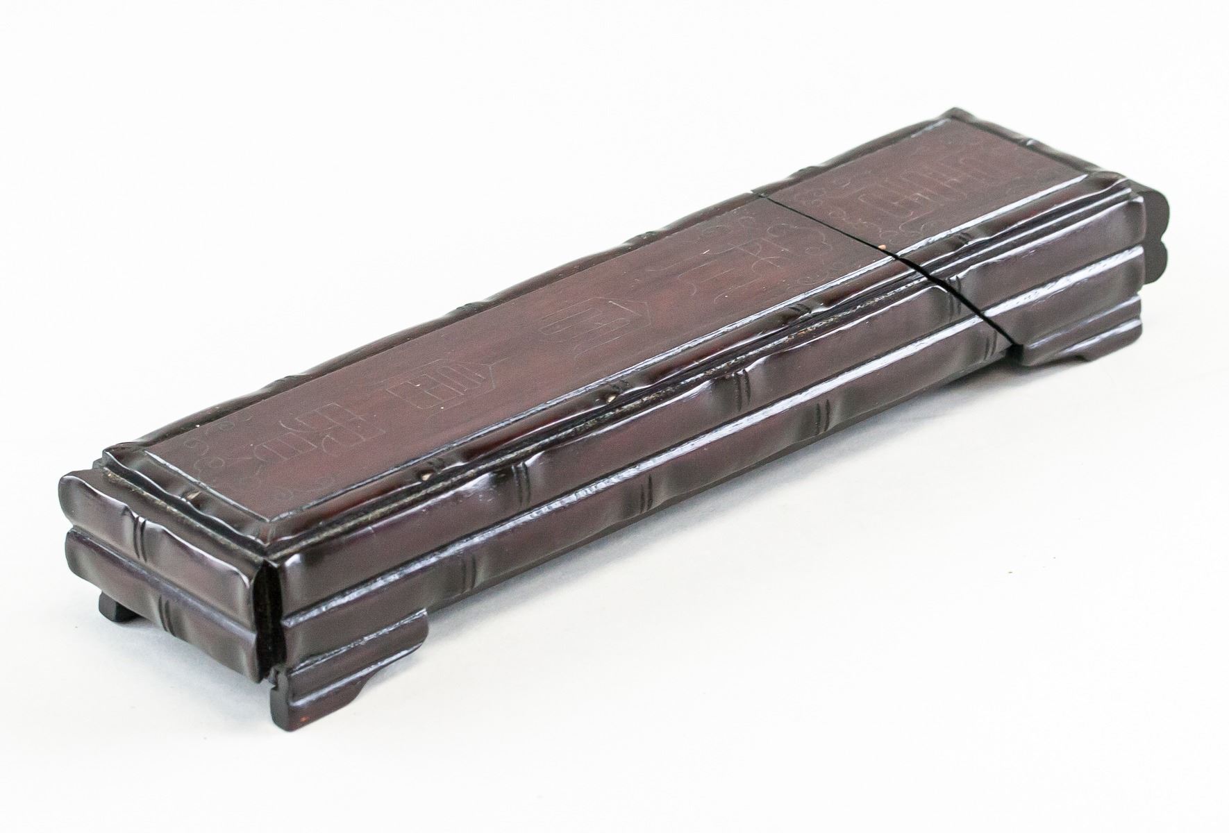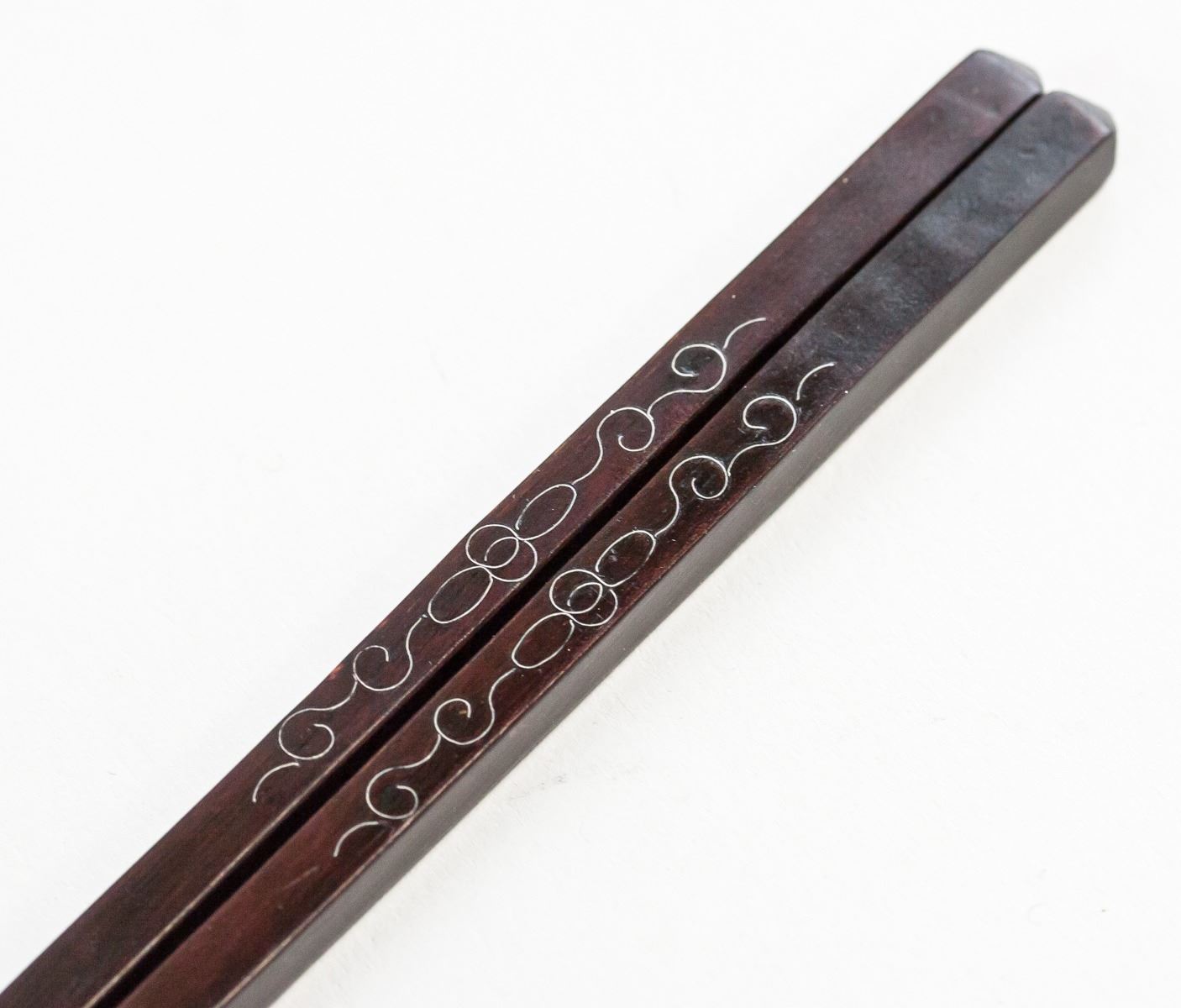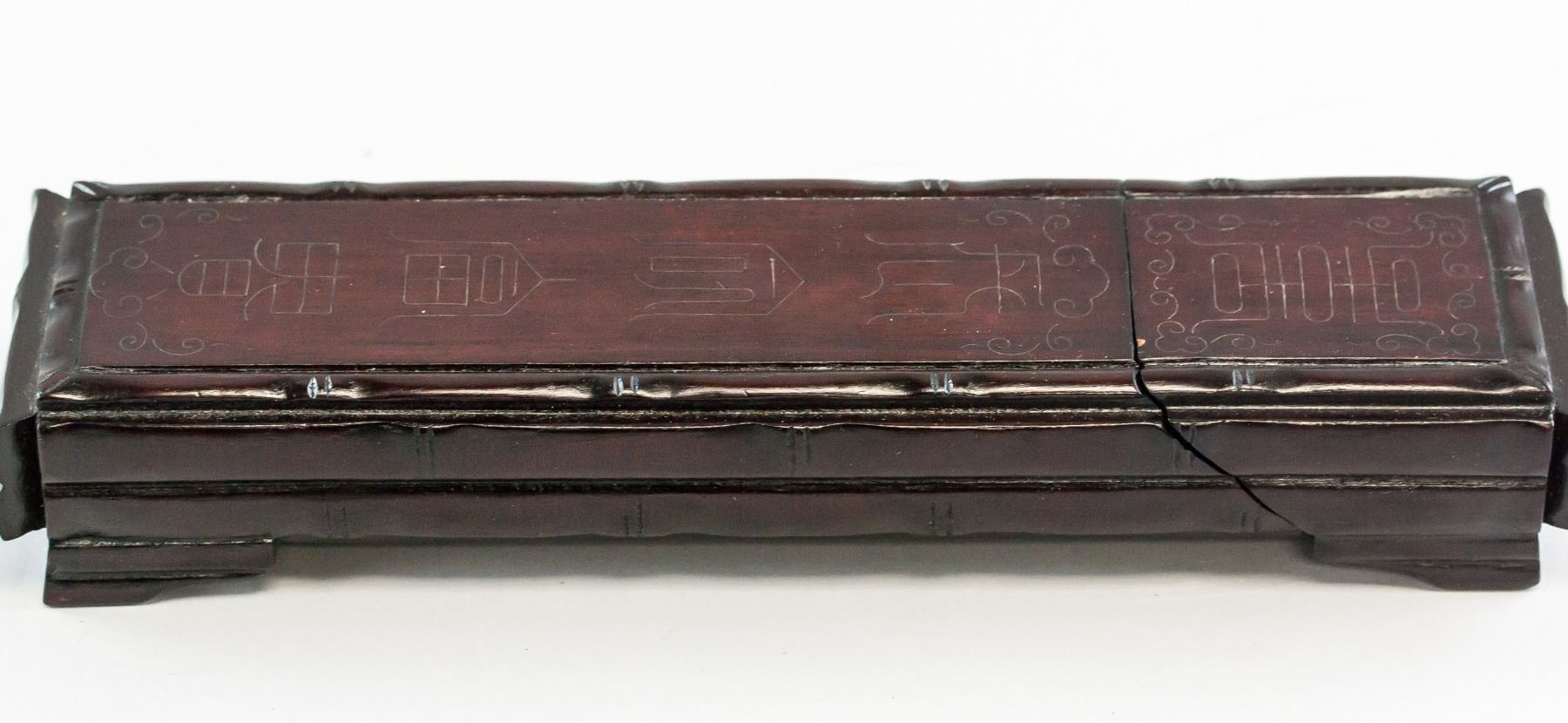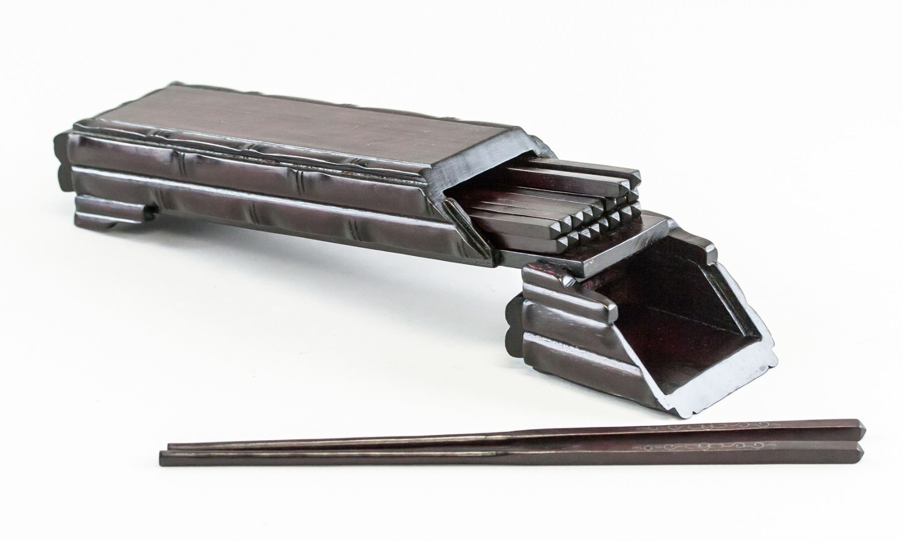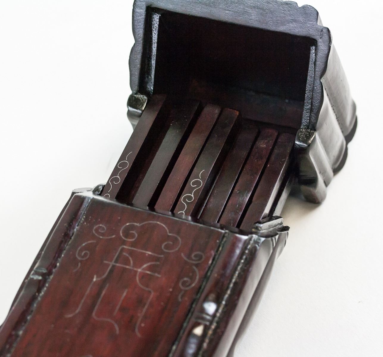 Chinese wood chopsticks with box. Box carved with Chang Ming Fu Gui (longevity and wealthy). 6 x 28 cm, 476 grams