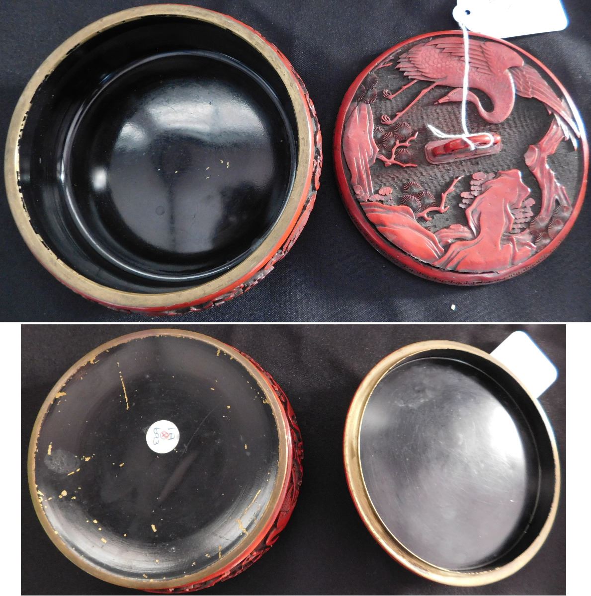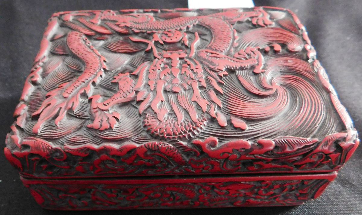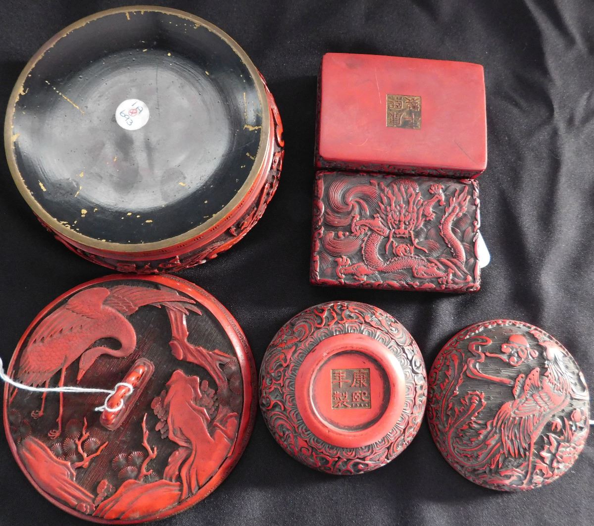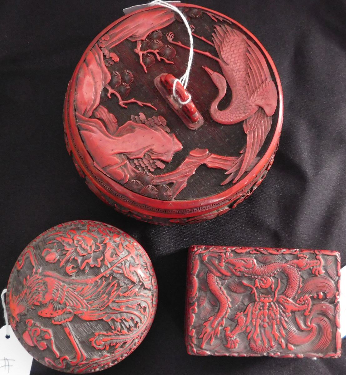 Chinese Cinnabar Box Set, 20th century. Made of cinnabar, lacquer and brass. Items measures 6" x 3", 4" x 2" and 4" x 2". Made in China. Condition: Minor separation on top of largest item, others good, see images. Shipping: $20.