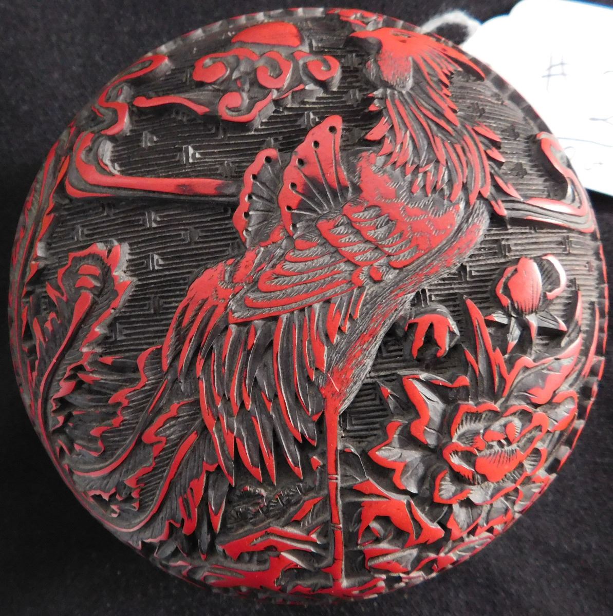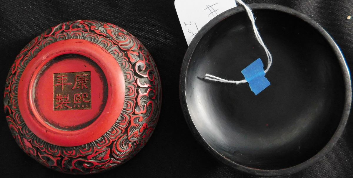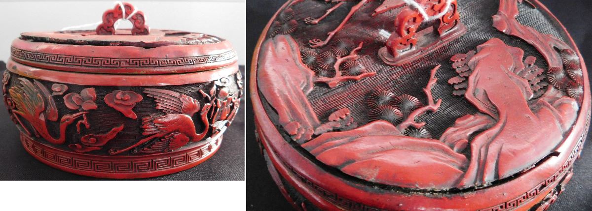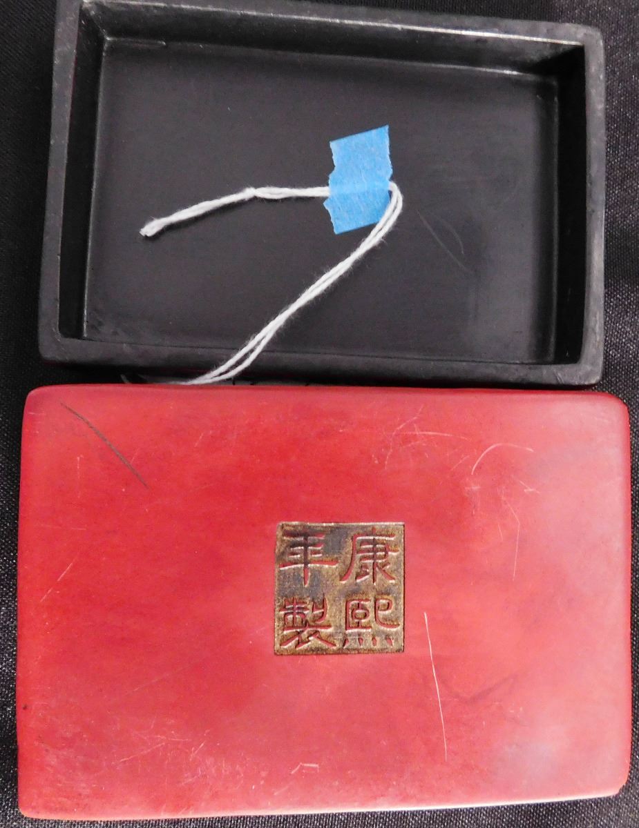 Chinese Cinnabar Box Set, 20th century. Made of cinnabar, lacquer and brass. Items measures 6" x 3", 4" x 2" and 4" x 2". Made in China. Condition: Minor separation on top of largest item, others good, see images. Shipping: $20.