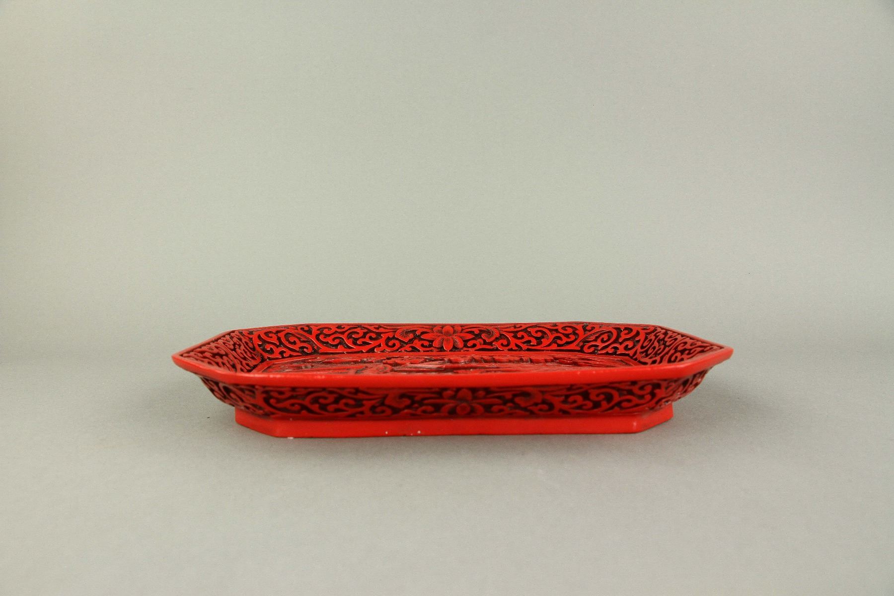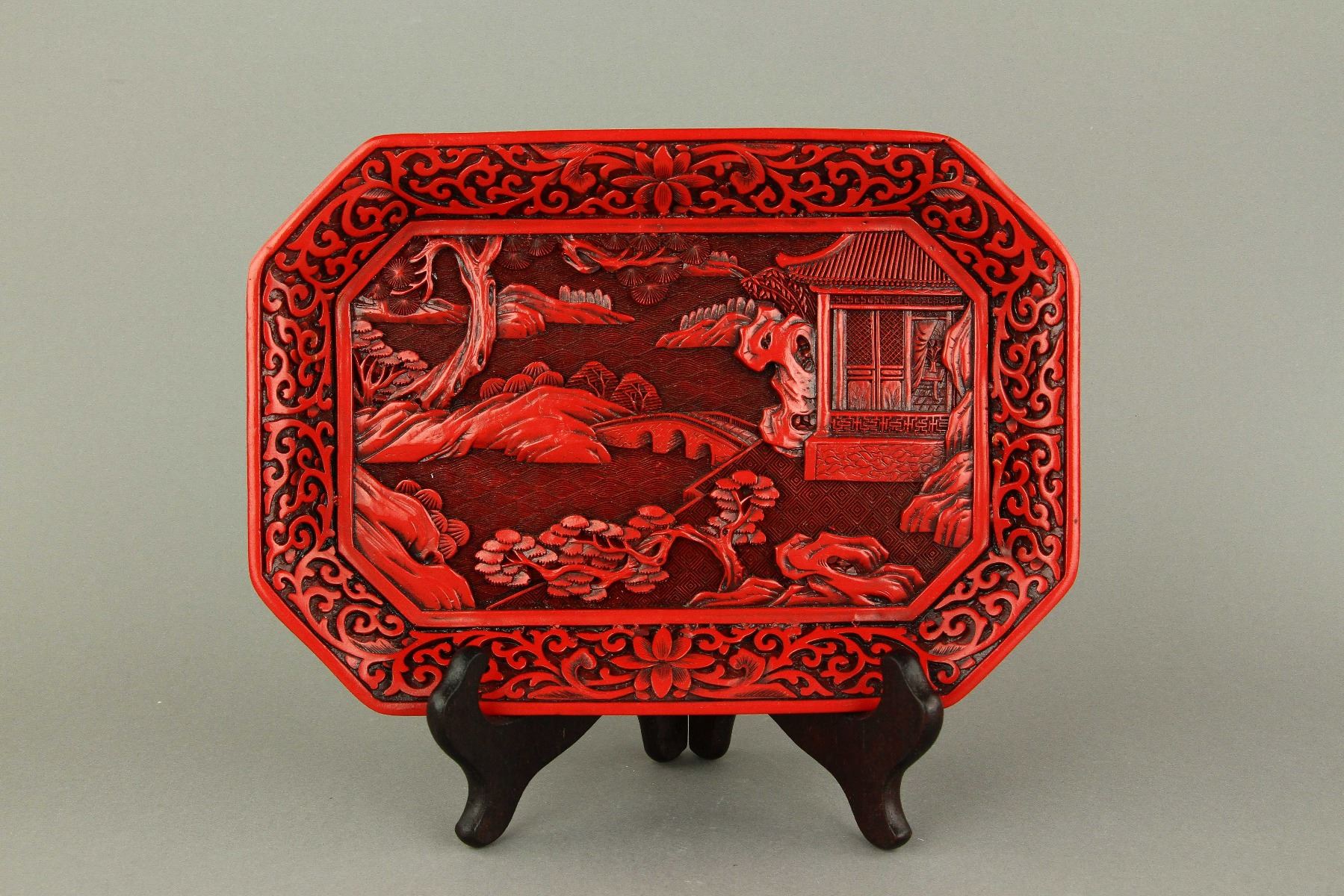 Chinese cinnabar lacquer carved plate; of octagon shape; featuring courtyard scenery in low relief; H: 3 cm, W: 17 cm, L: 24.4 cm, 326 grams