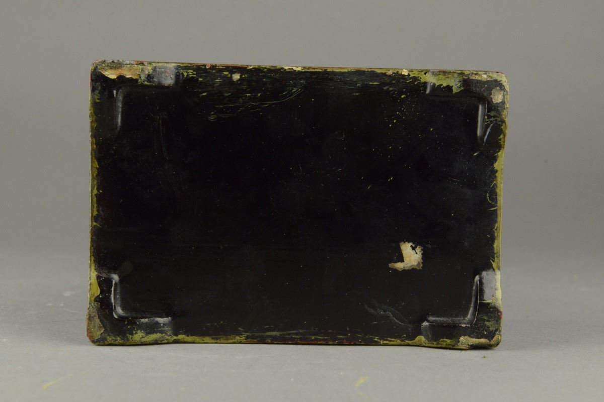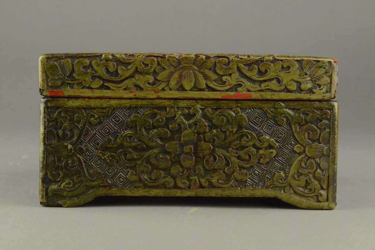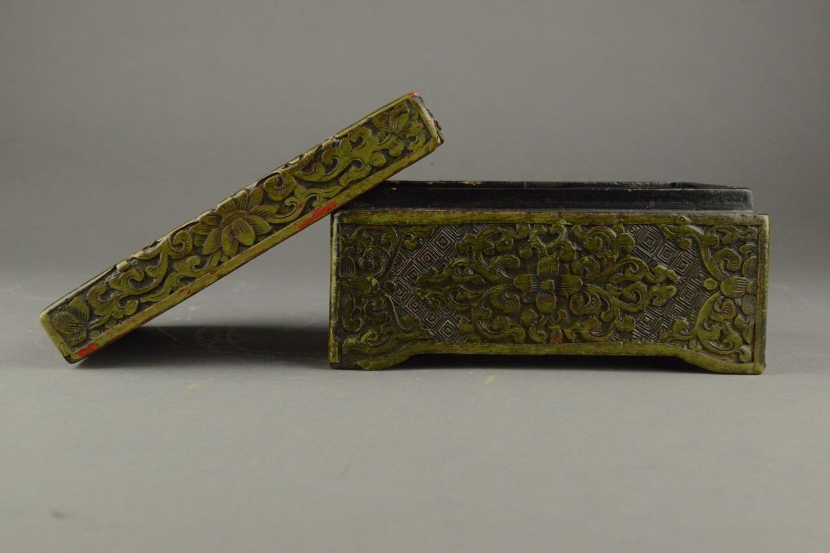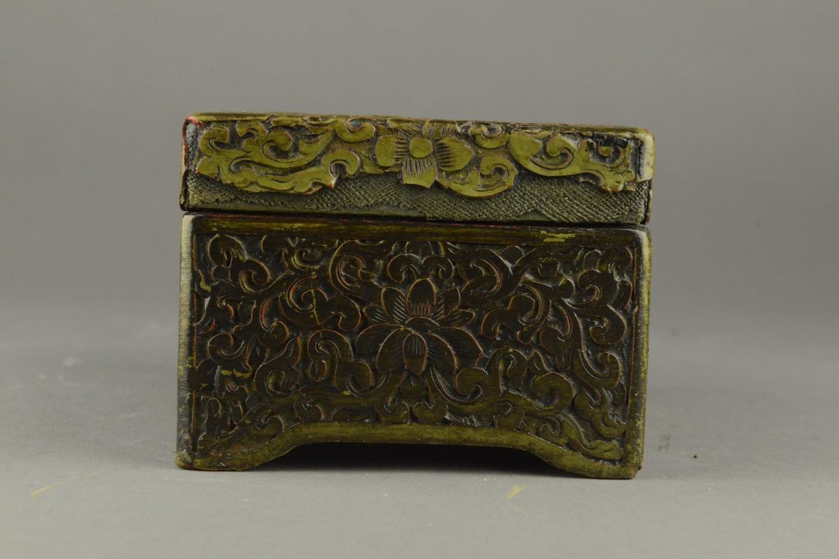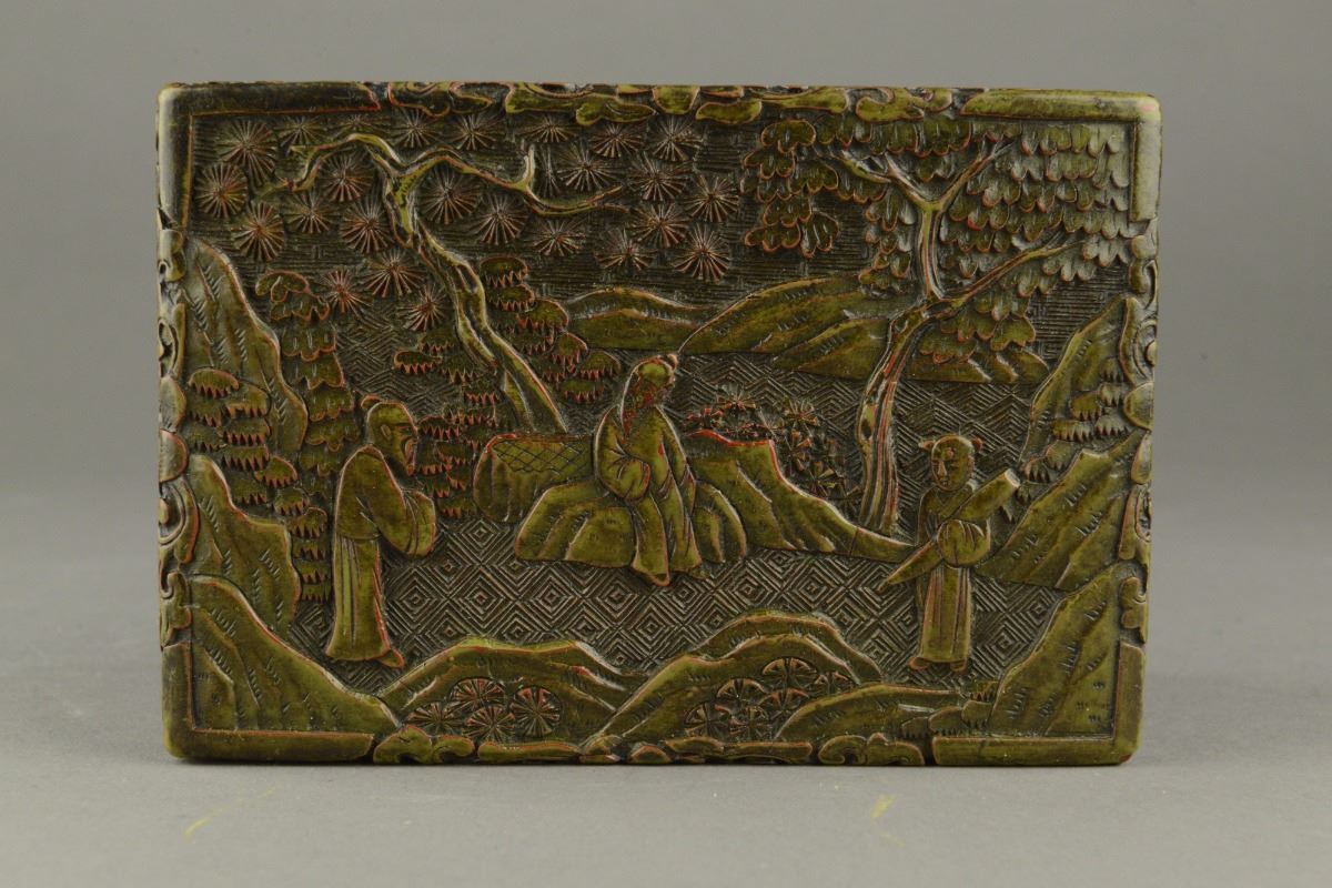 Finely carved Chinese lacquer square box, top panel featuring scholars resting in courtyard, sides featuring lotus sprays, box painted spinach green. H: 7 cm, W: 10 cm, L: 15 cm, 332 grams.