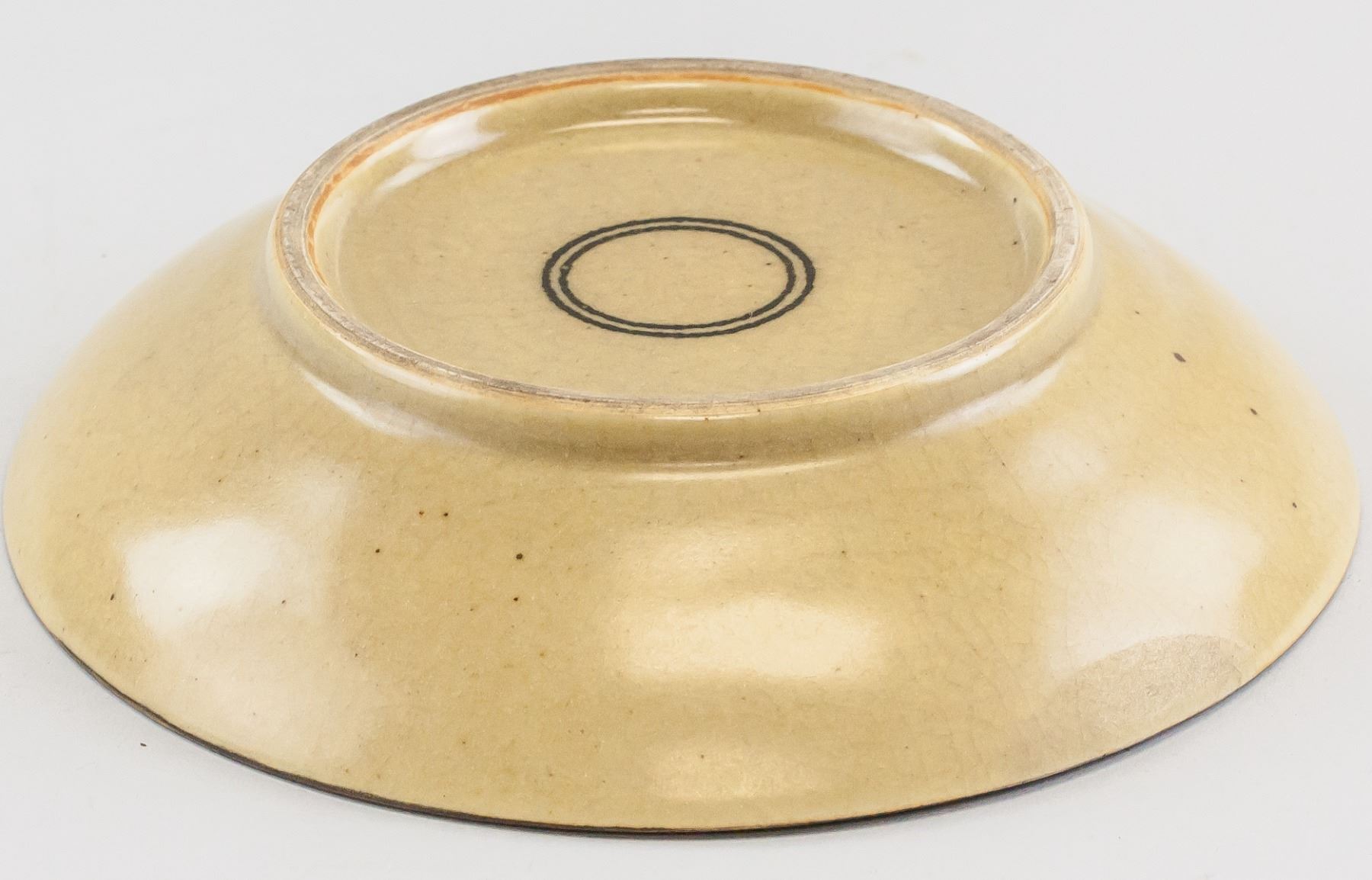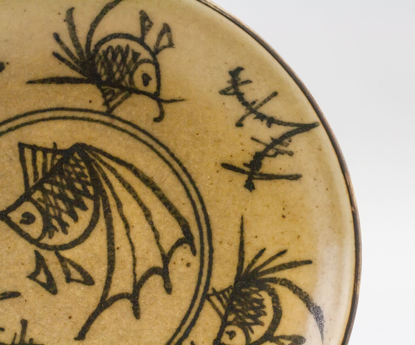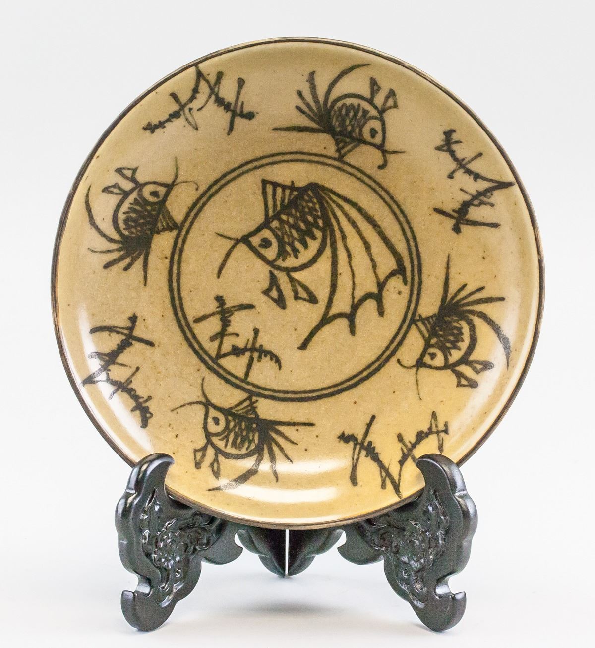 Chinese Cizhou style porcelain plate. Of round edge, tapering to bottom. Supported on short foot rim. Painted with fish. Doule ring mark on base. 5 x 22 cm, 944 grams