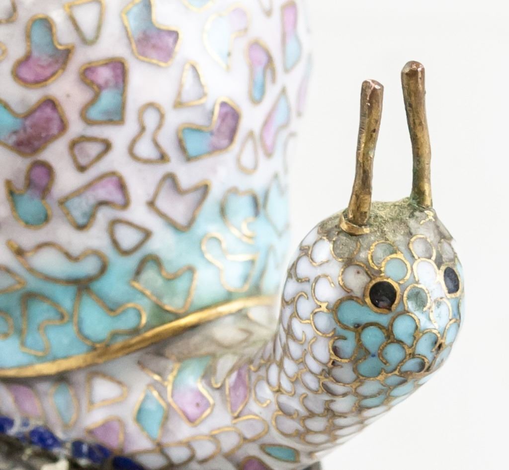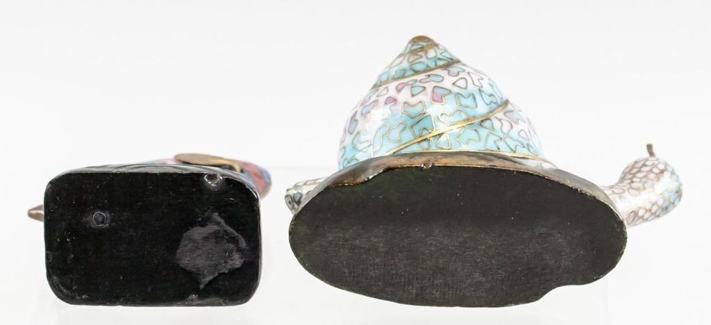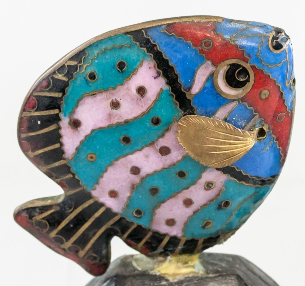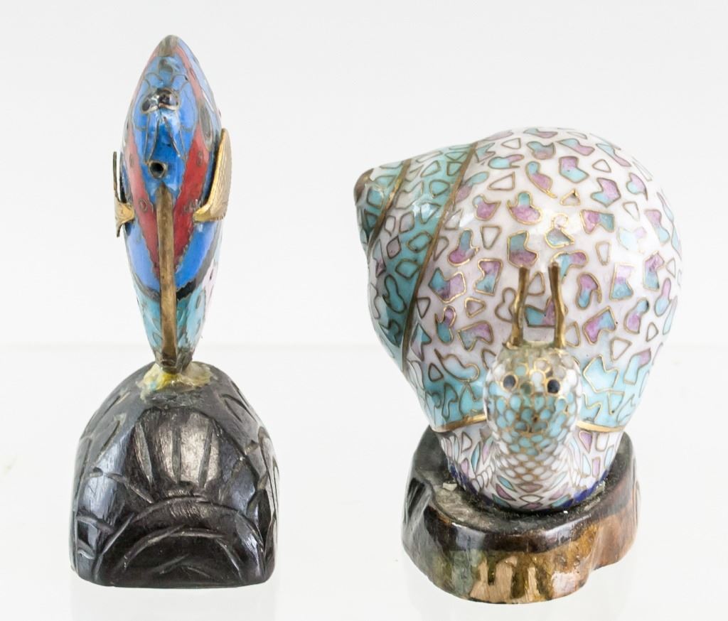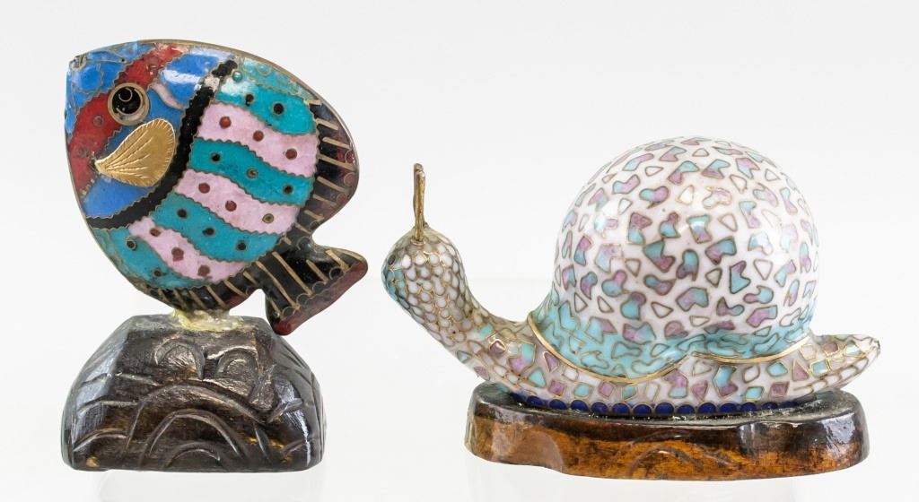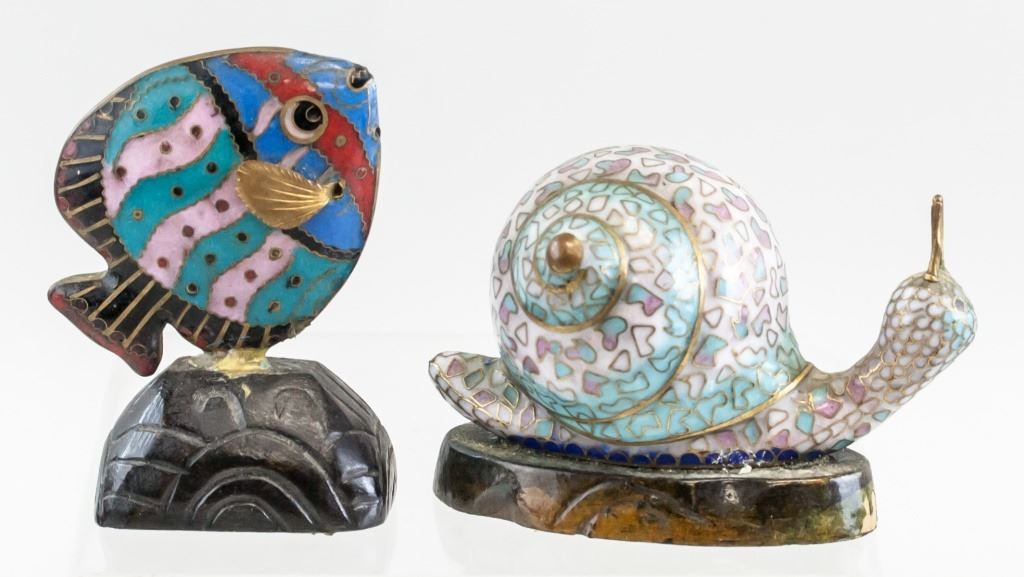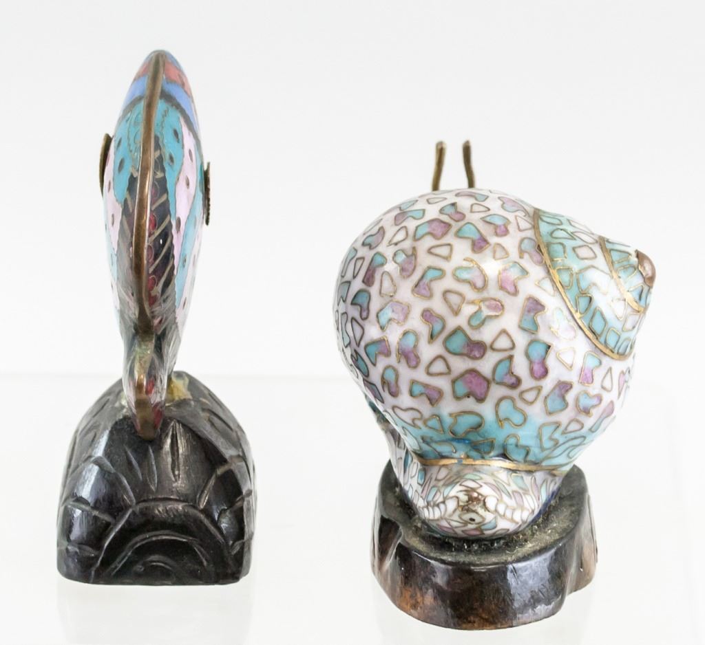 Chinese cloisonne figures. Featuring fish and snail on stone stands. 5.5 x 8.5 cm, 148 grams total.