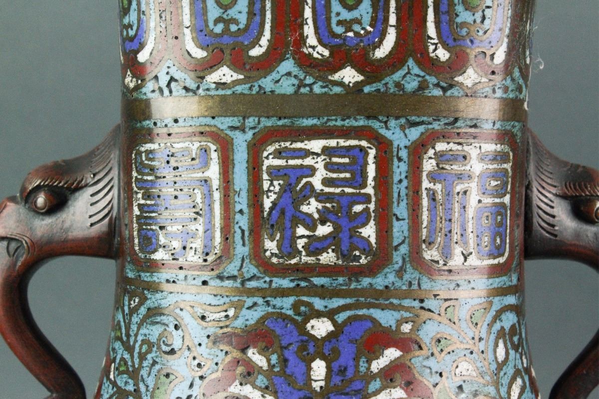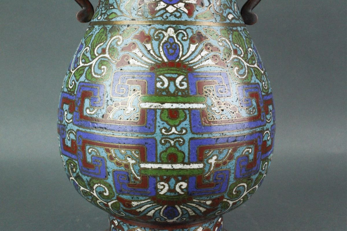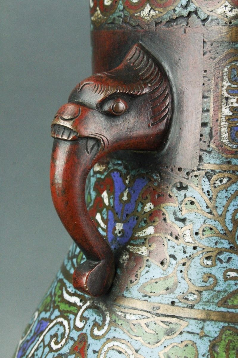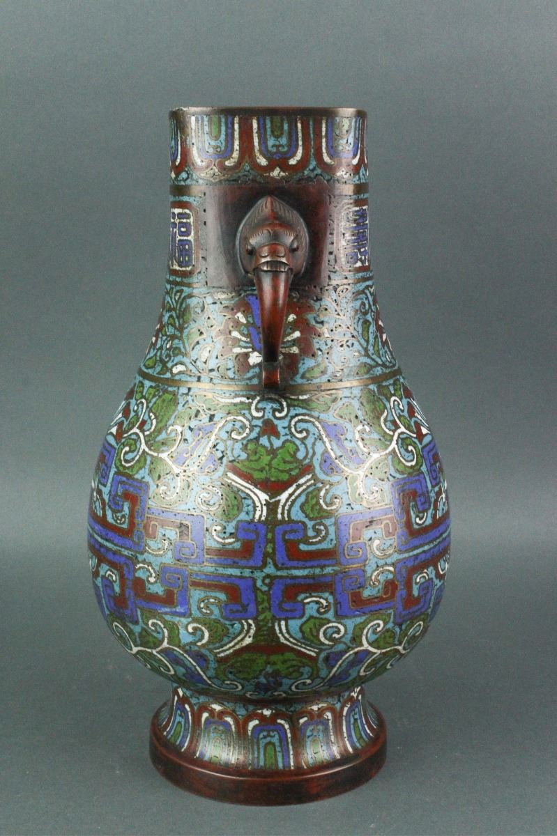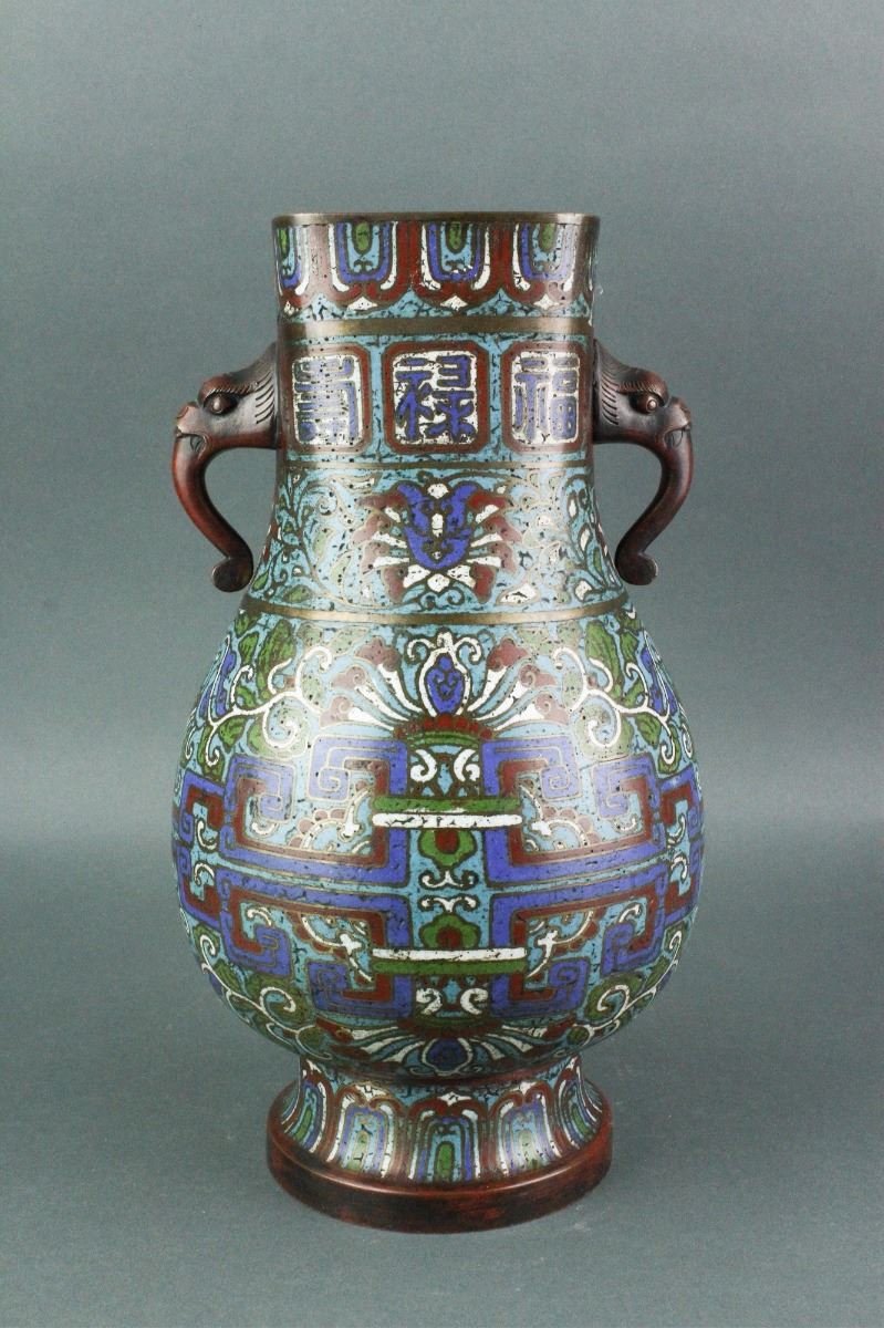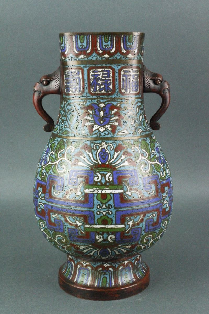 Chinese bronze cloisonne vase; of Hu form with a globular body and square neck; flanked by double elephant handles; decorated with Fu Lu Shou pattern on body; four-character mark on base; H: 30 cm, D: 17 cm, 2430 grams