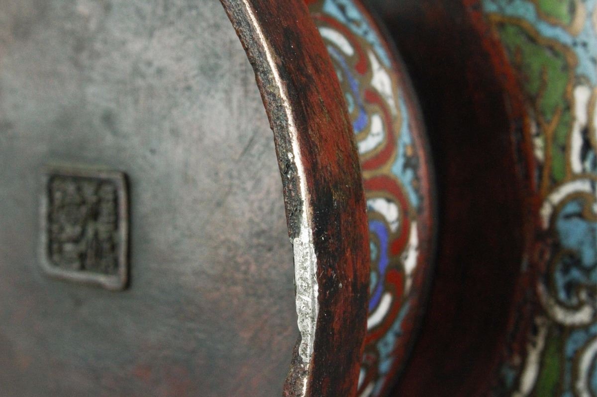 Chinese bronze cloisonne vase; of Hu form with a globular body and square neck; flanked by double elephant handles; decorated with Fu Lu Shou pattern on body; four-character mark on base; H: 30 cm, D: 17 cm, 2430 grams