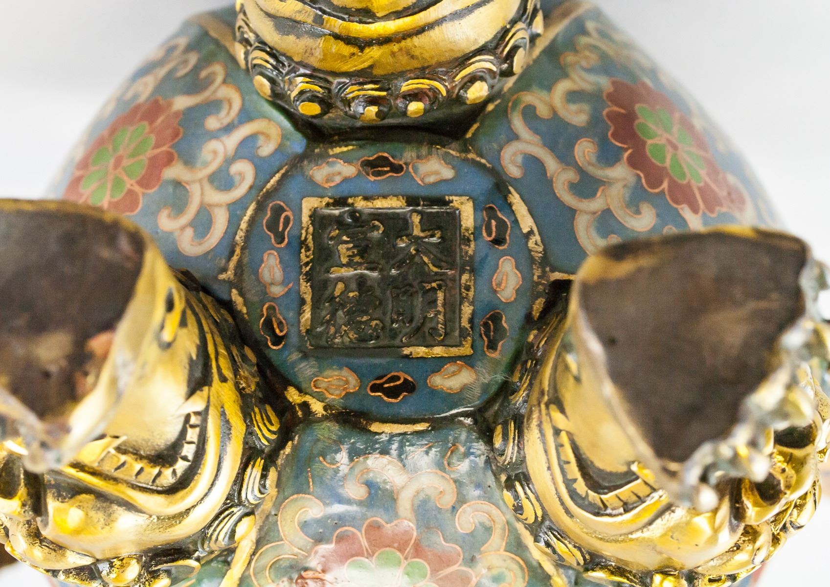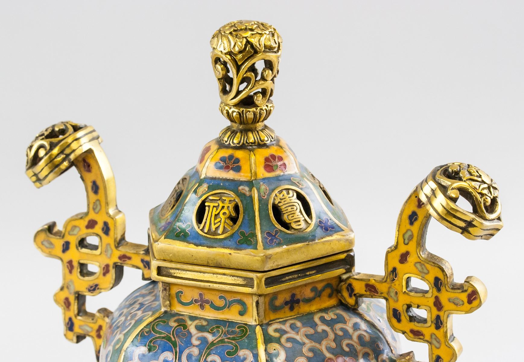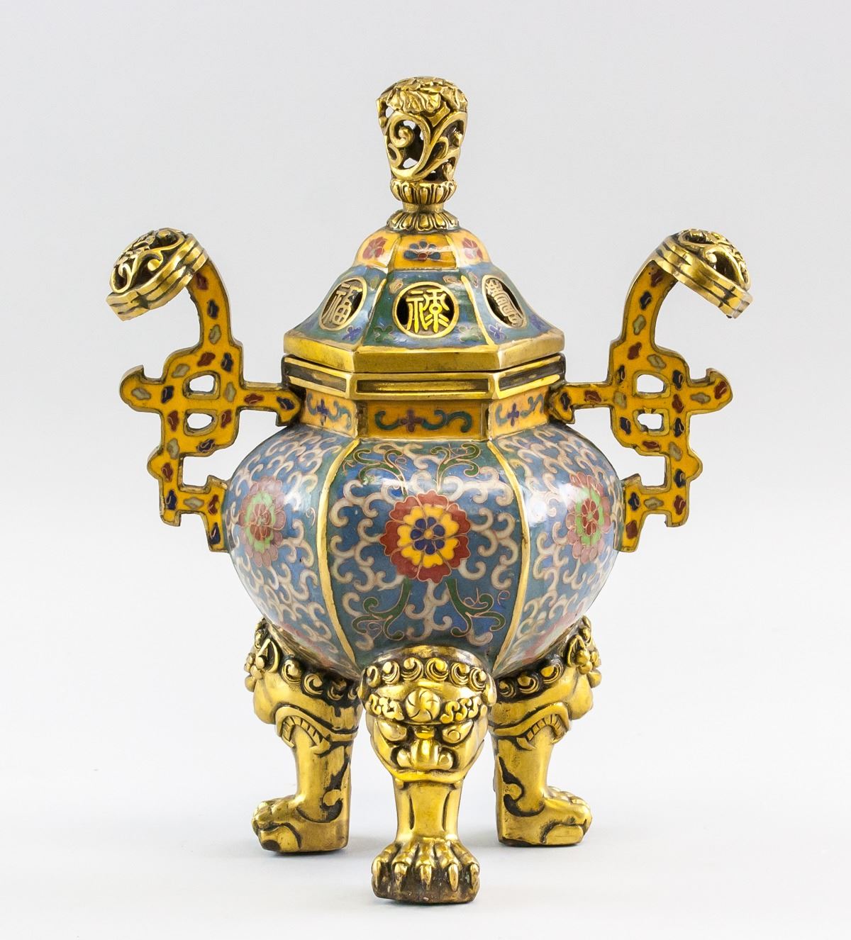Chinese cloisonne censer. Of lobed body, resting on three lion carved legs. Blue and white with flowers in the center of each lobed section. With two pronounced handles. Accompanied with hexagonal lid. Four character Ming dynasty Xuande mark on base. 31 x 22.5 cm, 2554 grams.