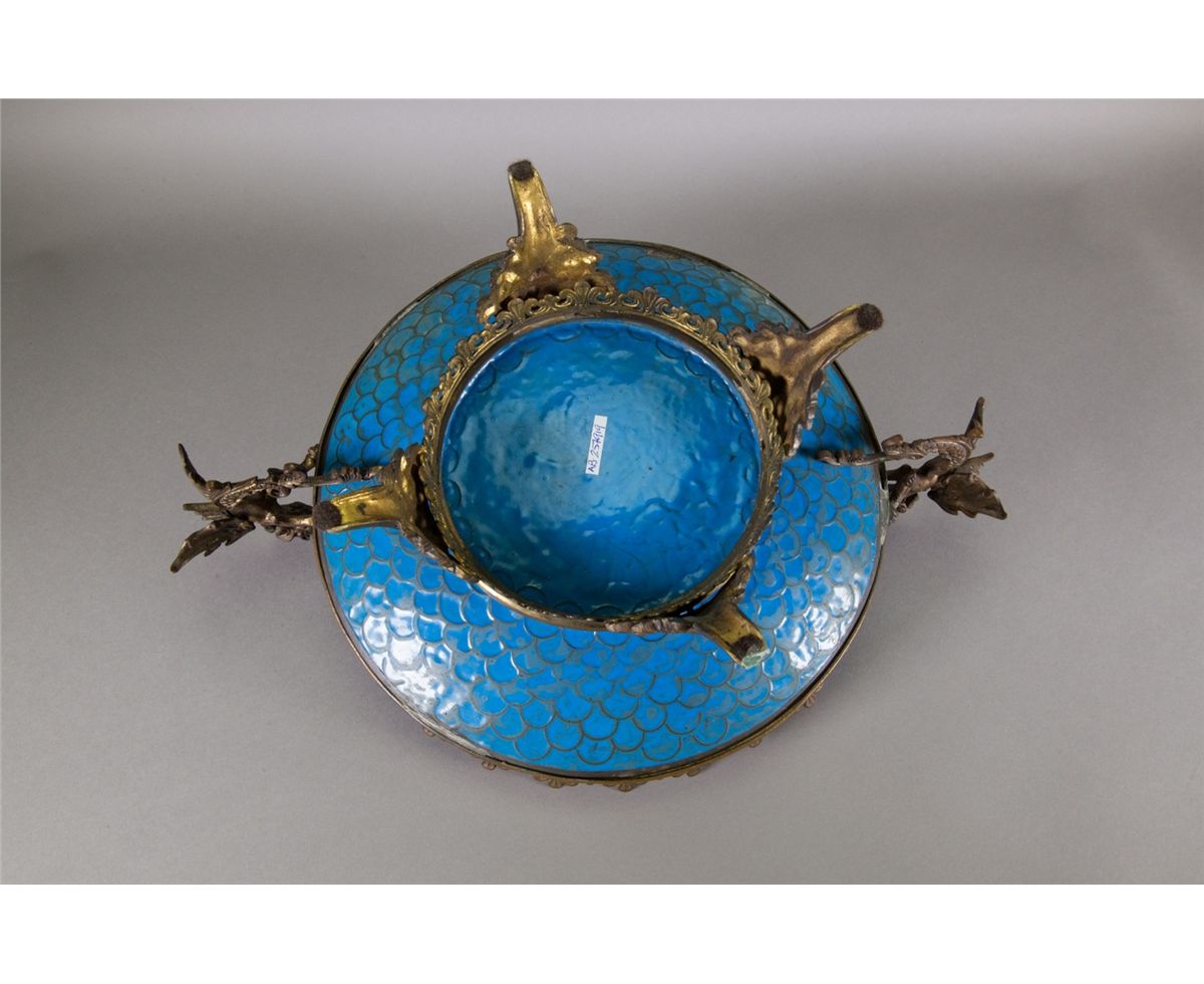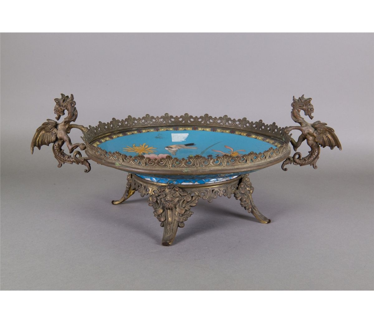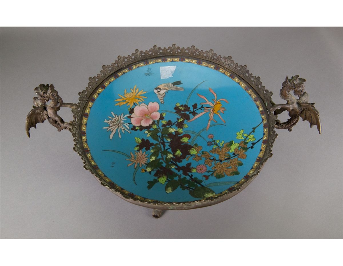 Chinese Cloisonne centre piece with bronze dragon handles; supported on three feet; featuring flower and bird in middle; H: 18 cm, D: 38 cm, 2268 grams