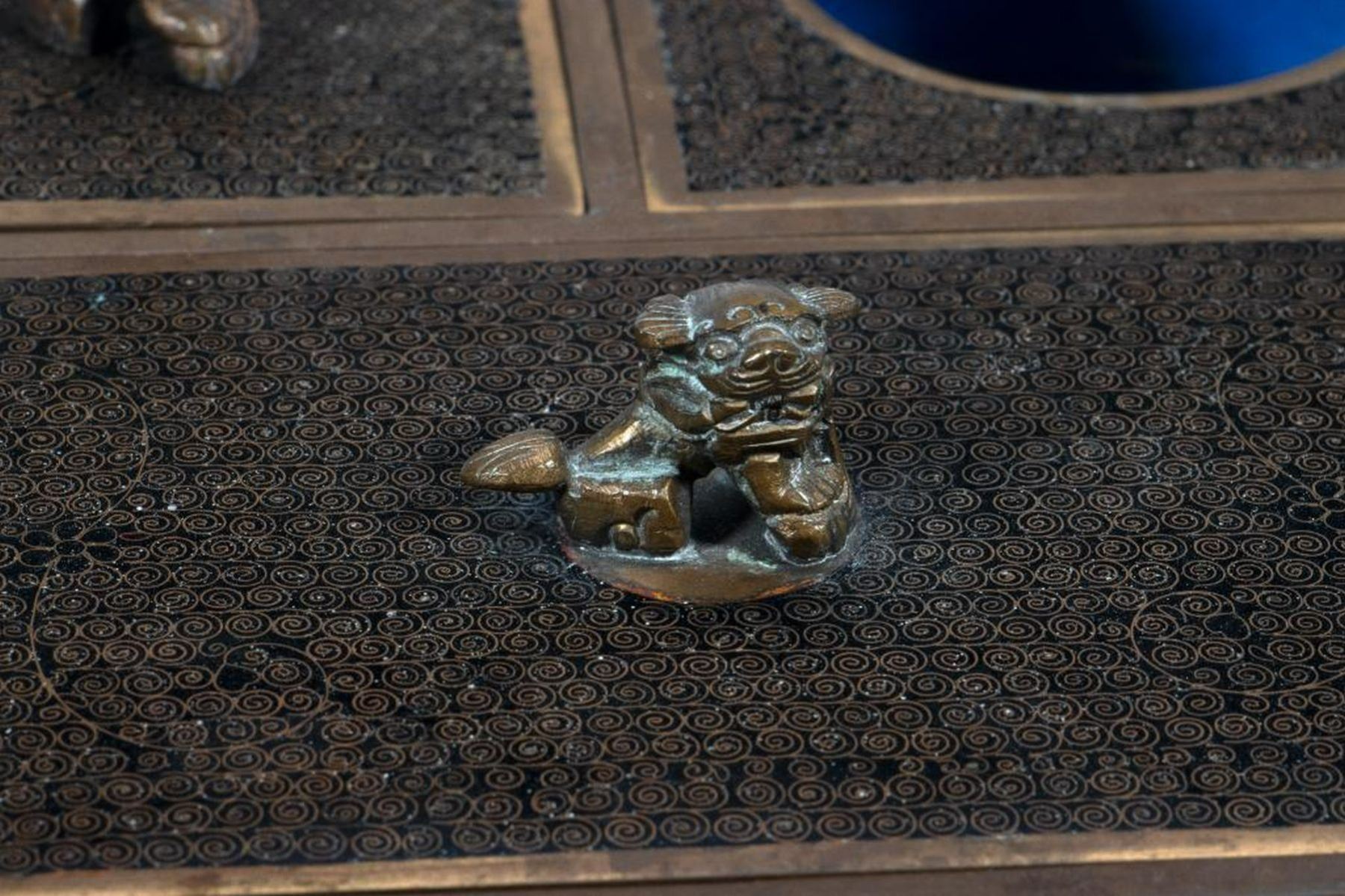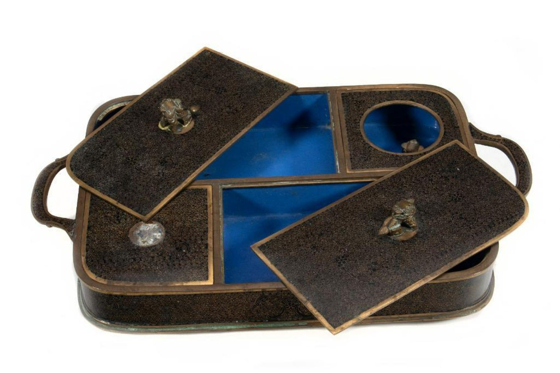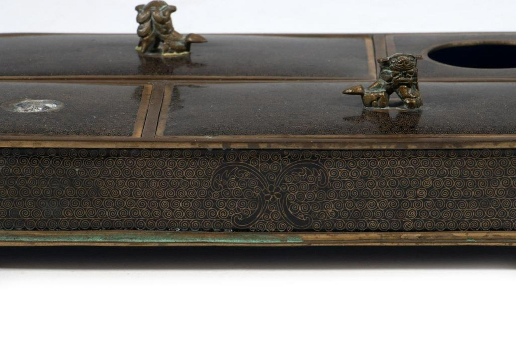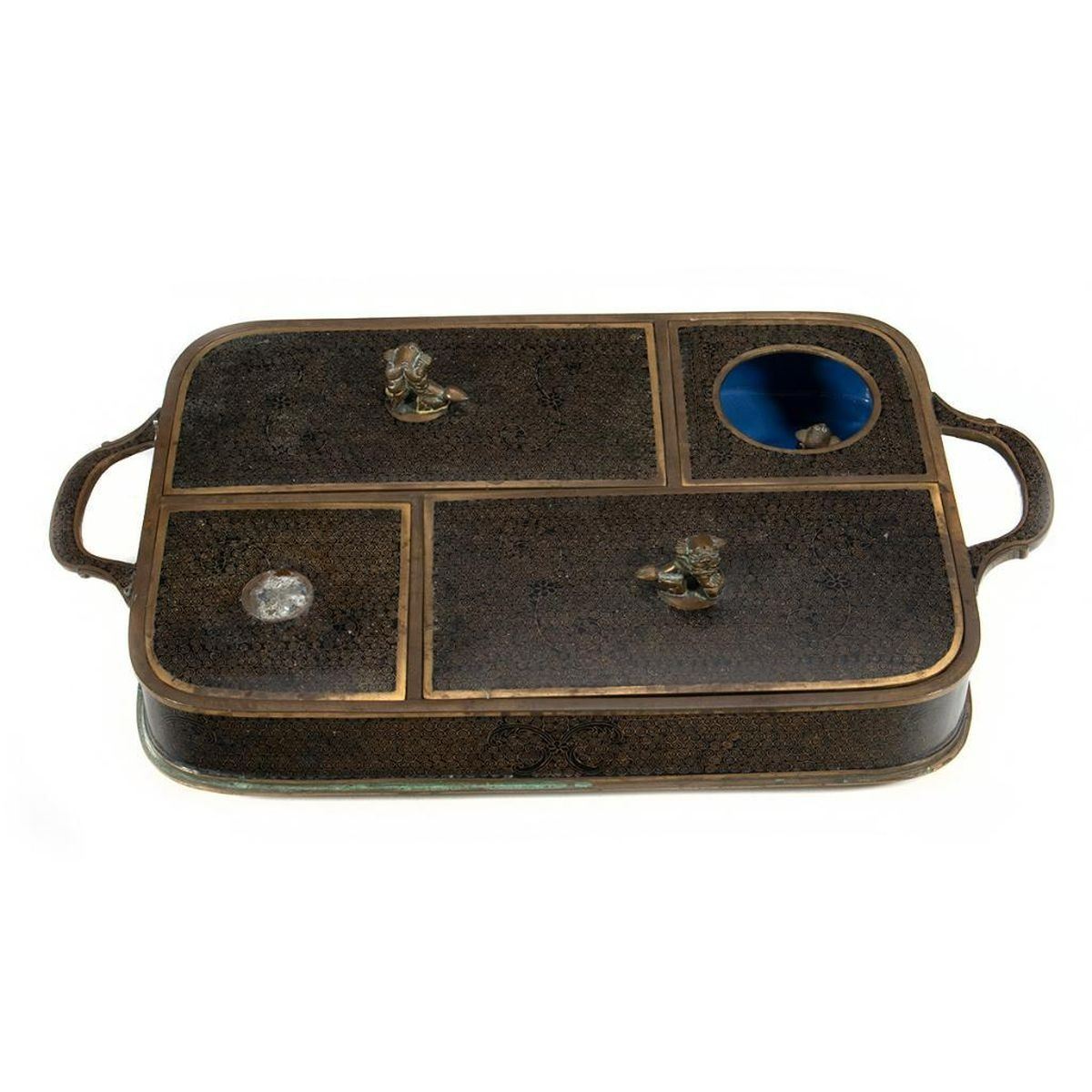 The divided sections with Fu Dog handles. 2in. h. 13 1/2in. l. 7 1/2in. w. Condition: One Fu Dog is detached.