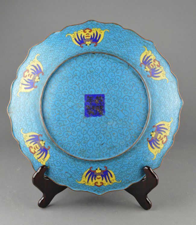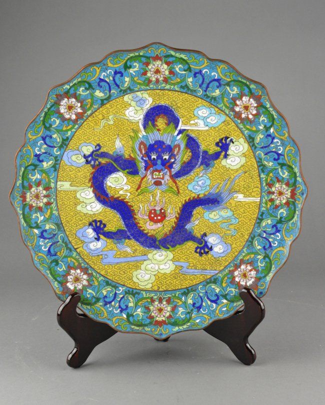 Chinese bronze cloisonne foliate-shaped rim; featuring dragon amid stylized ruyi-head cloud scrolls and flaming pearl; D: 36 cm, 1315 grams