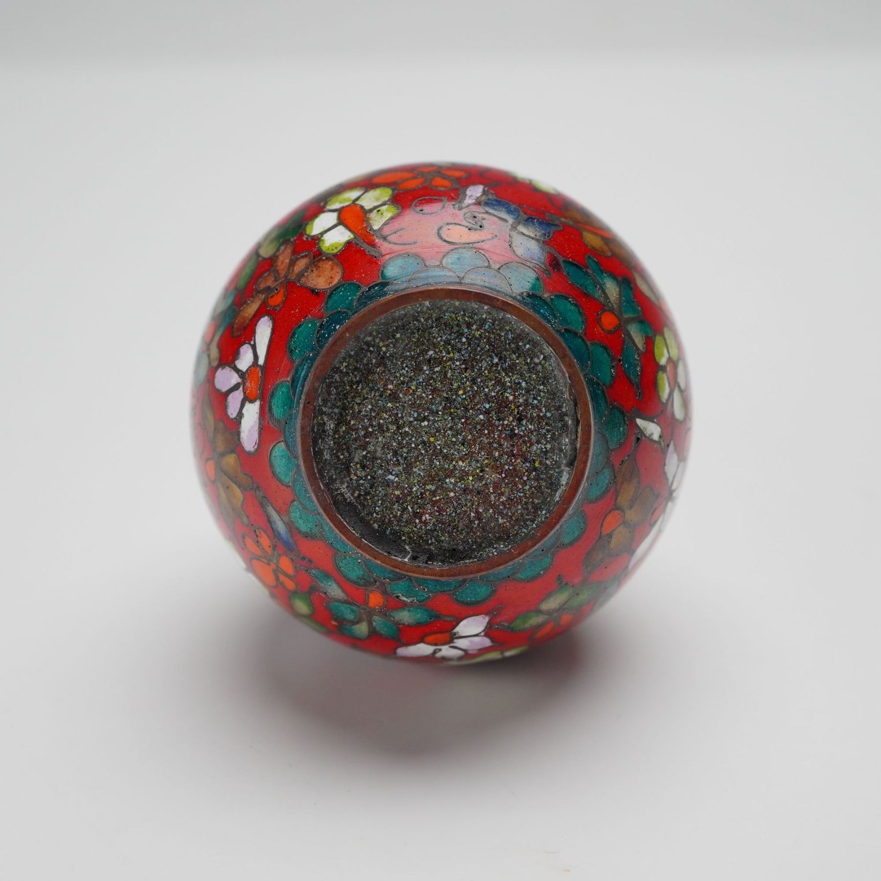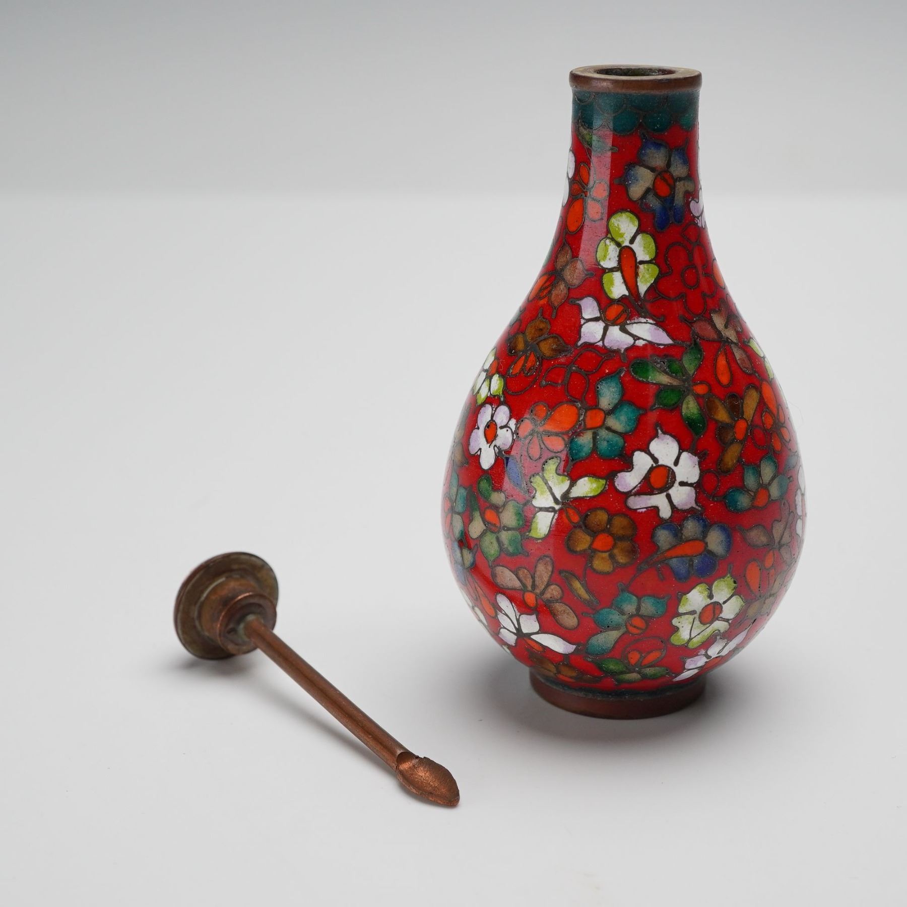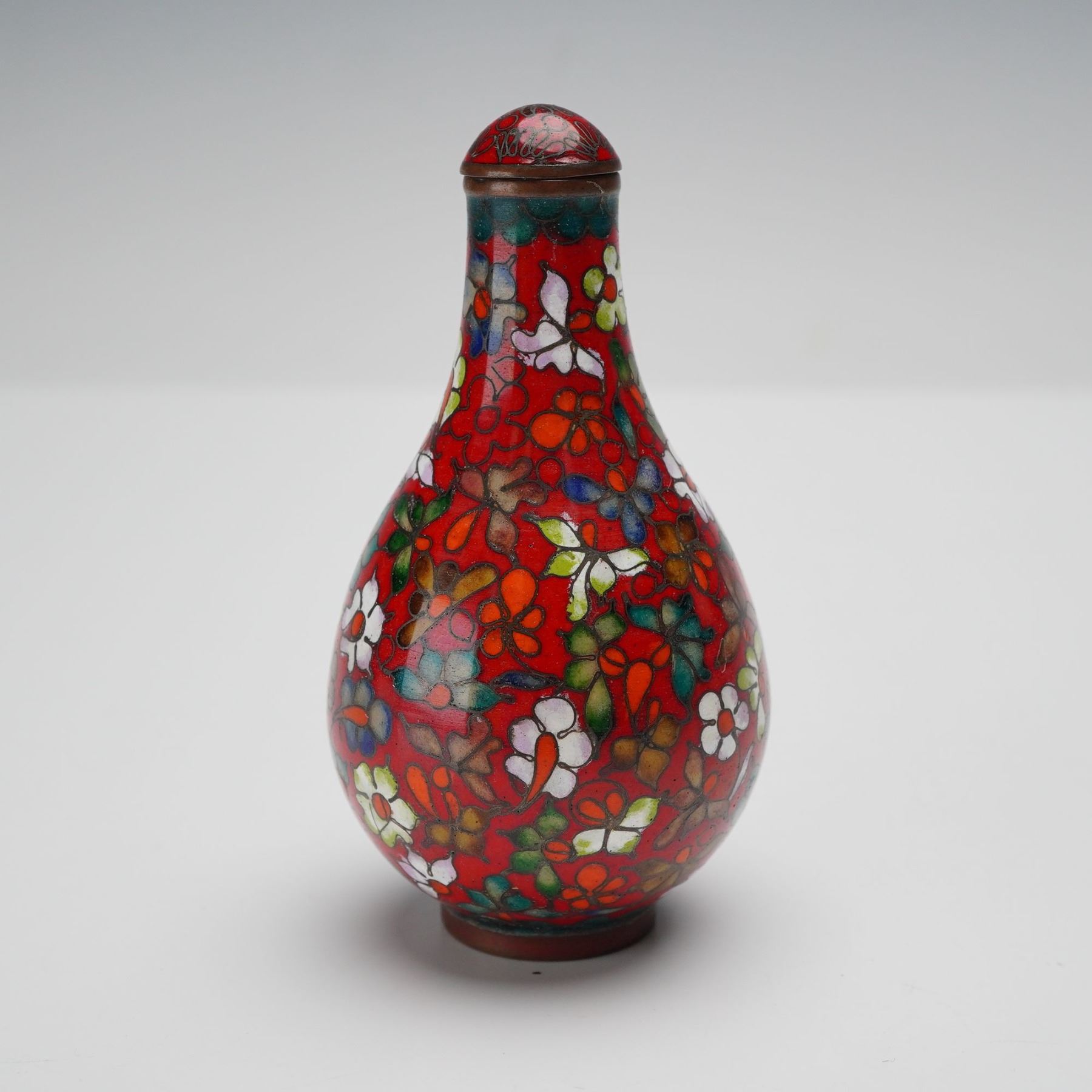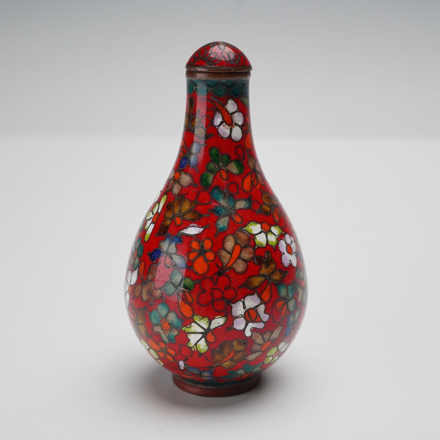 Colorful cloisonne snuff bottle with a vivid red ground and multicolored floral pattern. The piece includes a matching enamel-topped stopper with an attached metal spoon. A finely crafted decorative example of traditional Chinese enamel work.