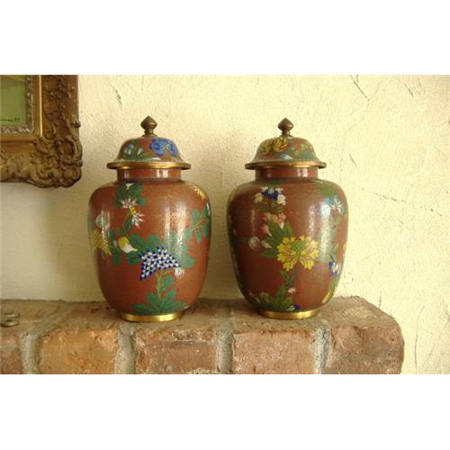 Pair of excellent covered cloissone urns.In perfect condition. 1930's as close as I can estimate, they maybe older.