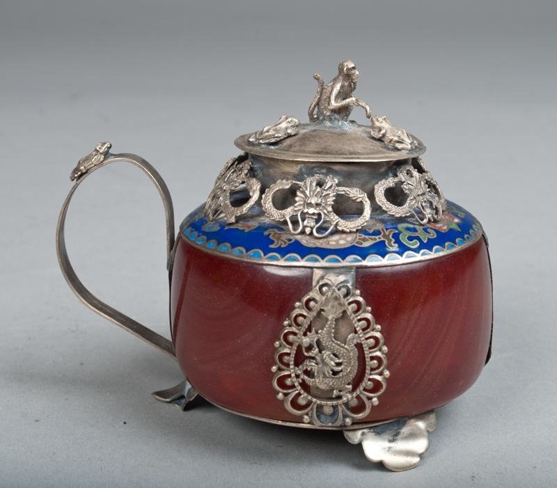 Hardstone body, neck decorated in cloisonne with silver metal mounts and monkey finial. 3.25" H, 20th century.