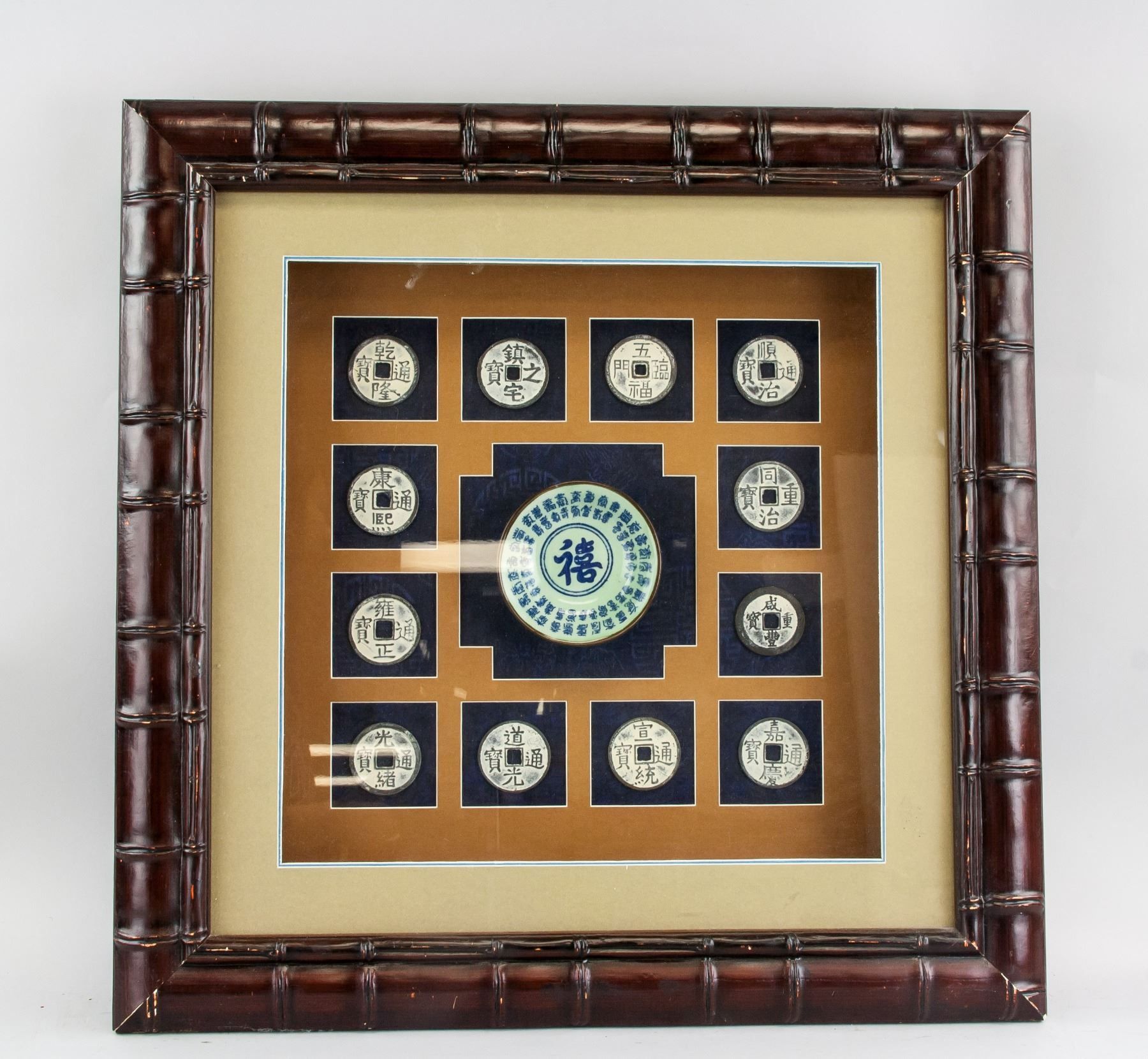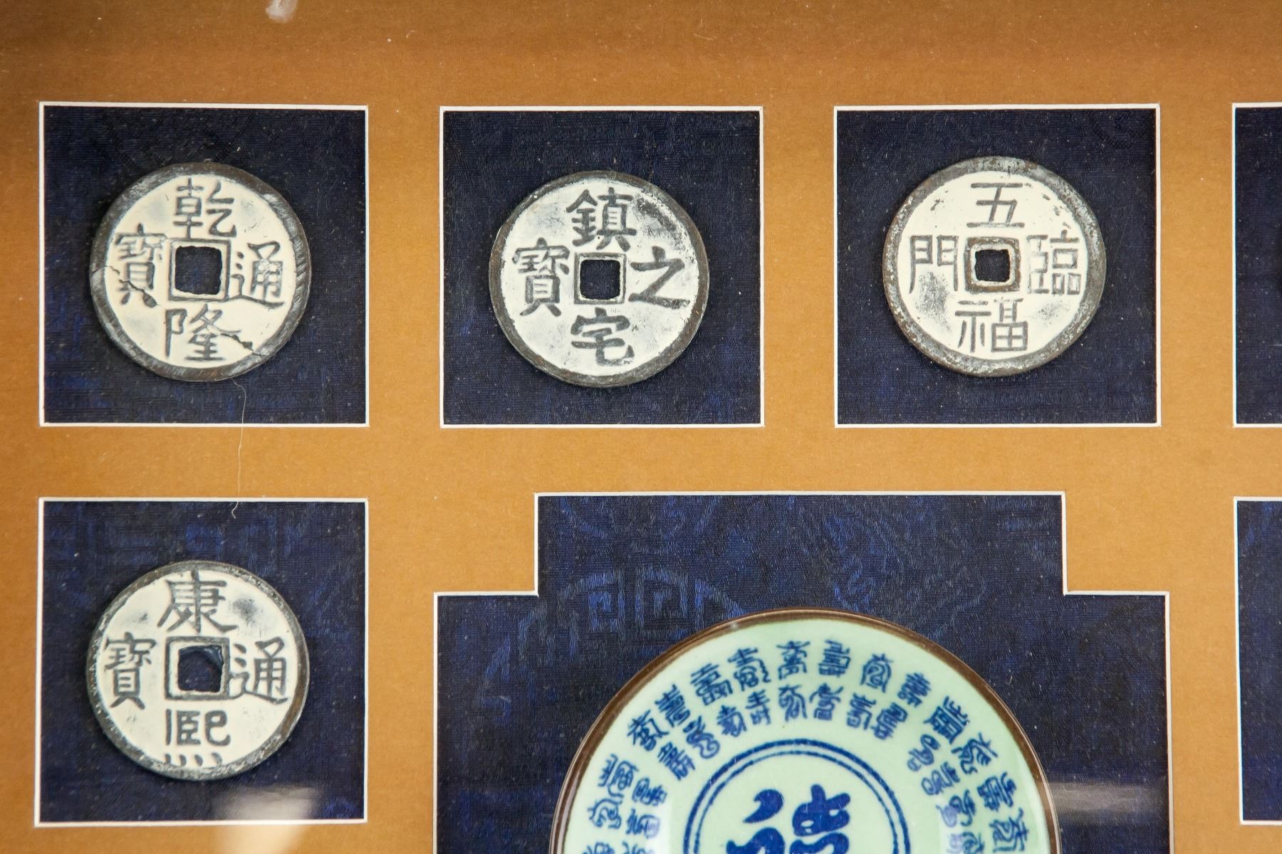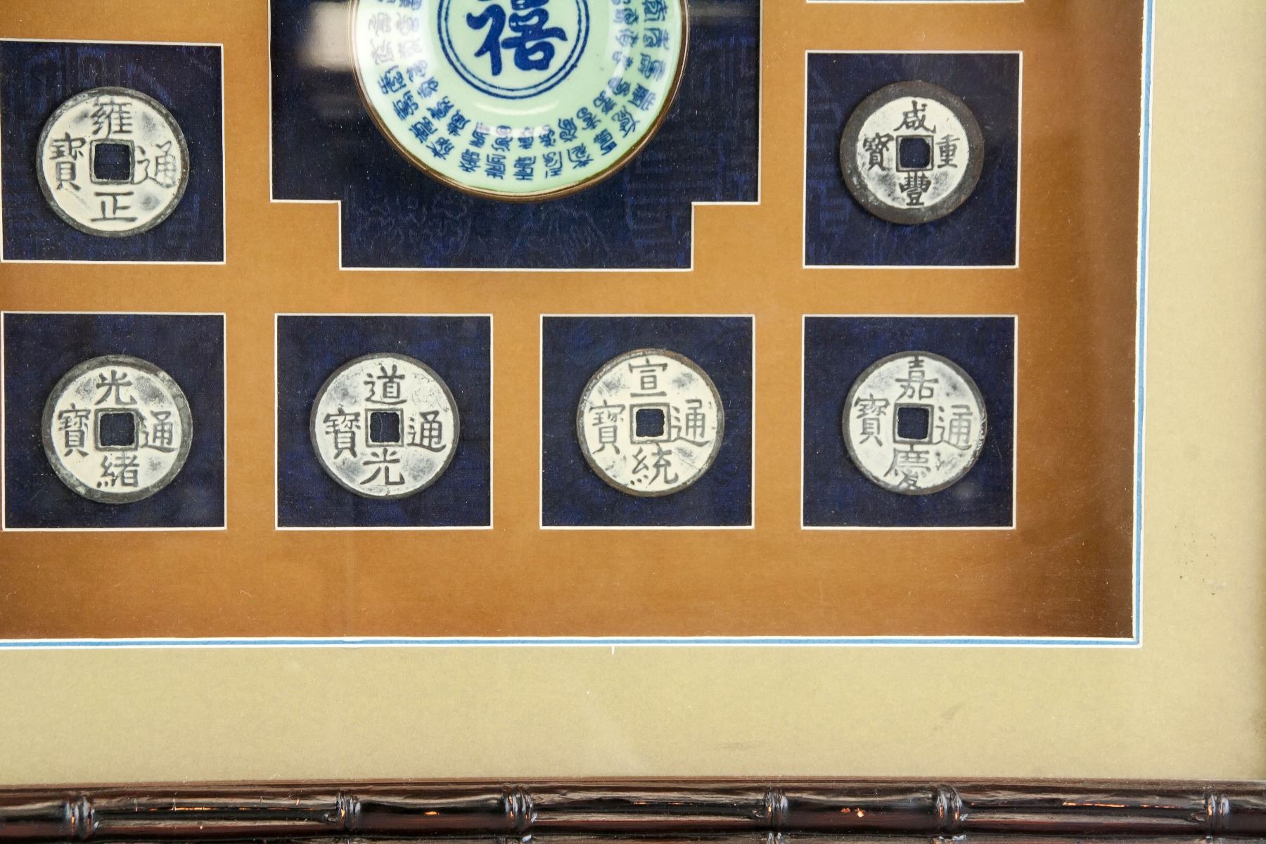 Framed blue and white export plate at the centre flanked by a set of 12 Chinese bronze coins including Shunzhi Tongbao, Tongzhi Zhongbao, Xianfeng Zhongbao, Kangxi Tongbao, Yongzheng Tongbao, Qianlong Tongbao, Jiaqing Tongbao, Daoguang Tongbao and Xuantong Tongbao, Zhenzhai Zhibao, Wufu Lingmen; framed; 35 cm x 35 cm