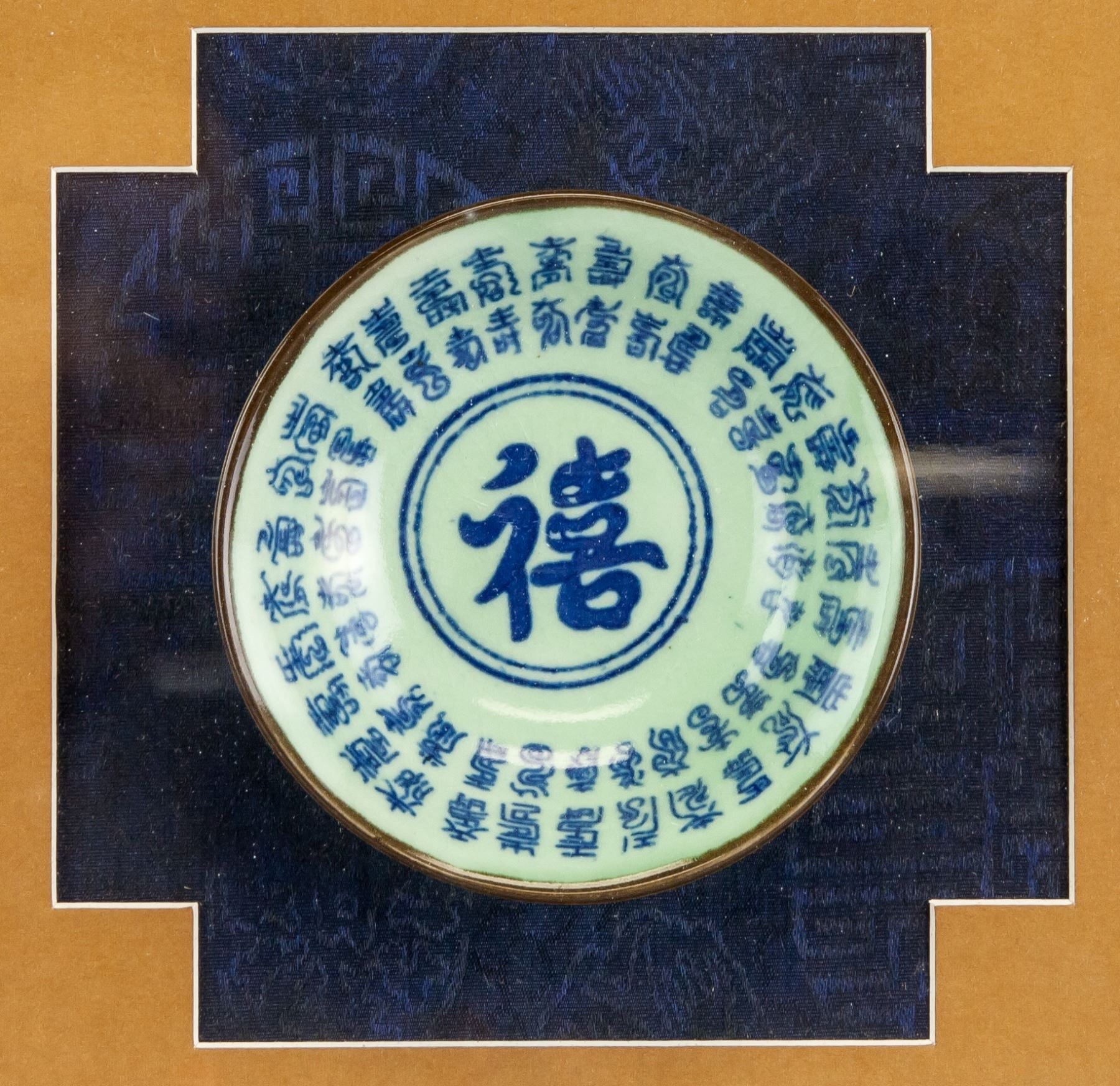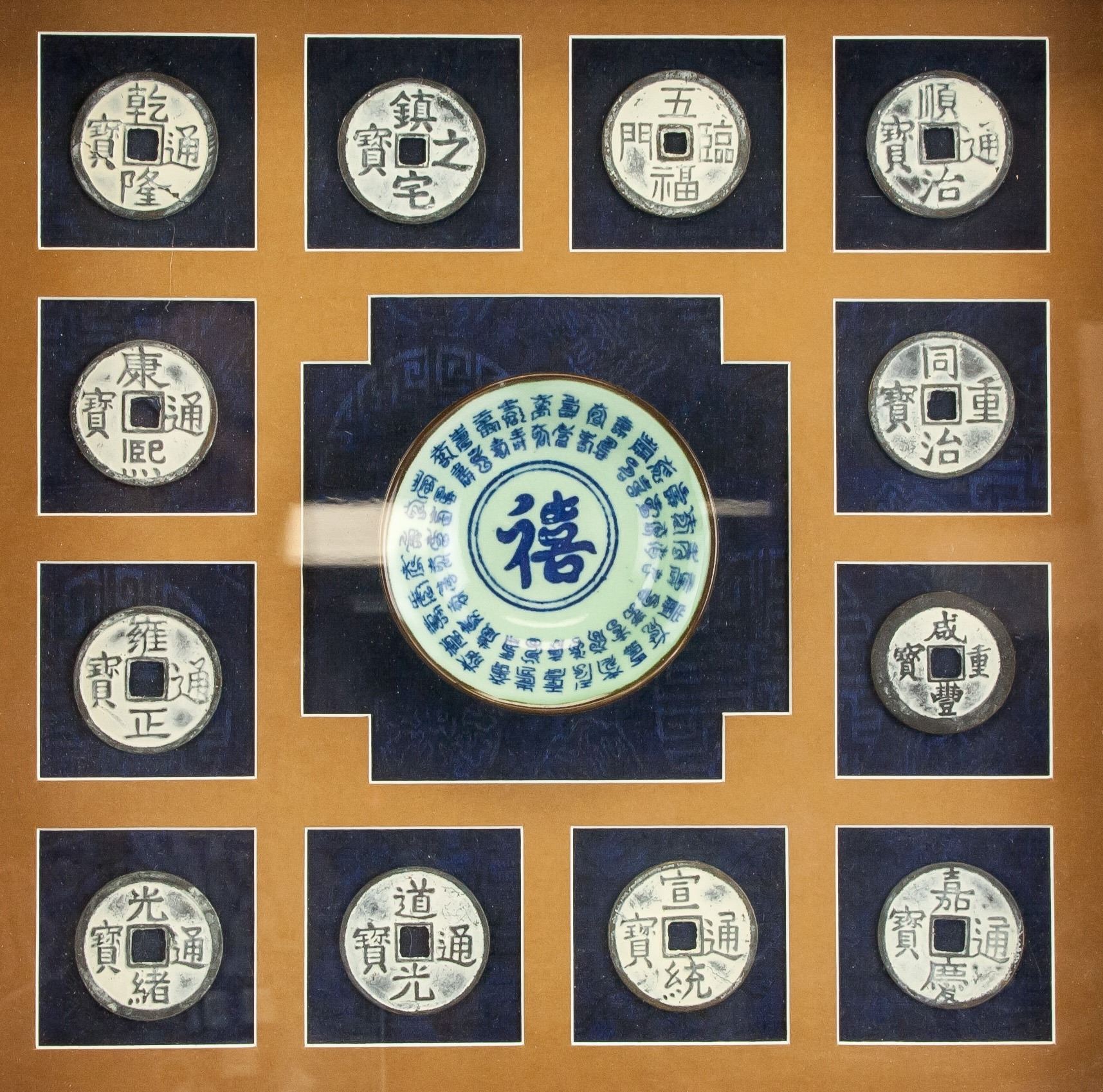 Framed blue and white export plate at the centre flanked by a set of 12 Chinese bronze coins including Shunzhi Tongbao, Tongzhi Zhongbao, Xianfeng Zhongbao, Kangxi Tongbao, Yongzheng Tongbao, Qianlong Tongbao, Jiaqing Tongbao, Daoguang Tongbao and Xuantong Tongbao, Zhenzhai Zhibao, Wufu Lingmen; framed; 35 cm x 35 cm