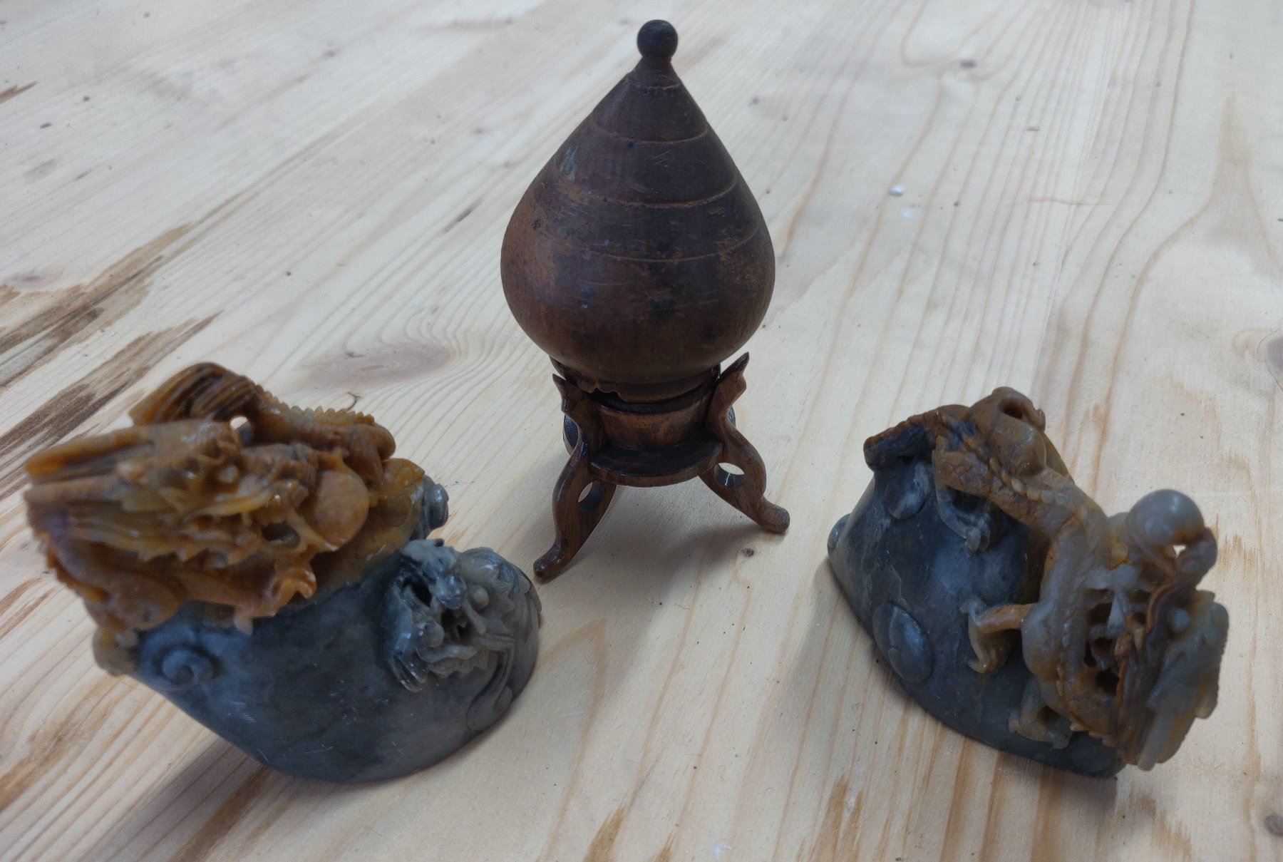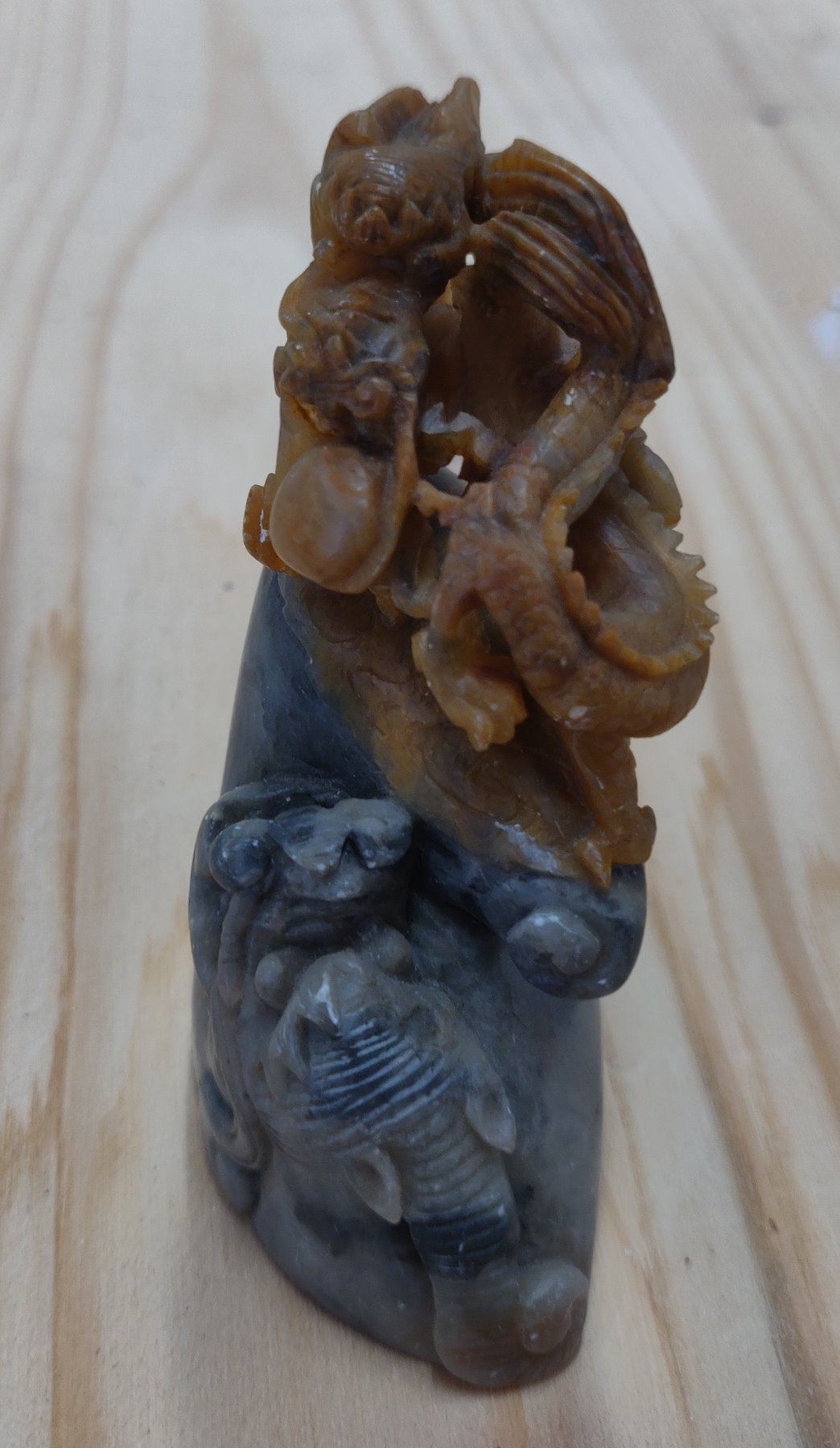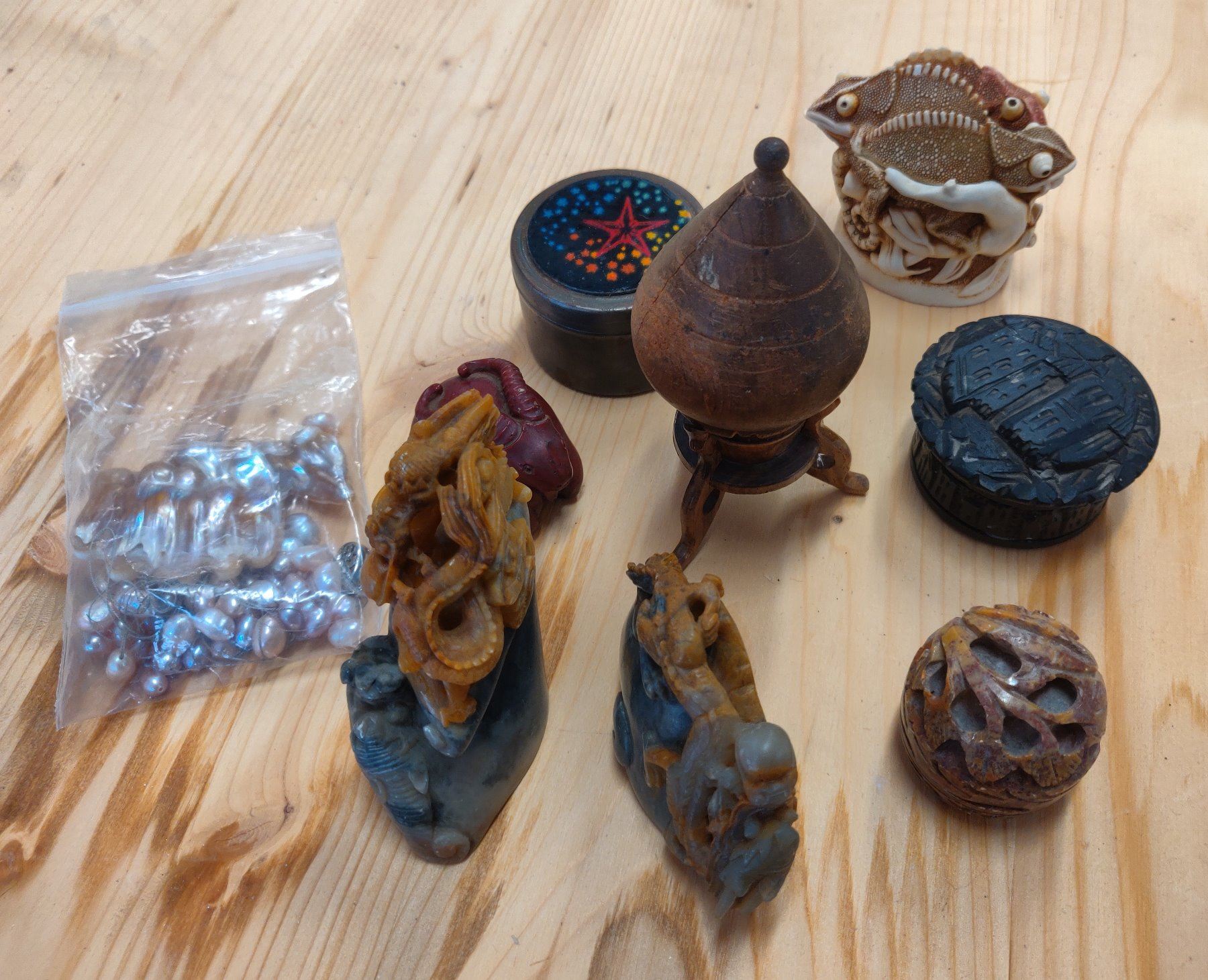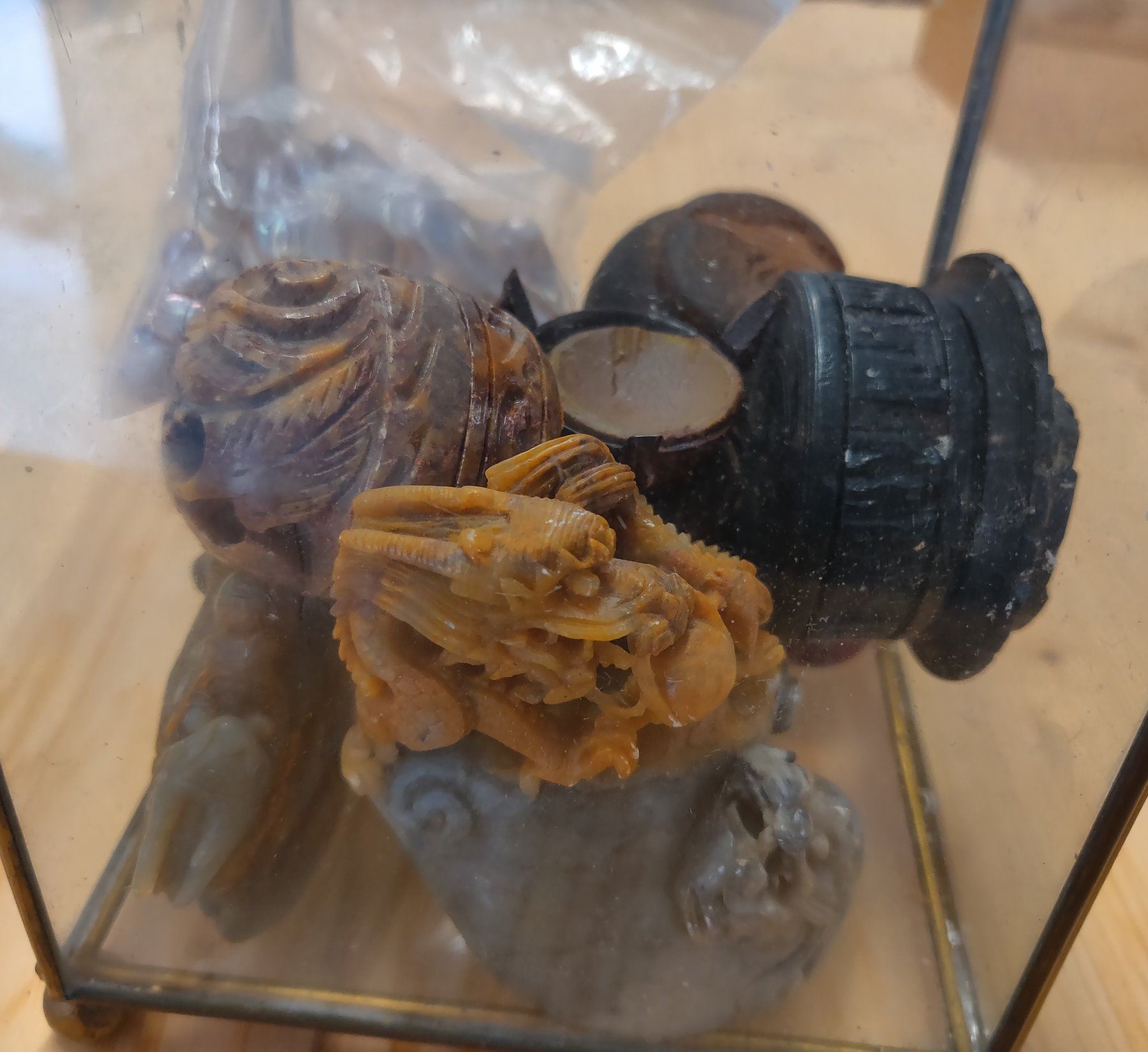 Chinese Collection, 20th century items. Made of jade, plastic, soapstone and wood, the largest measures 3 1/2". China, Japan. 8 pieces in total, box not included. Condition: Good, see images. Shipping: $30.00 w/insurance and signature, due to value.