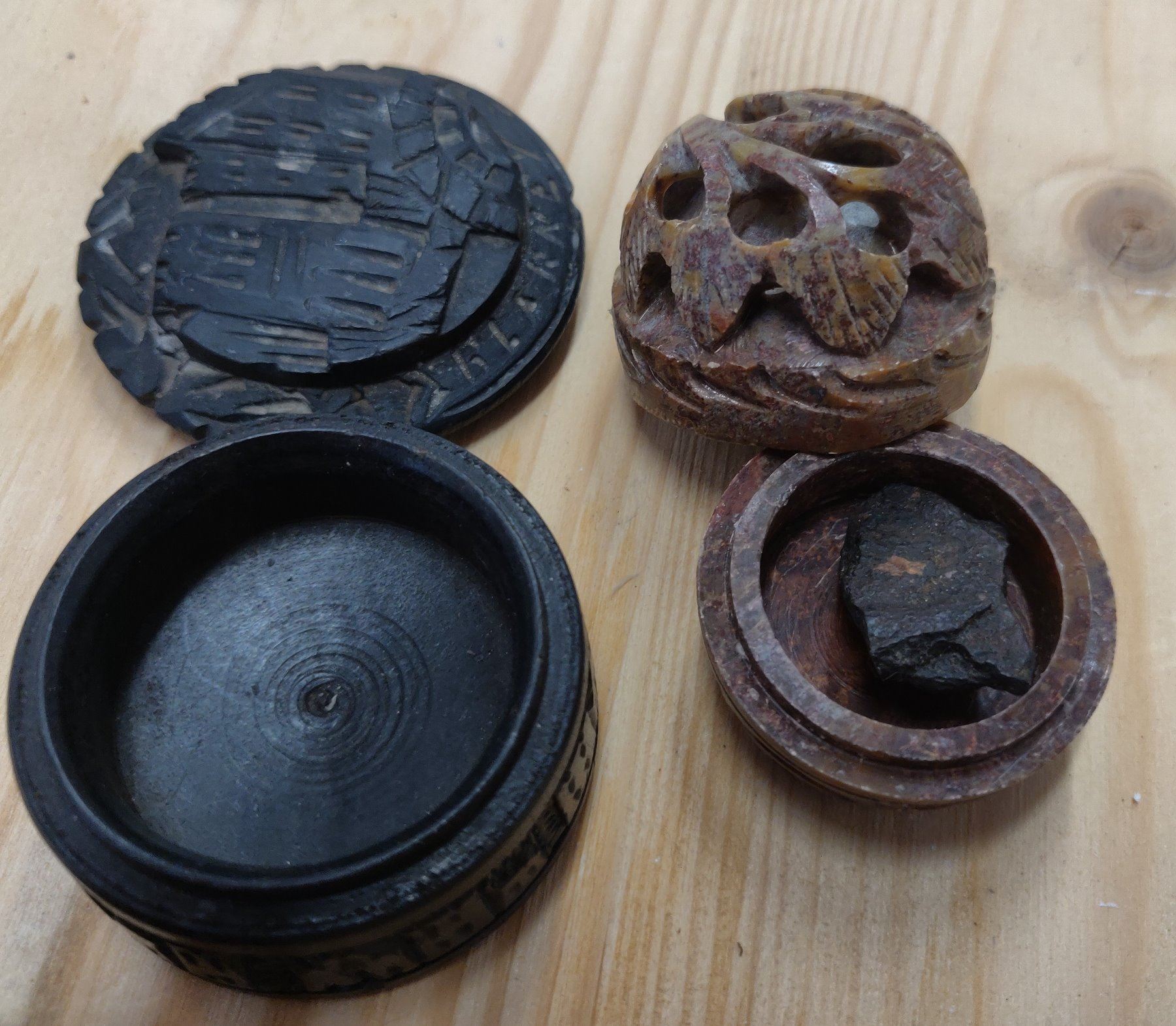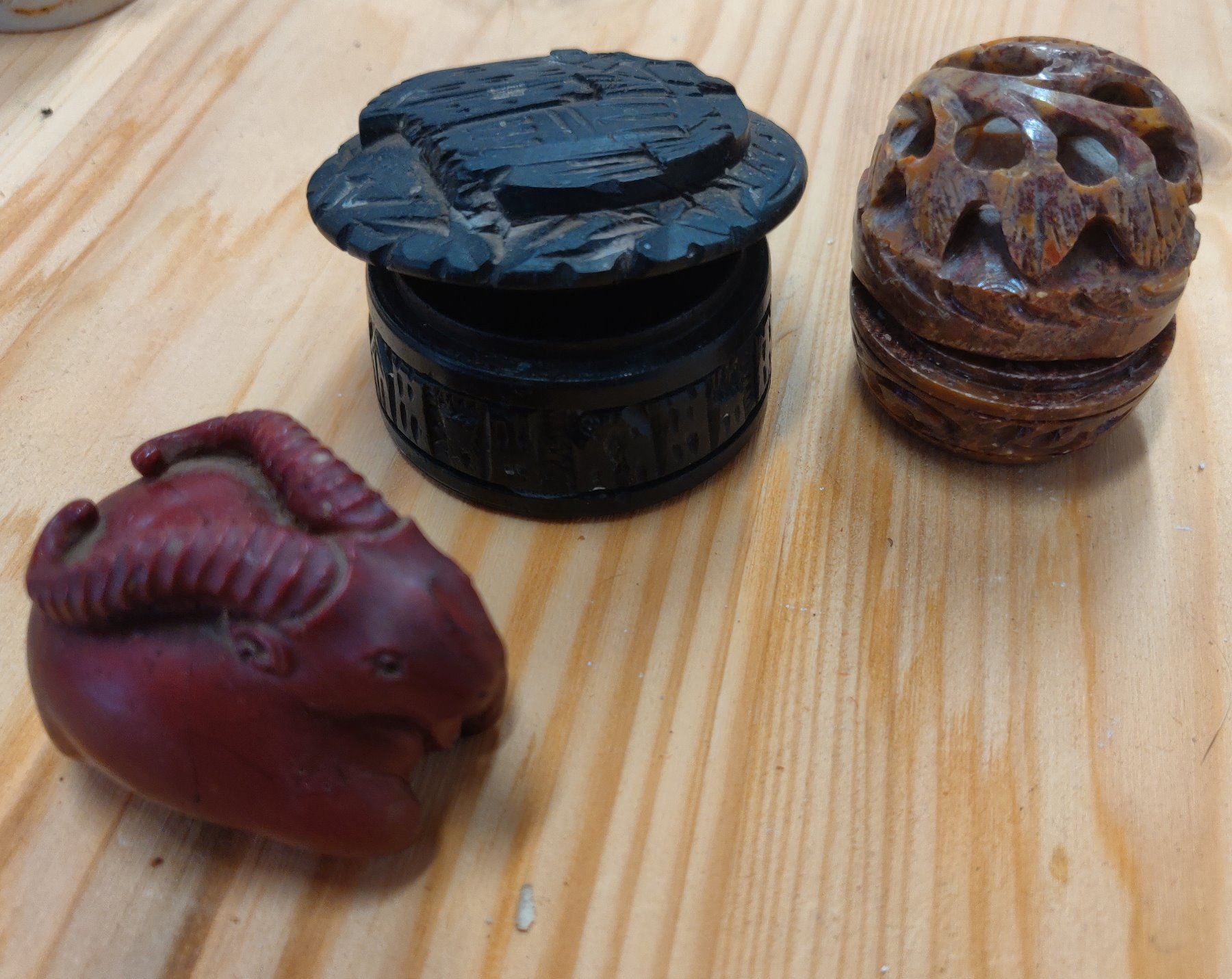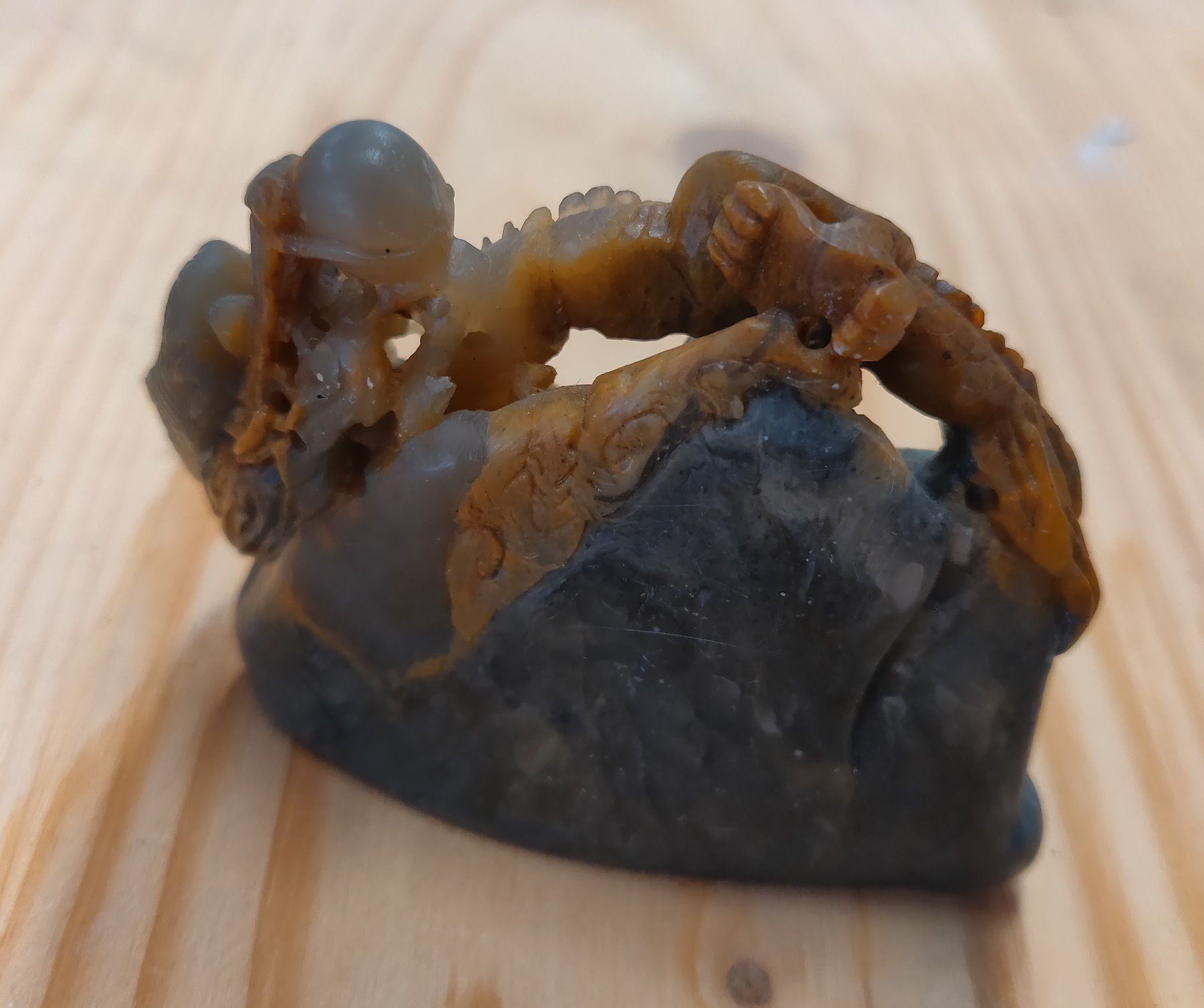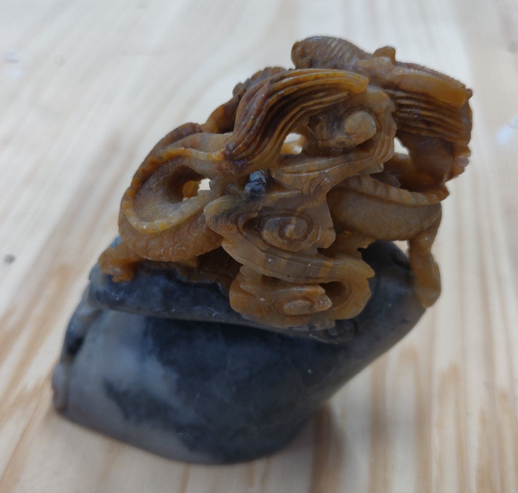 Chinese Collection, 20th century items. Made of jade, plastic, soapstone and wood, the largest measures 3 1/2". China, Japan. 8 pieces in total, box not included. Condition: Good, see images. Shipping: $30.00 w/insurance and signature, due to value.