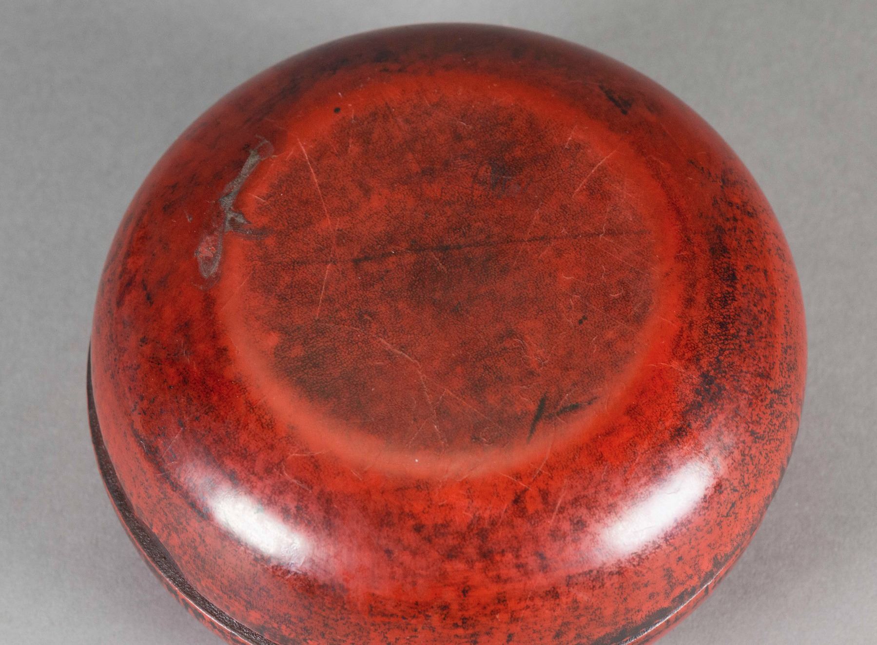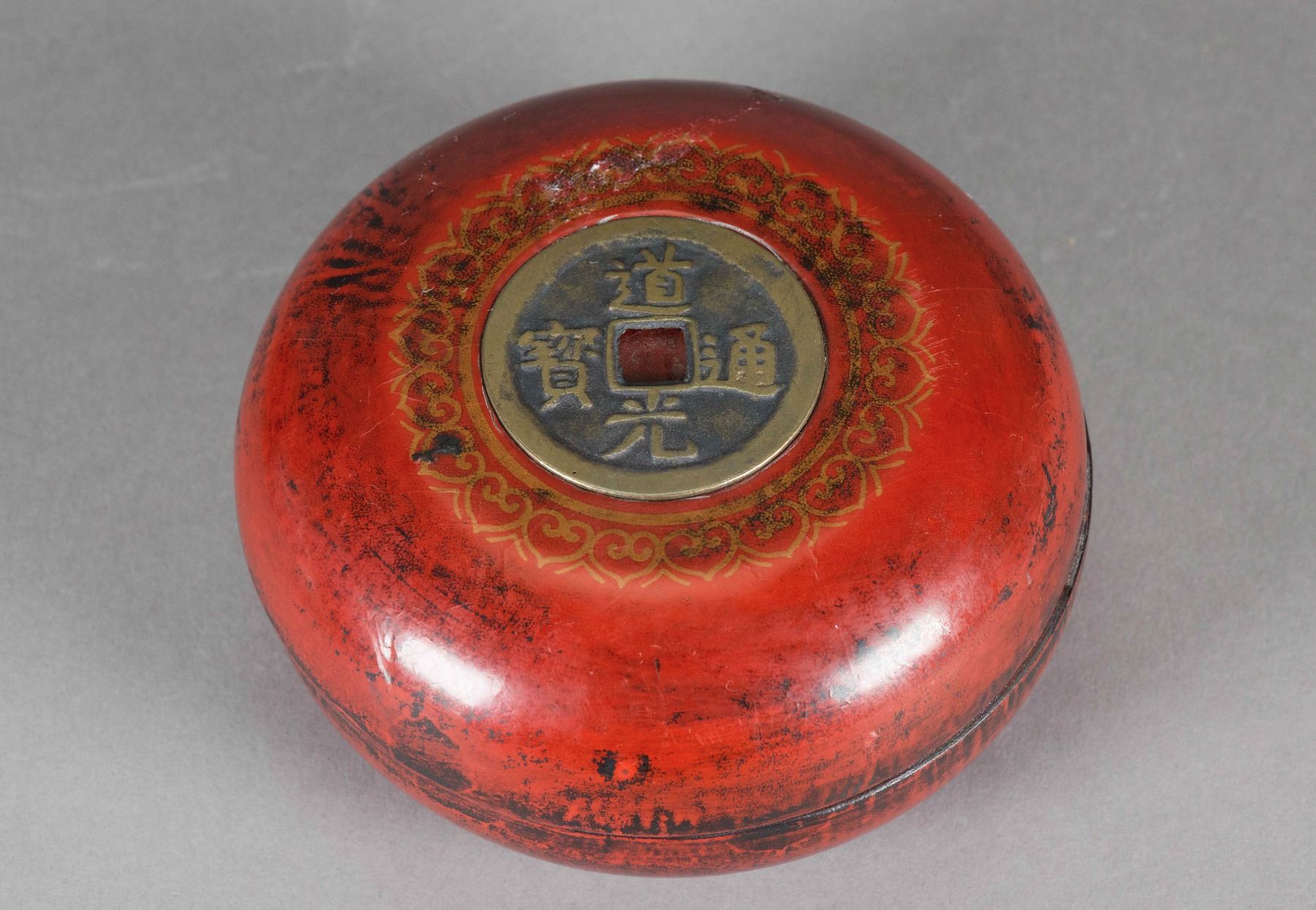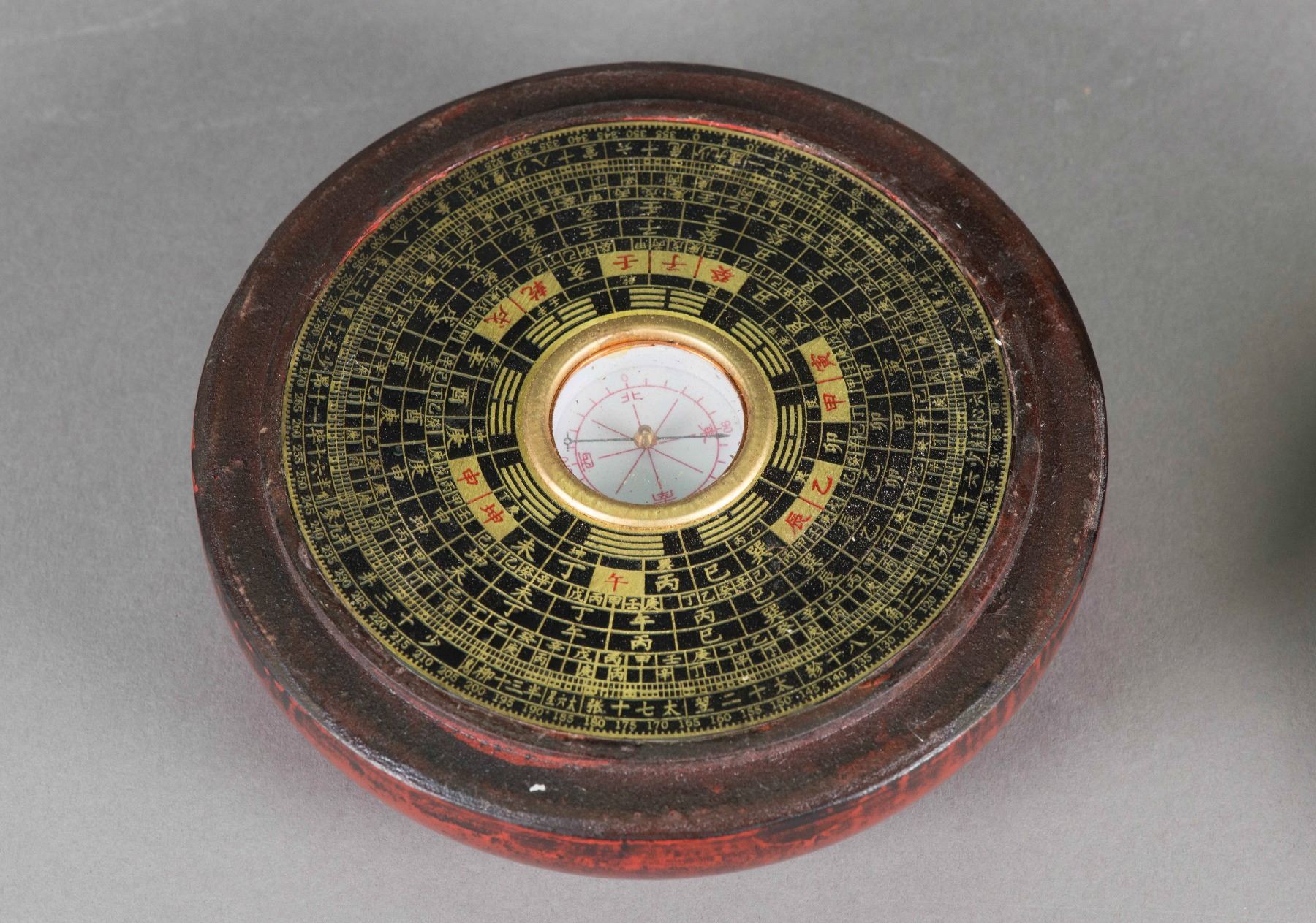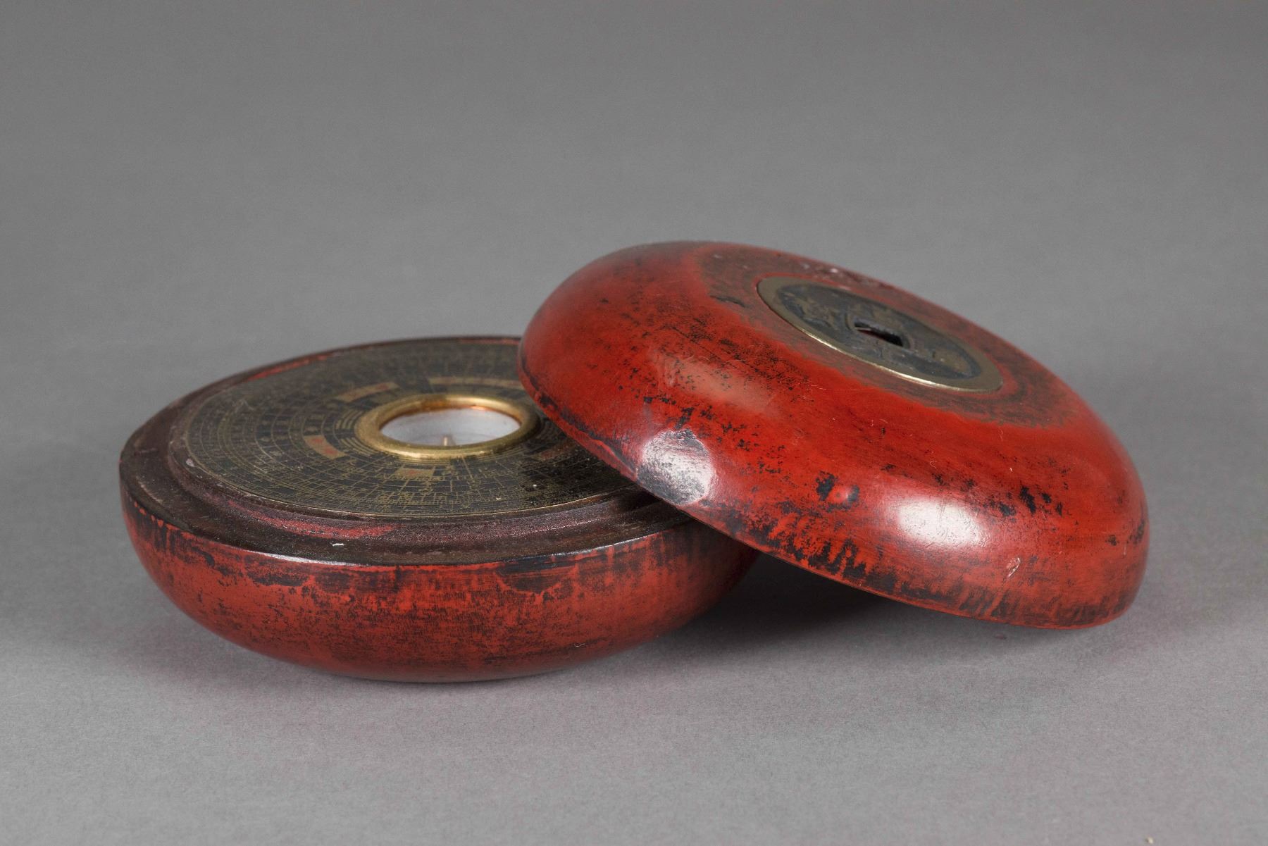 Chinese compass with red lacquer case; the lid with a Dao Guang Tong Bao coin inset; the compass includes Chinese sexagenary cycle and celestial stem; H: 5.5 cm, D: 11.5 cm, 417 grams