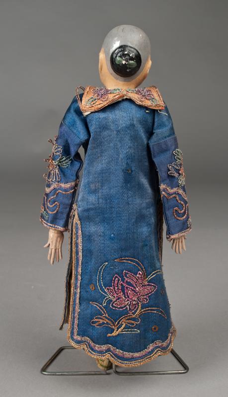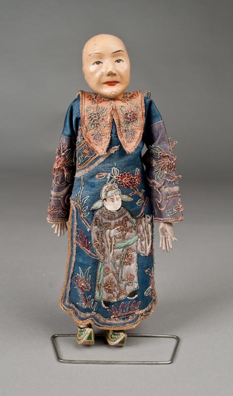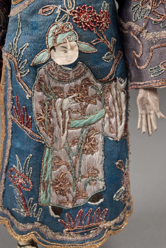 With hand painted details, hand sewn robe with figures, displayed on metal stand, 10"H, circa 1900