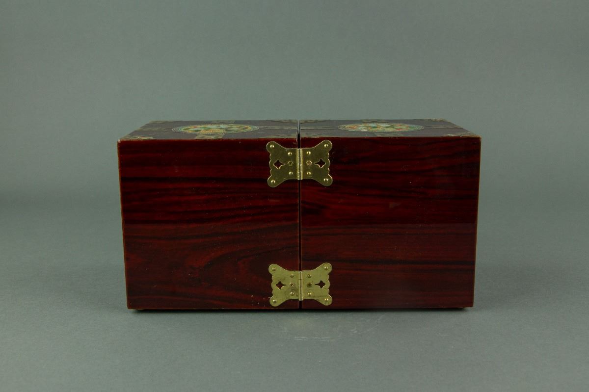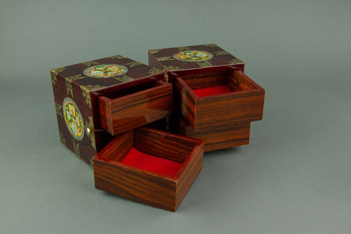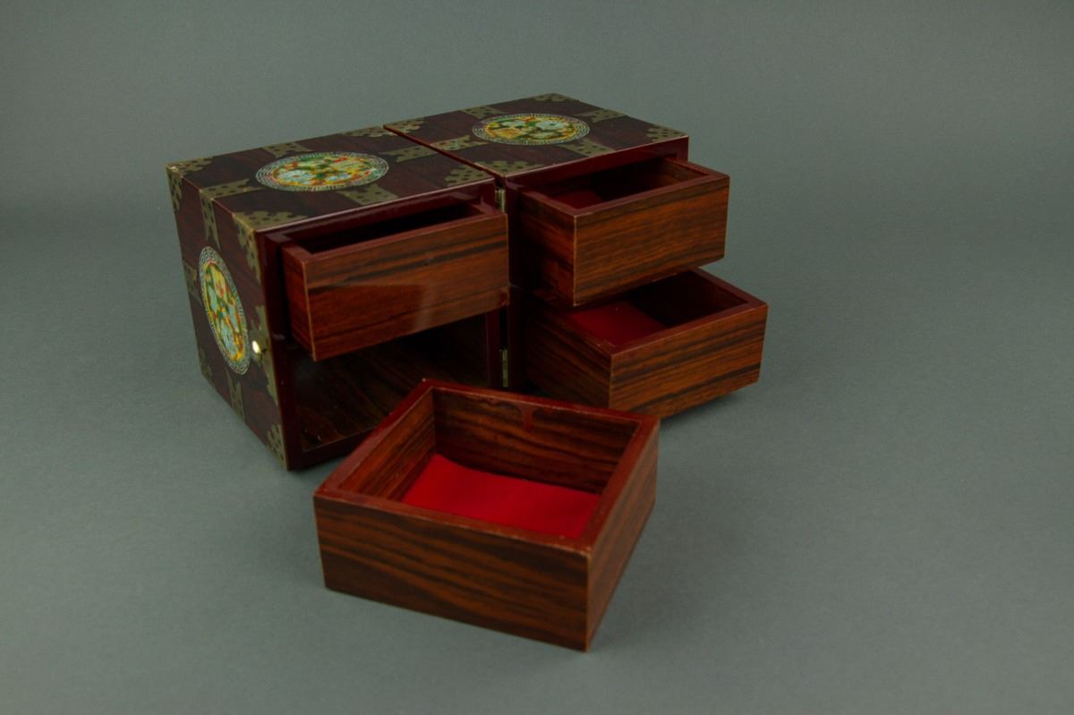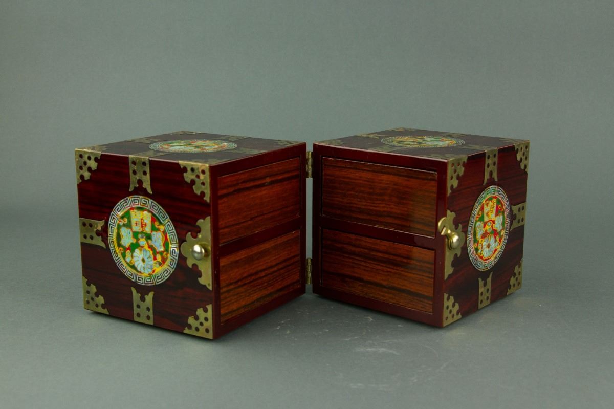 Chinese wooden jewellery box; comprised by two conjoint square sections with four hidden drawers; H: 13 cm, W; 24 cm, 1368 grams