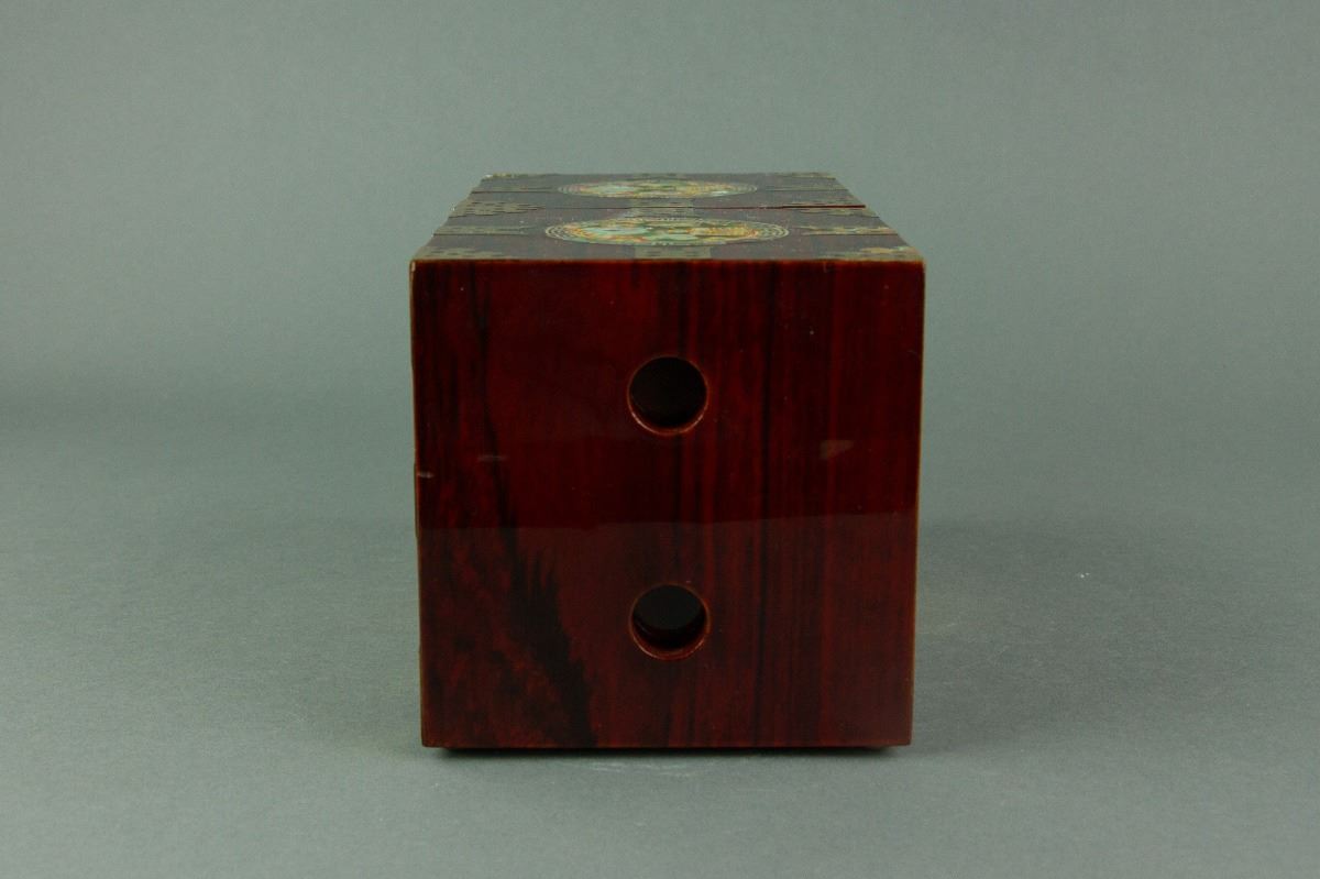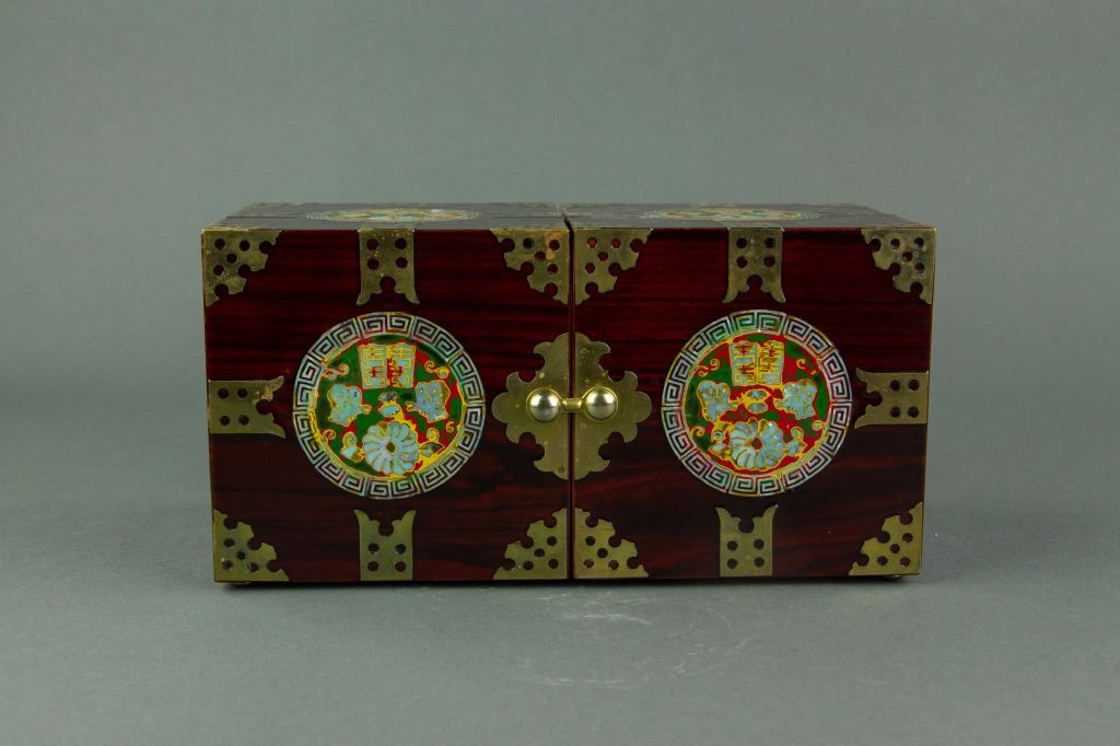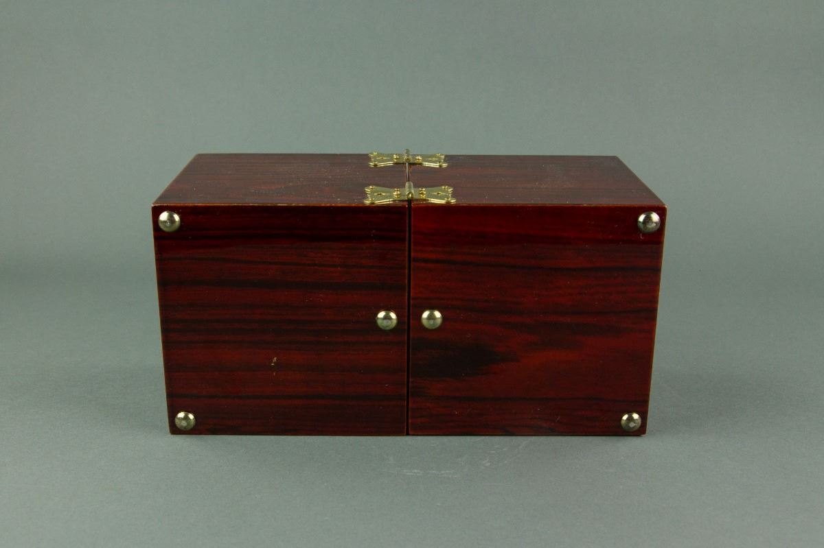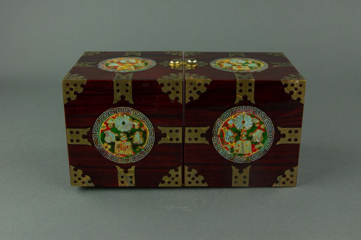 Chinese wooden jewellery box; comprised by two conjoint square sections with four hidden drawers; H: 13 cm, W; 24 cm, 1368 grams