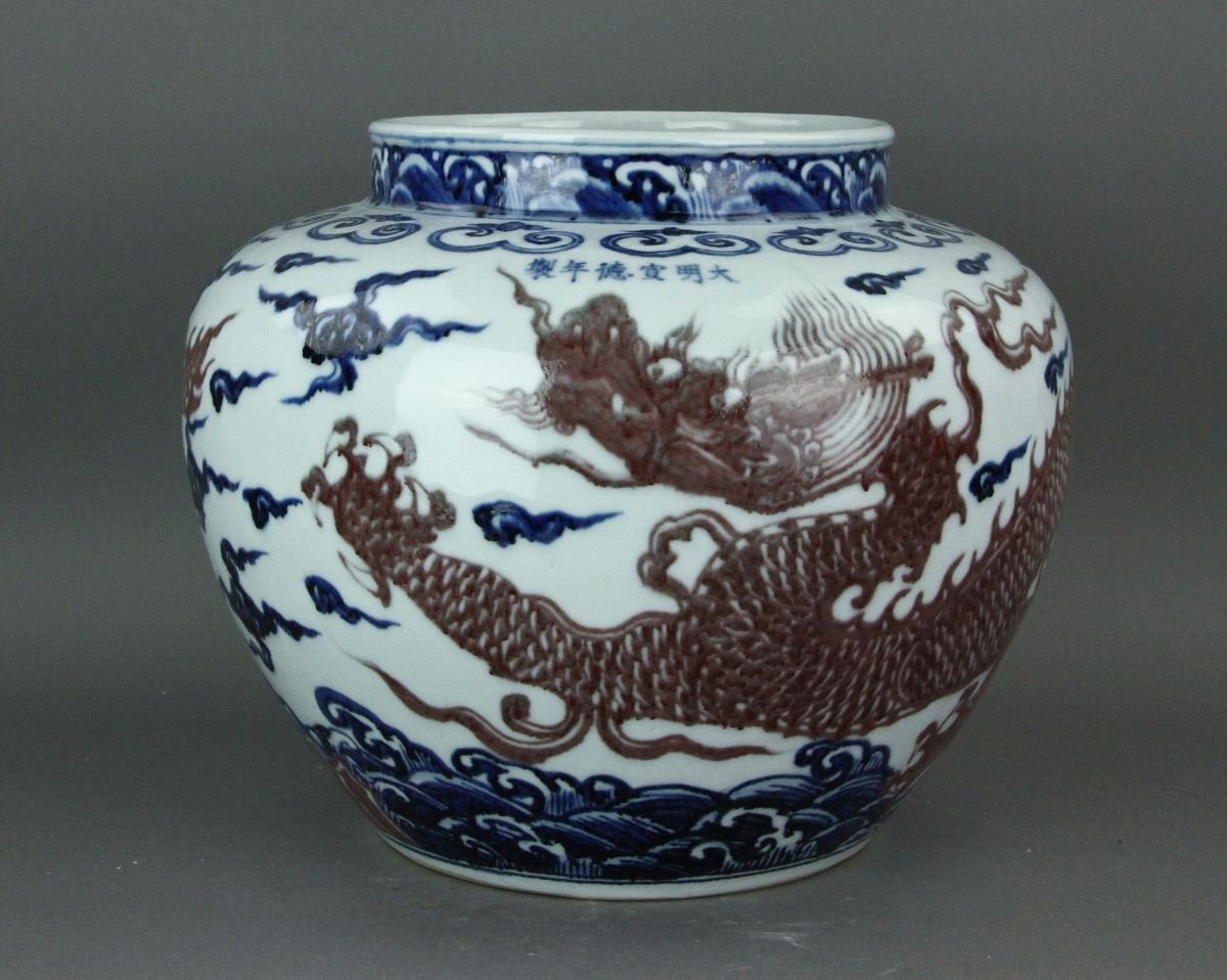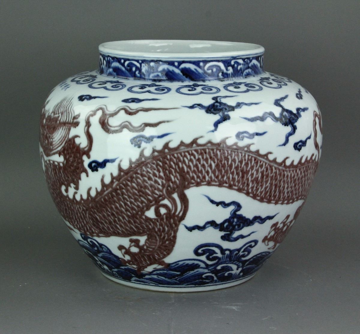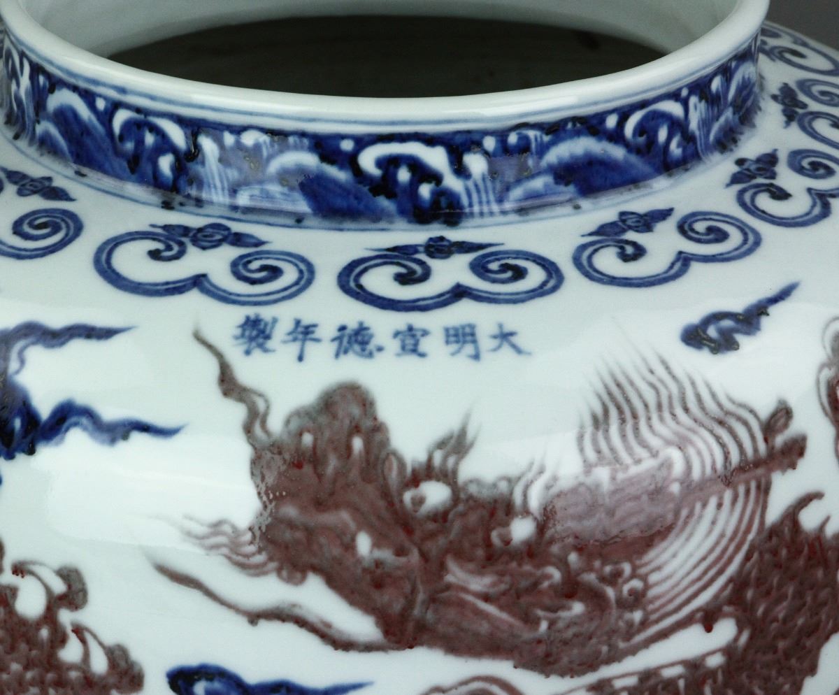 Chinese copper red blue and white porcelain jar; of globular body tapering to the base; featuring five-clawed dragon amidst clouds; six-character Xuande mark on shoulder; H: 28 cm, D: 20 cm, 6 kg