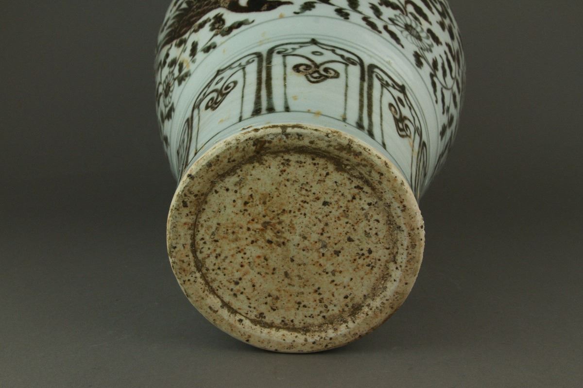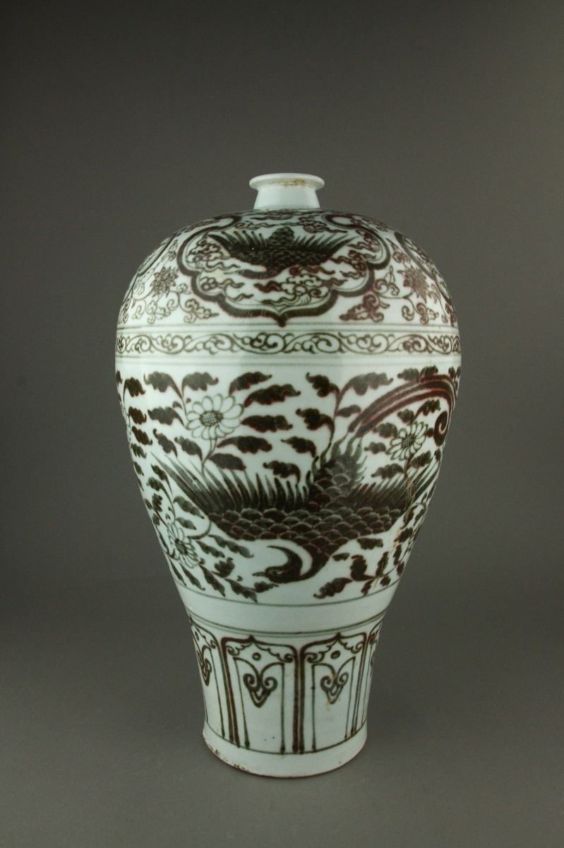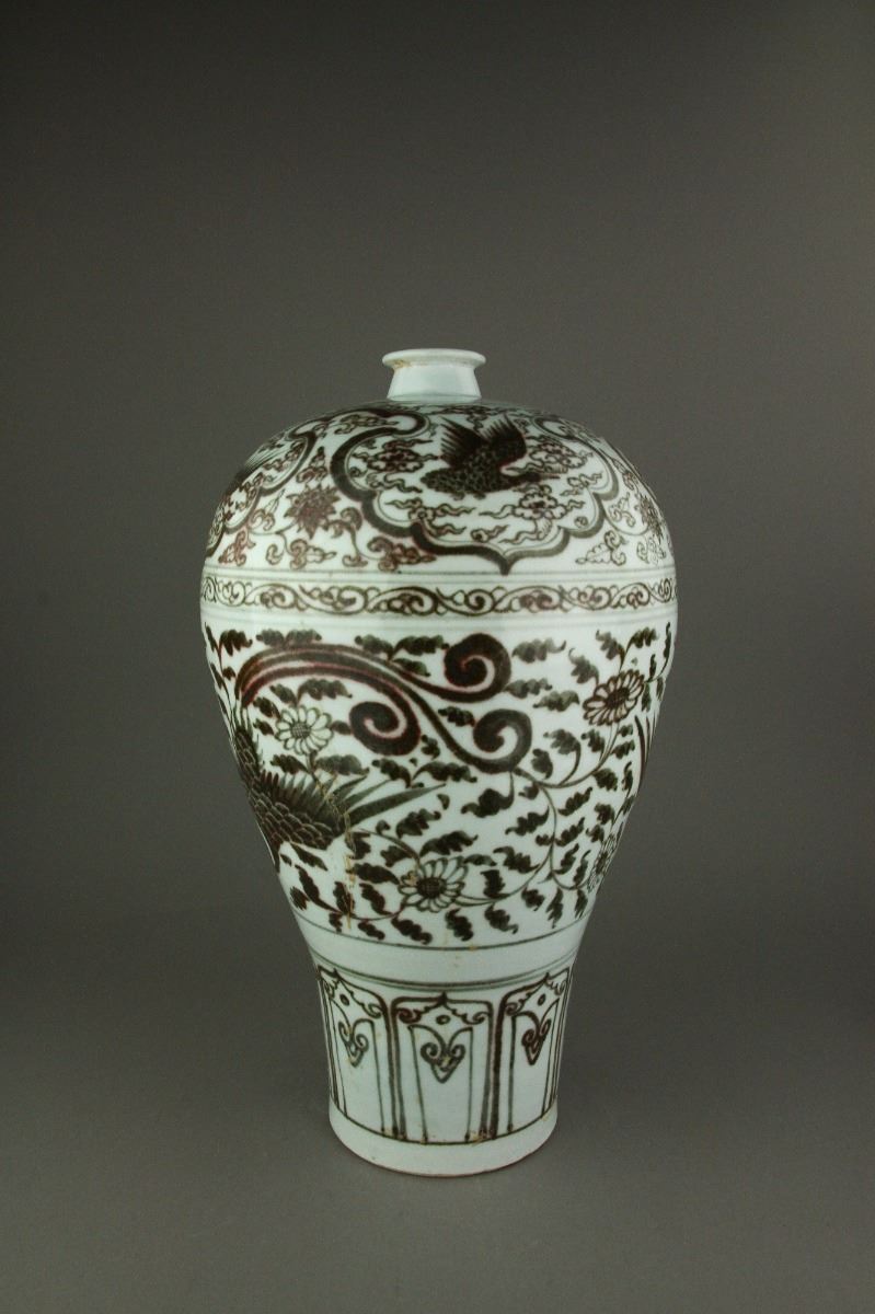 Chinese copper red glazed porcelain vase; of Meiping form; featuring phoenix and sunflower scrollwork on body; unglazed base; H: 44 cm, W: 24 cm , 4.5 kg
