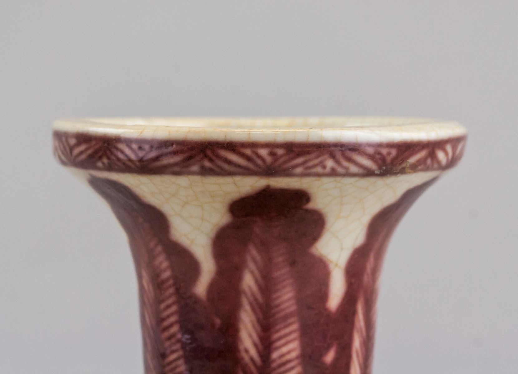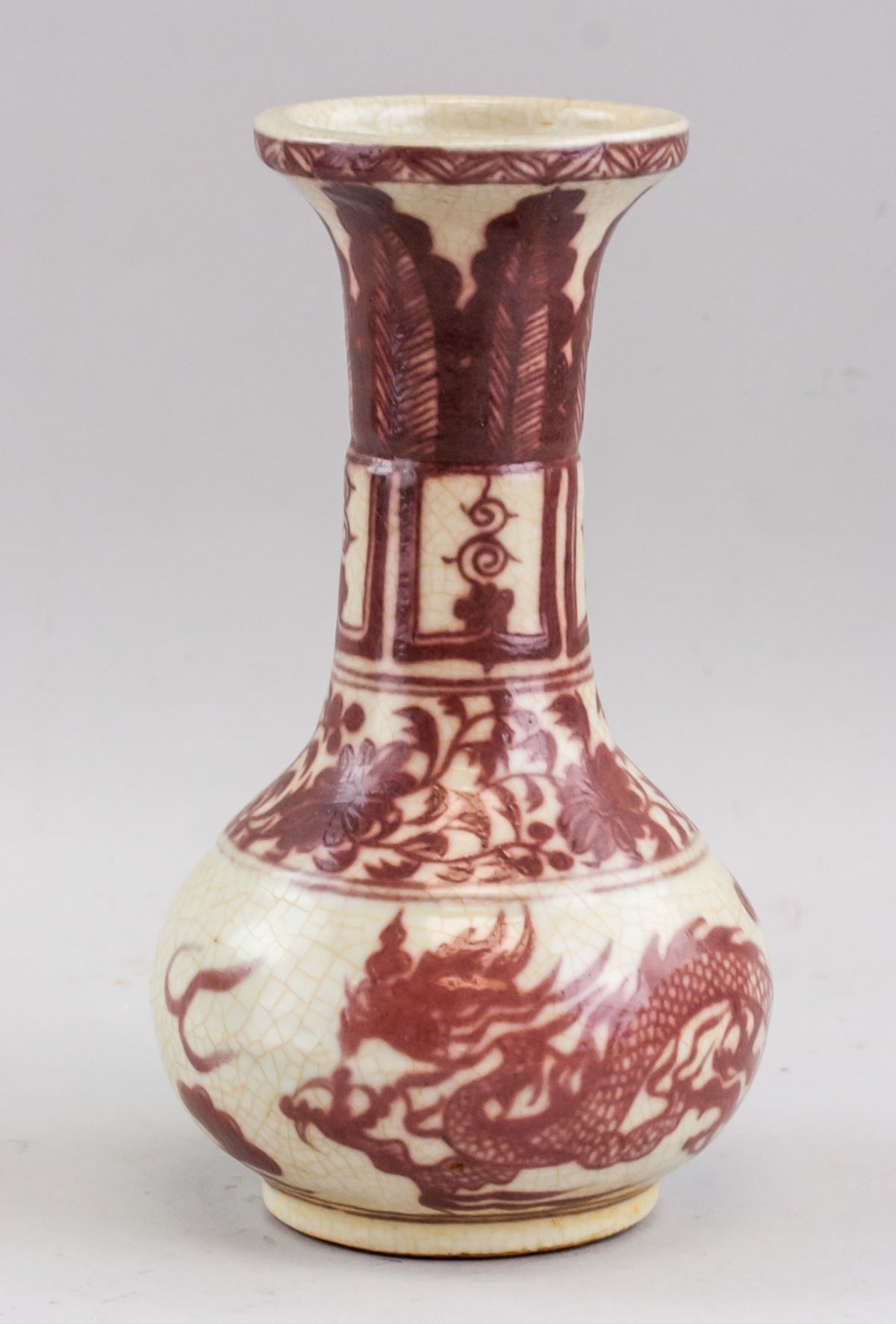Chinese copper red porcelain vase. Of globular body with narrowed neck and splayed mouth rim. Painted with dragon. Decorated with floral and leafy pattern. 22 x 13 cm, 695 grams