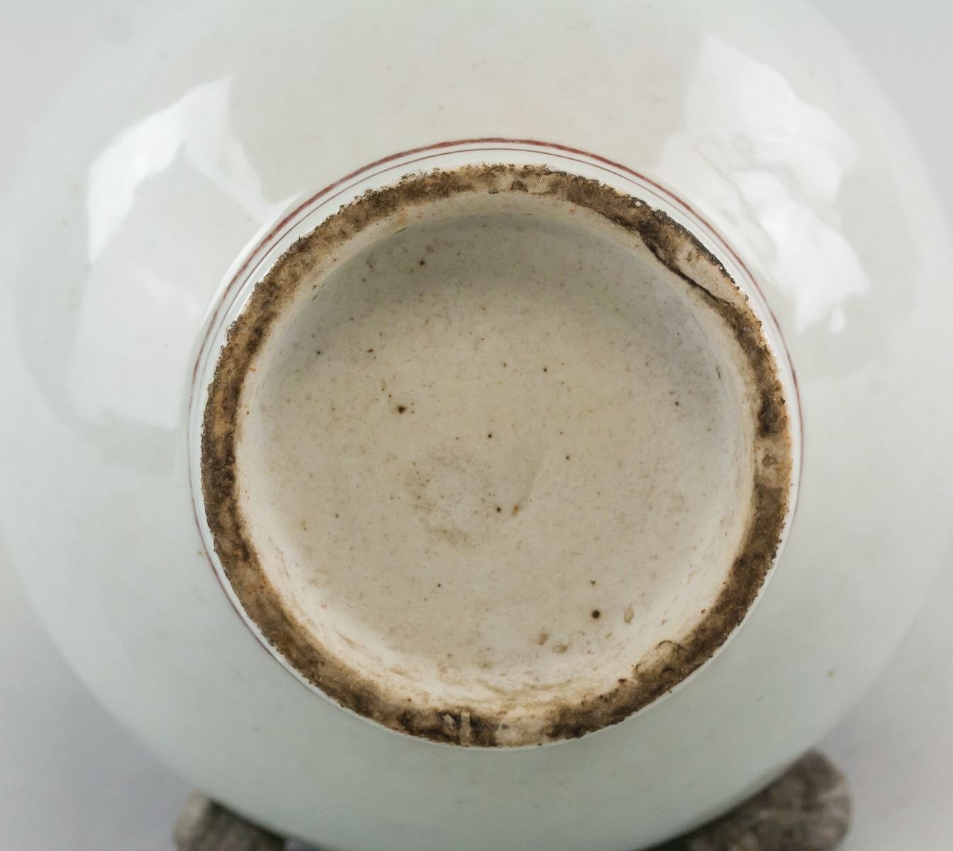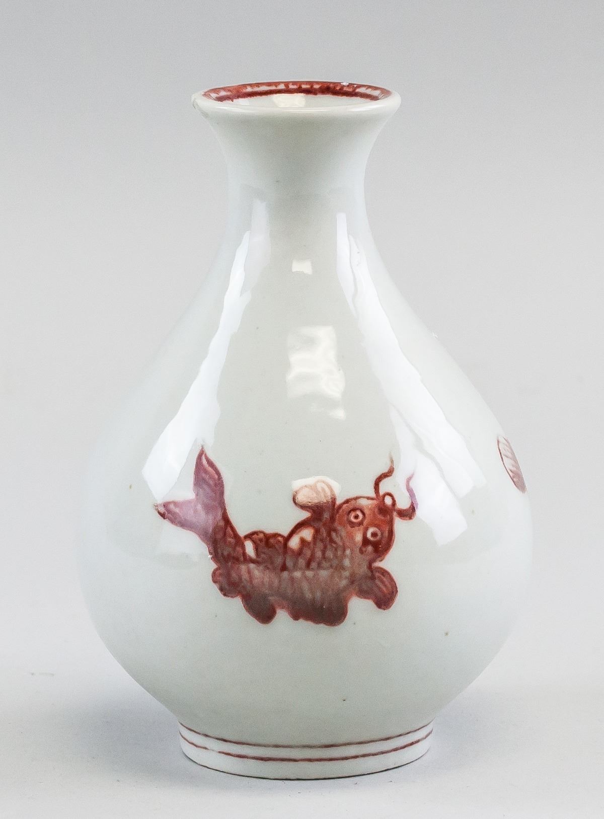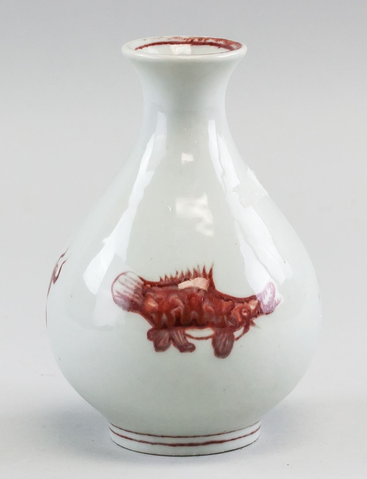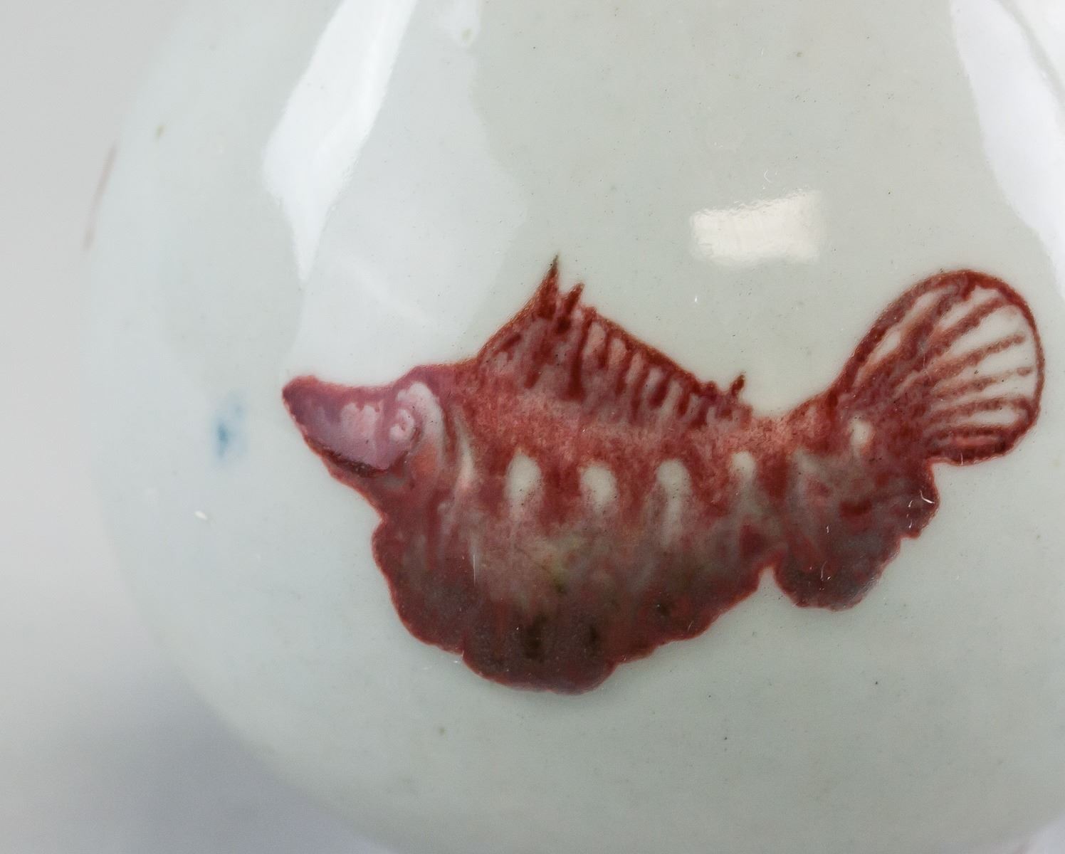 Chinese copper red porcelain vase. Of pear shape body with splayed mouth rim. Painted with fish. 18th century or ealier. 15 x 11 cm, 346 grams