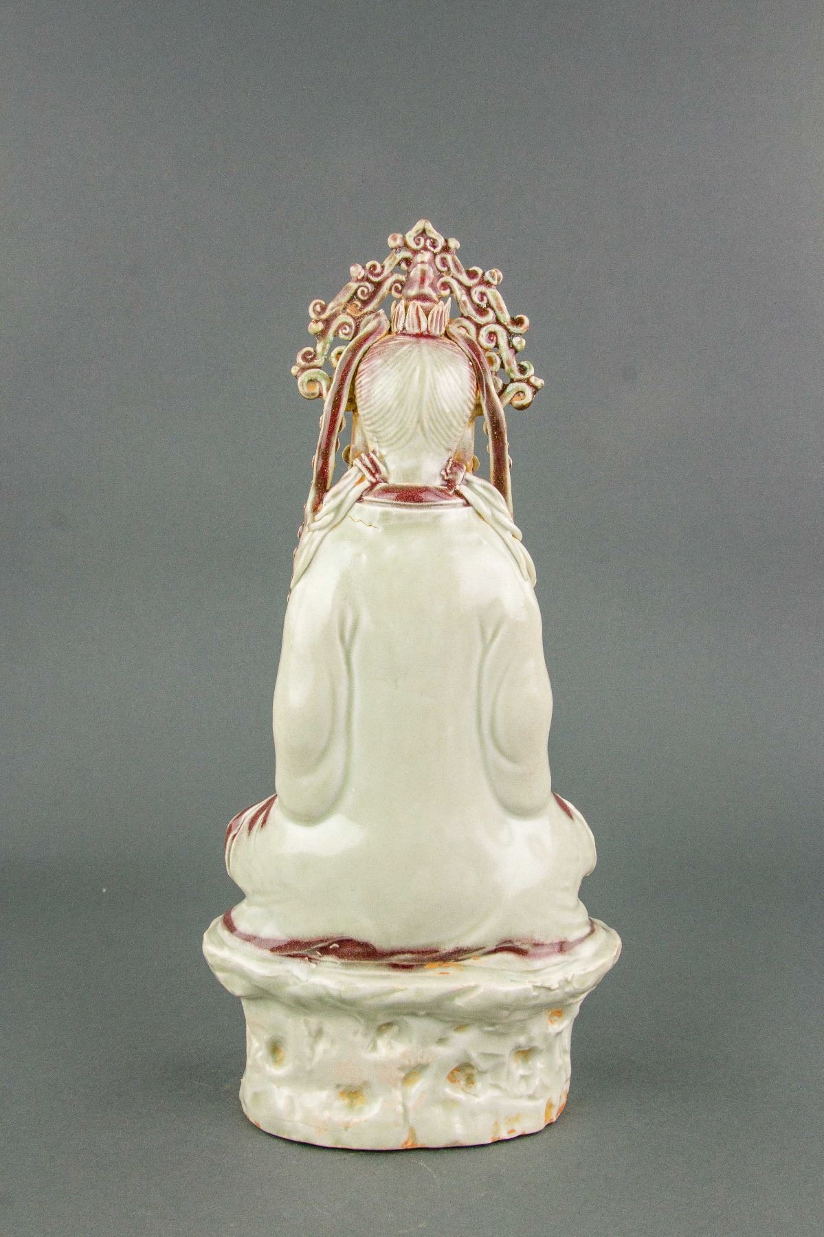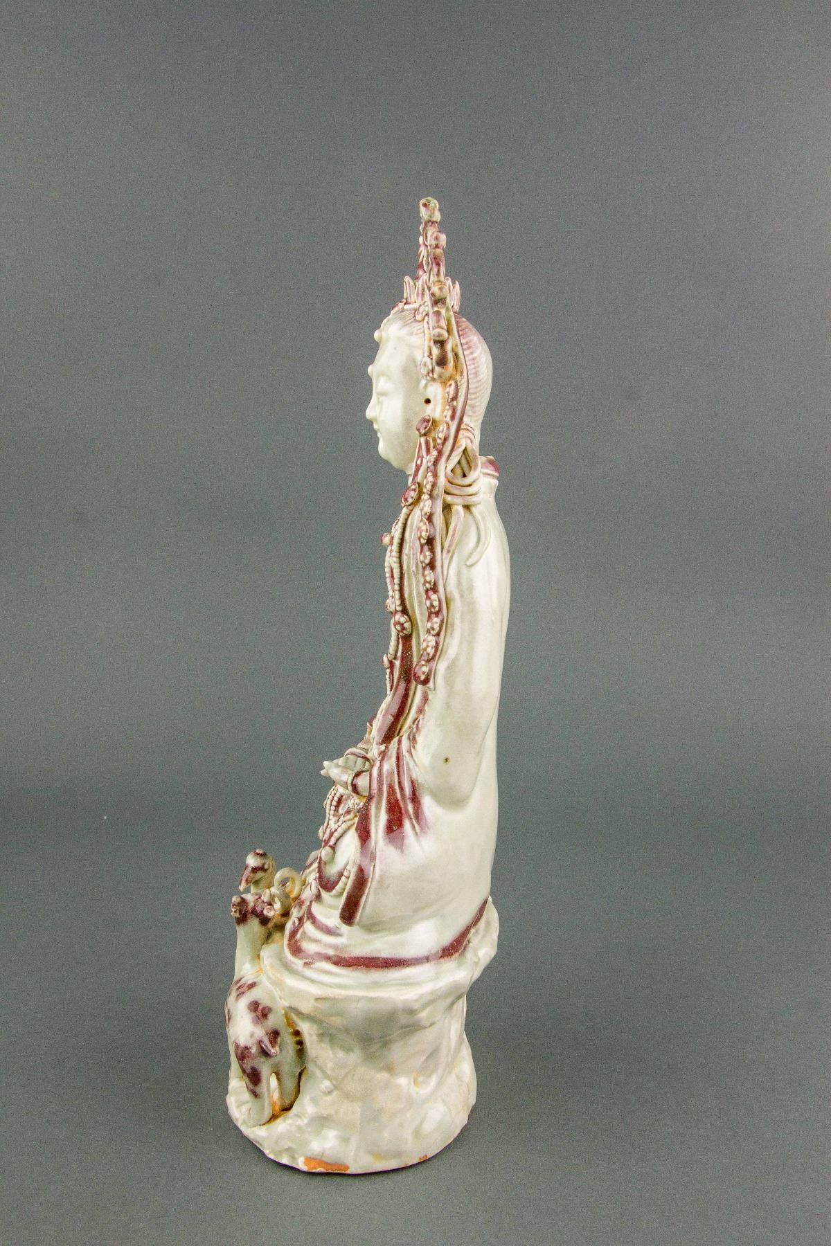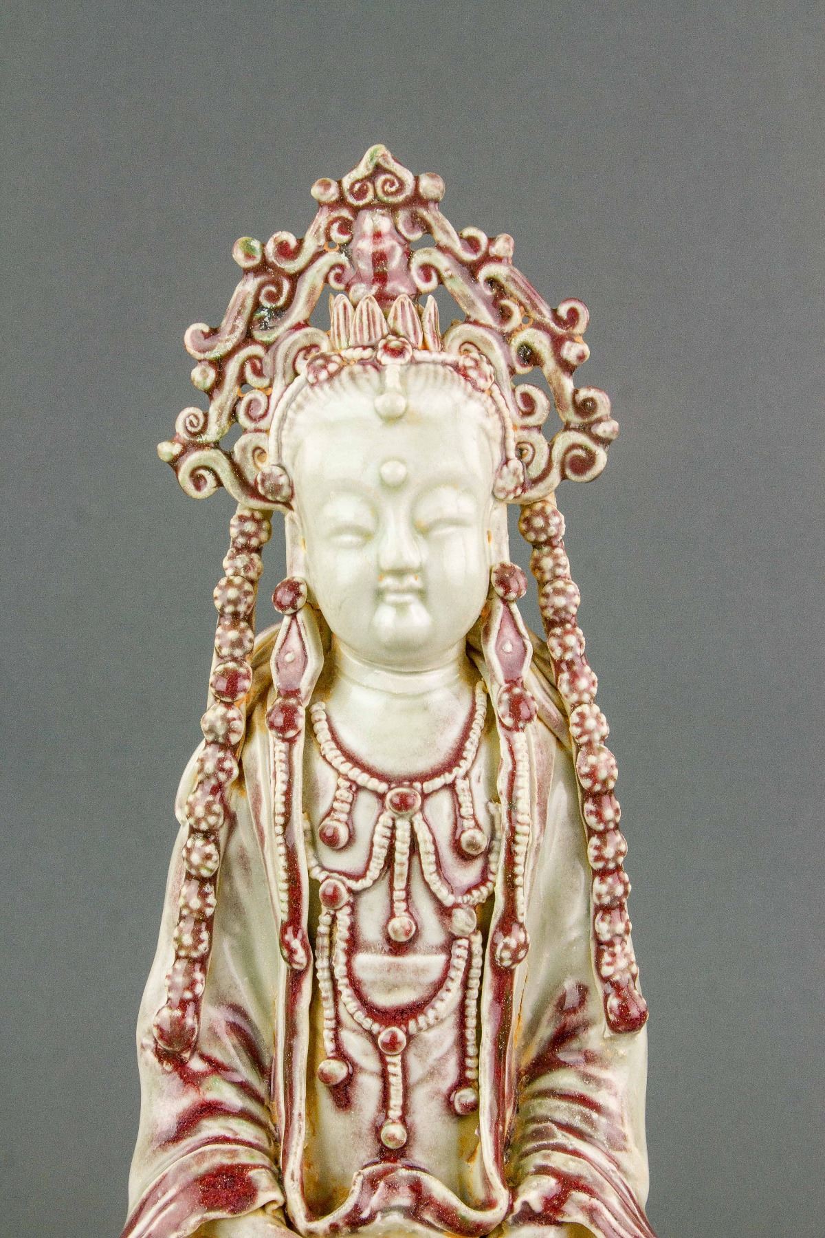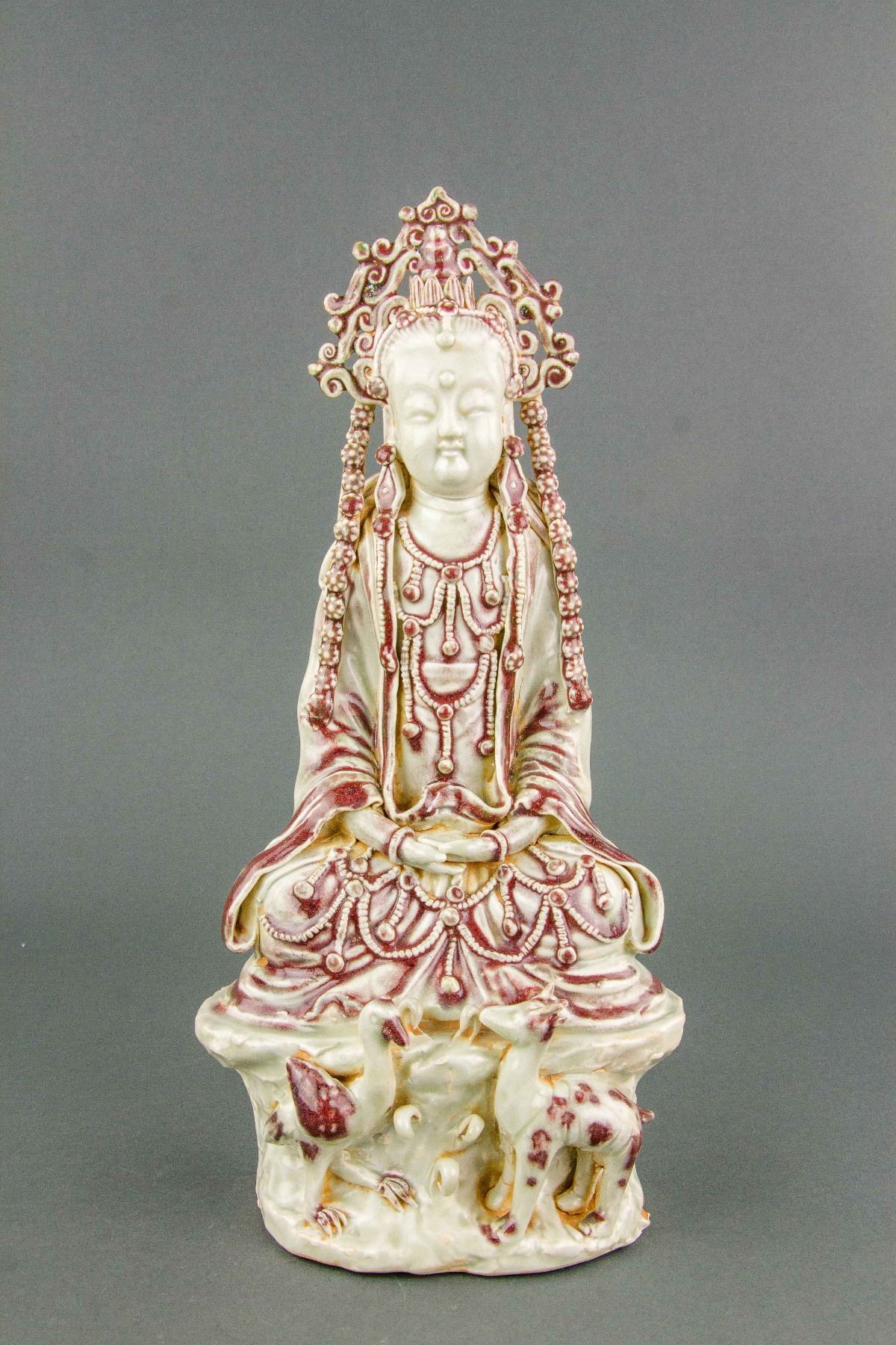 Chinese copper red porcelain figure; Yuan or Ming style; depicting Guanyin seated in vajraparyankasana with hands in Dhyana mudra; wearing elaborate jewellery including hair ornaments, earrings and beaded necklaces; the Bodhisattva Avalokitesvara is accompanied by a duck and a sika deer at the base; H: 33 cm, W: 11 cm, L: 16 cm, 1875 grams