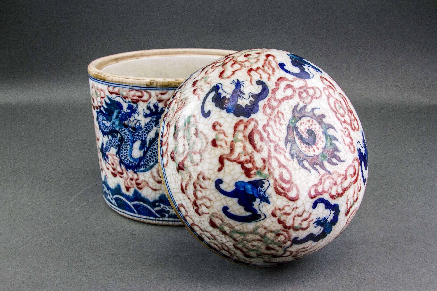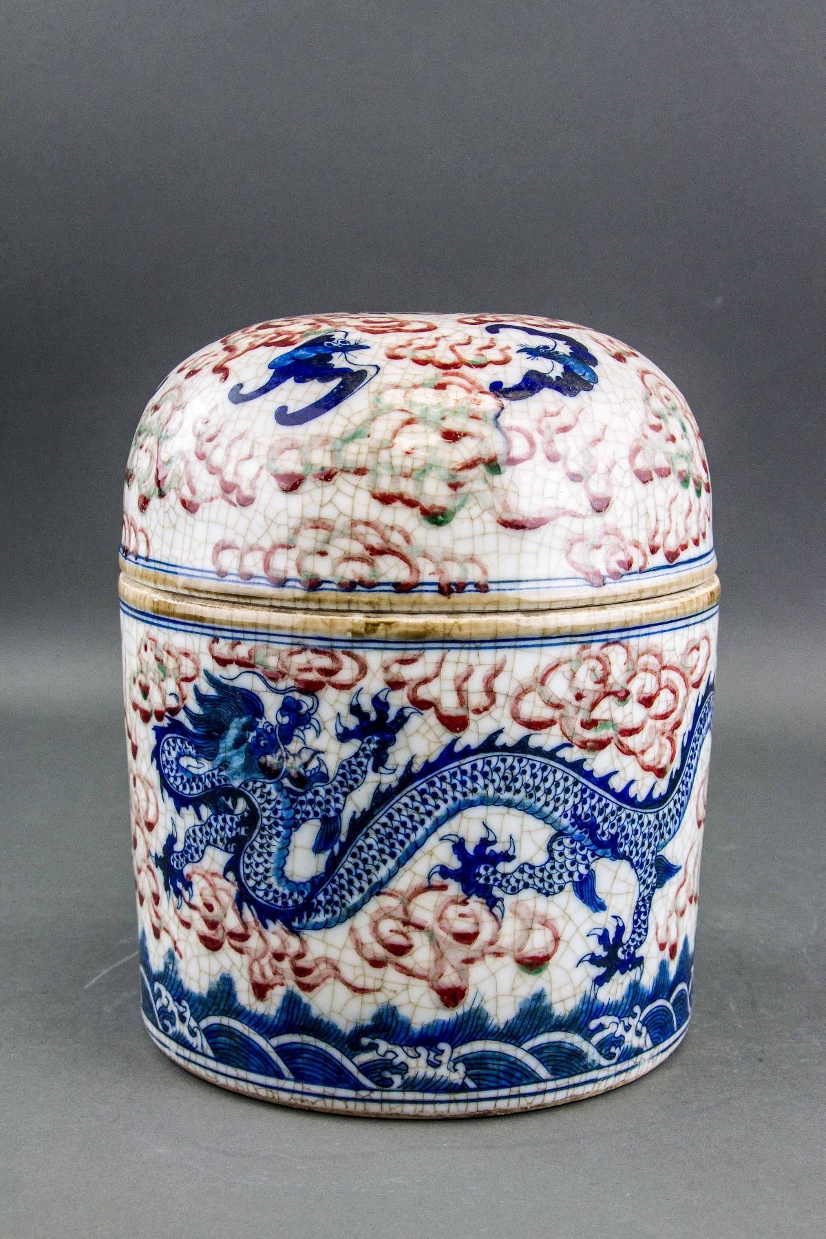 Chinese copper red blue and white porcelain jar; of cylinder form body with rounded top cover; painted with dragon, bats and wave in blue glaze, and fireballs in copper red glaze; four-character Yongzheng mark on base; H: 25 cm, D: 22 cm, 4kg