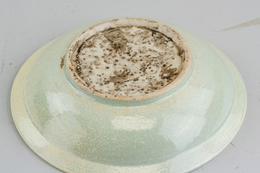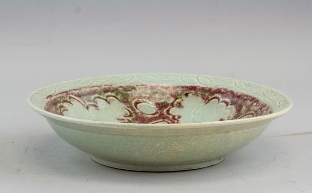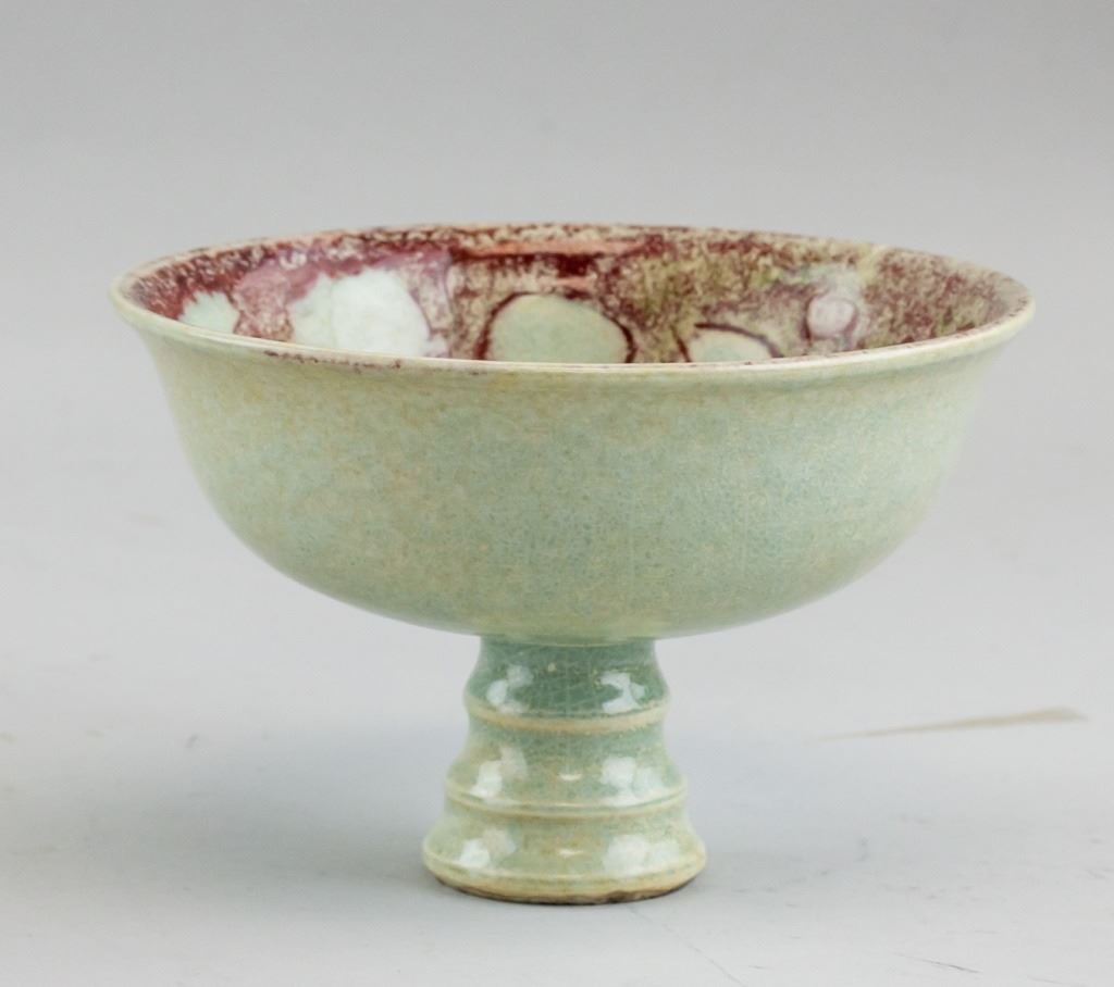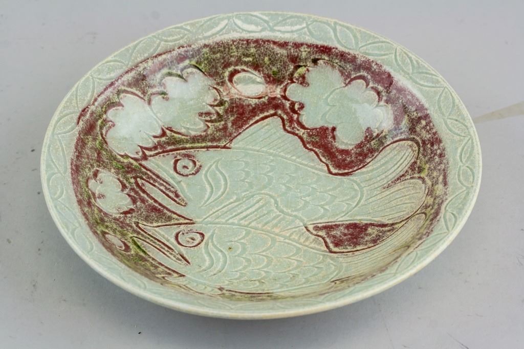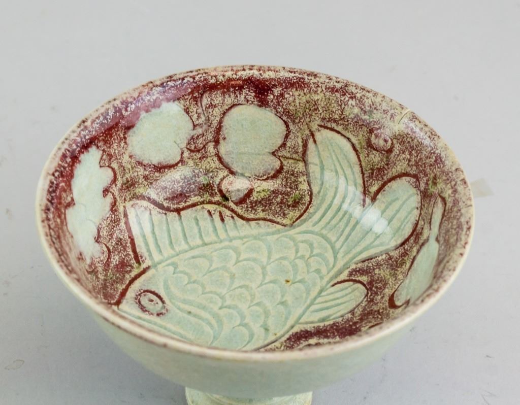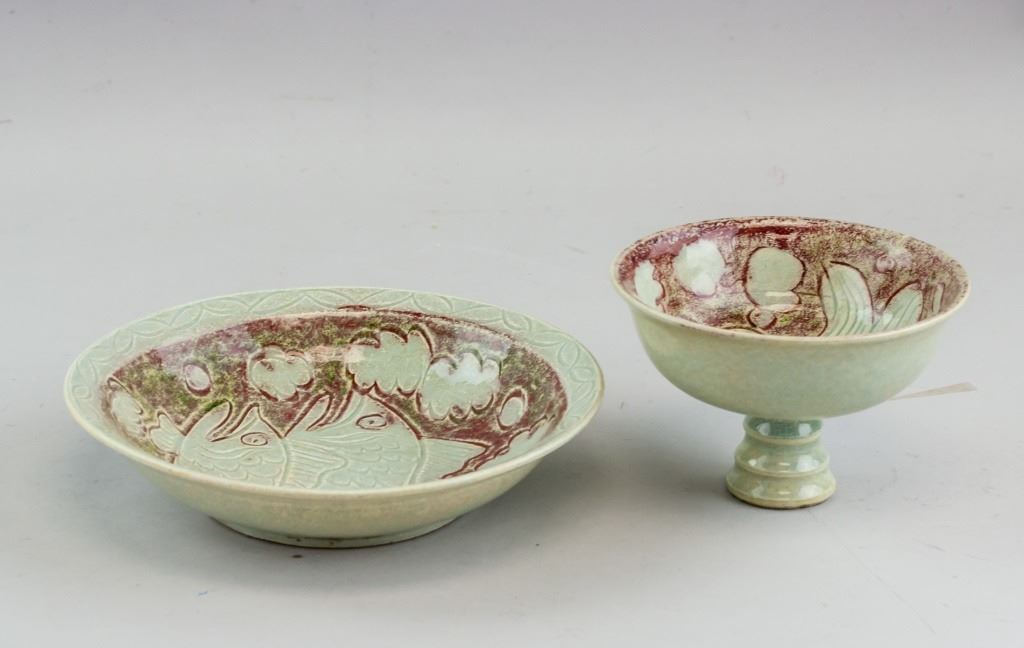 Two (2) Chinese copper red porcelains. On e stem cup and one saucer. Painted with fish and water grass. 4 x 18 cm, 623 grams total