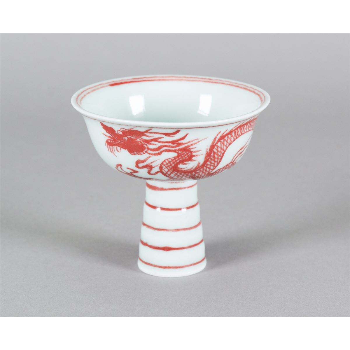 Chinese cooper red stem cup; everted cup rim; raised on high foot rim; featuring dragon pattern; six-character Ming Chenghua mark on base; H: 7 cm, D: 10 cm, 148 grams