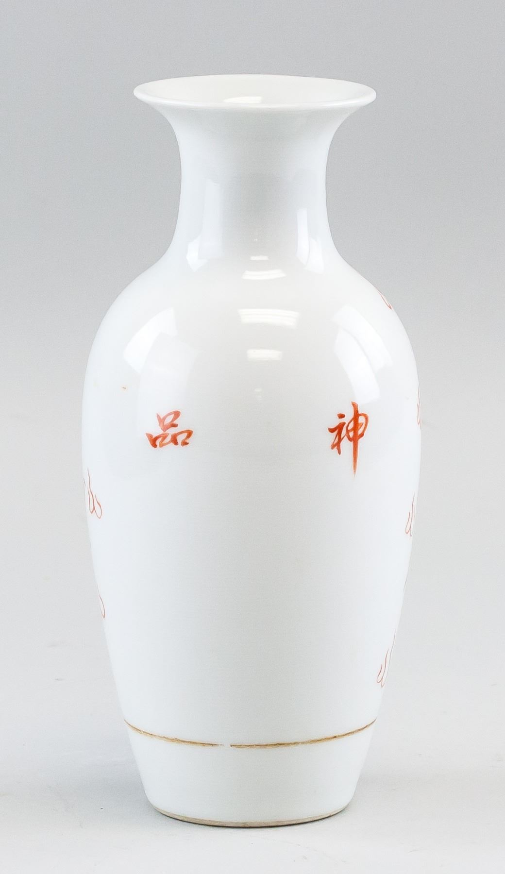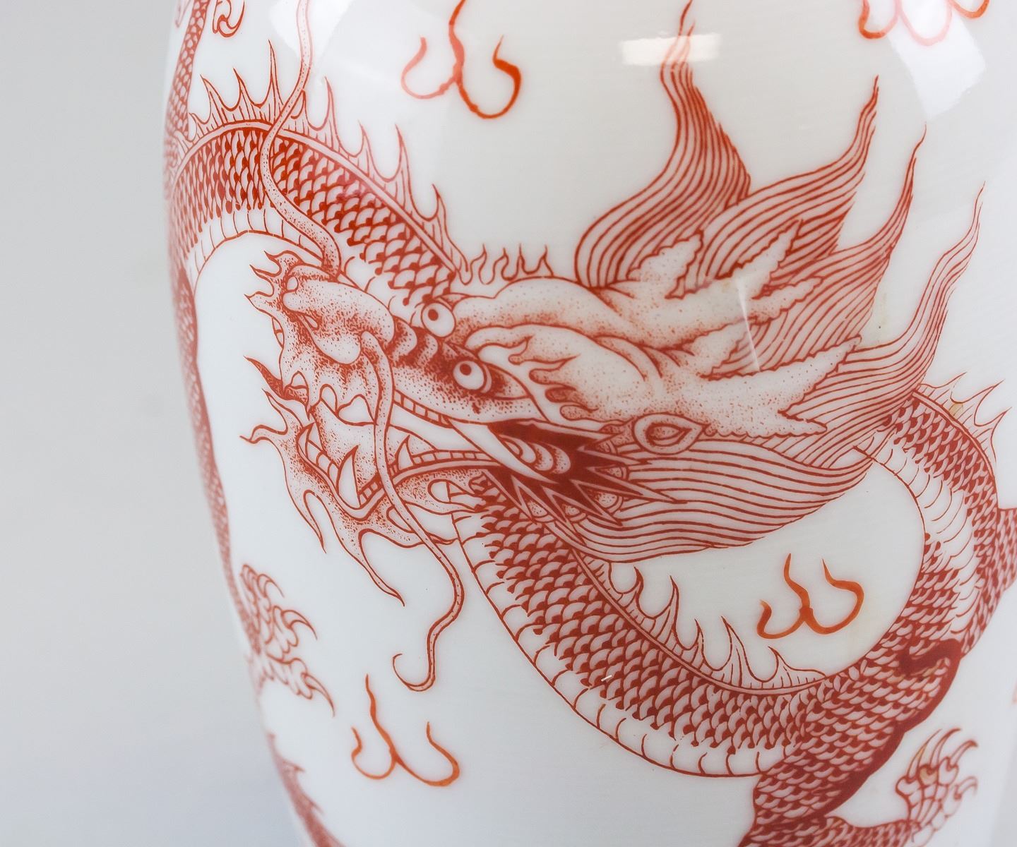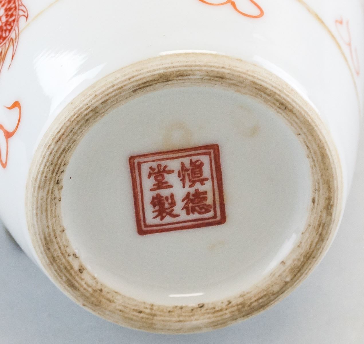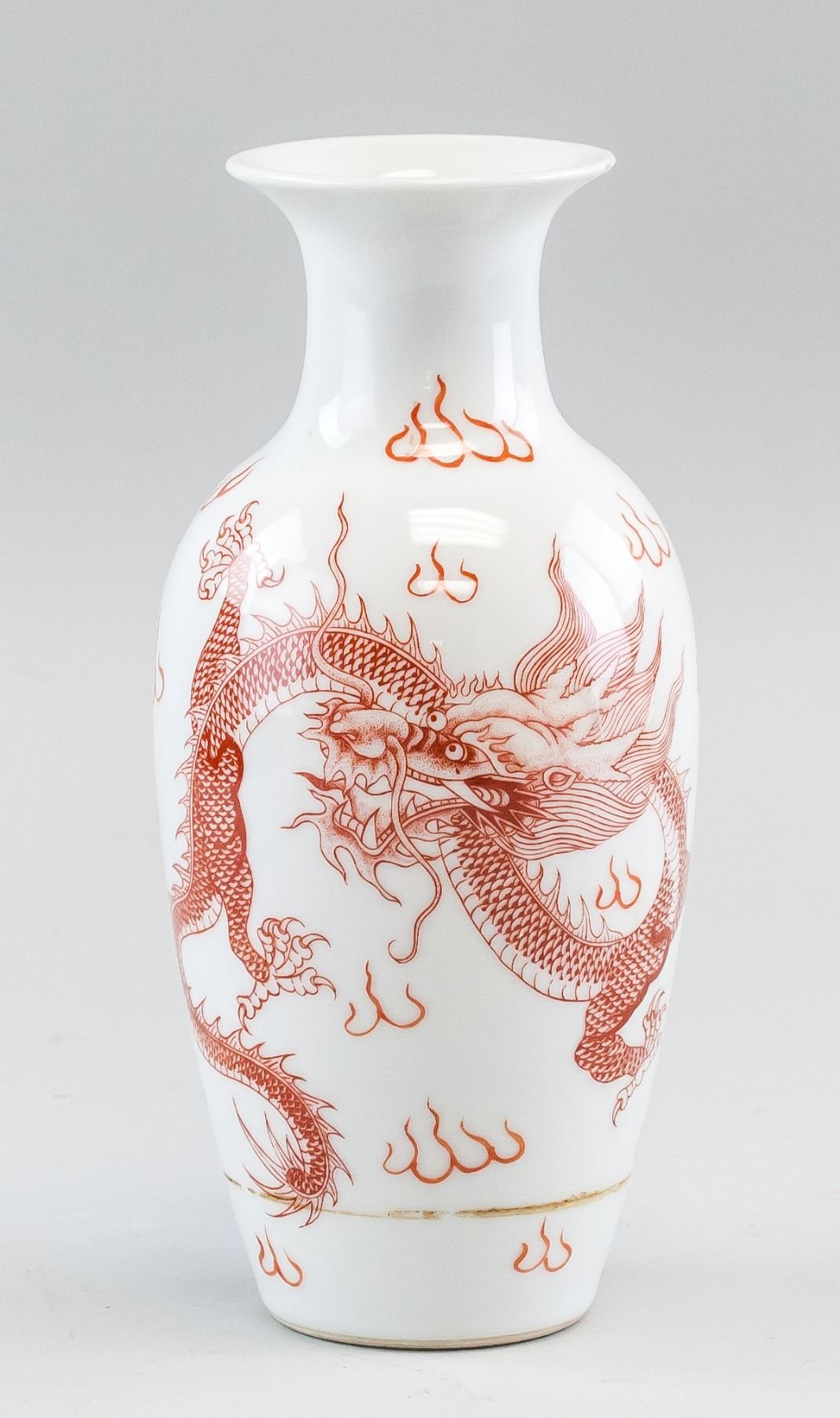 Chinese copper red porcelain vase. Of cylinder body. Painted with dragon and fireball. Lettering Shen Pin on side. Four-character Shen De Tang Zhi mark on base. 22 x 11 cm, 337 grams