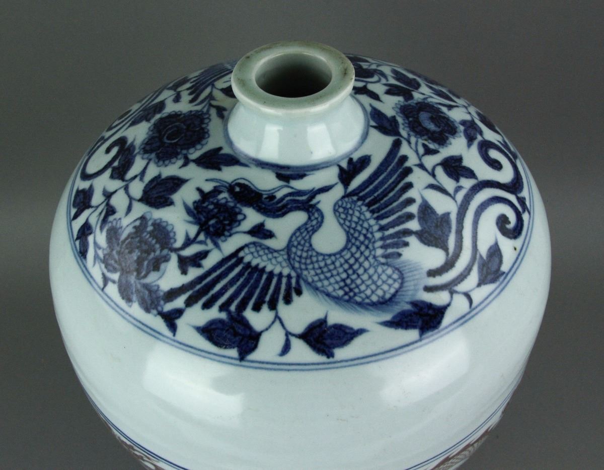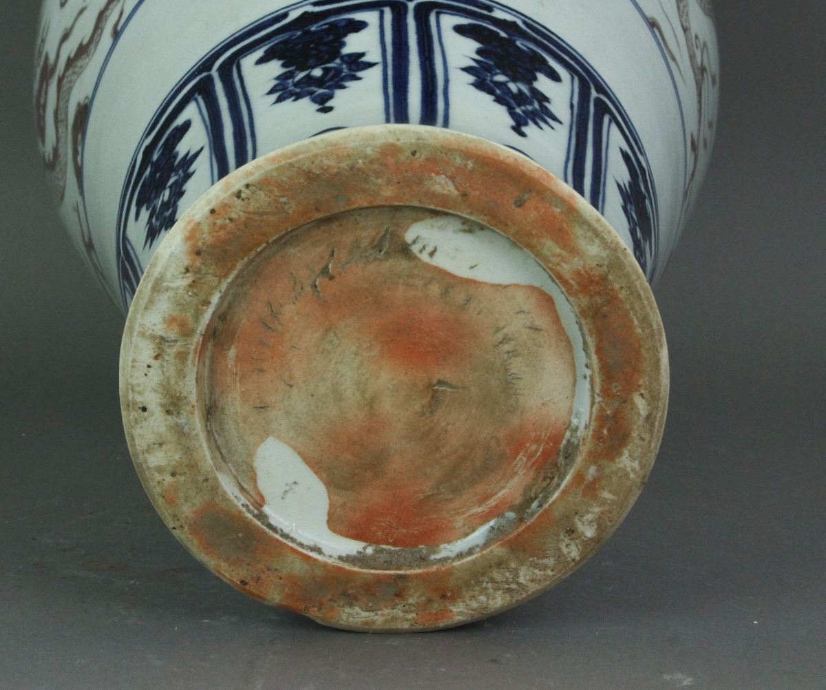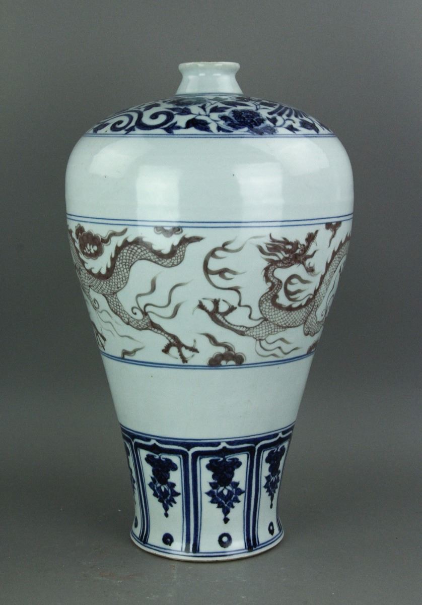 Chinese blue and white copper red porcelain vase; of Meiping form; decorated with a band of phoenix and peony scrolls on the shoulder and a band of striding dragon on the middle; unglazed base; H: 44 cm, D: 26 cm, 4665 grams
