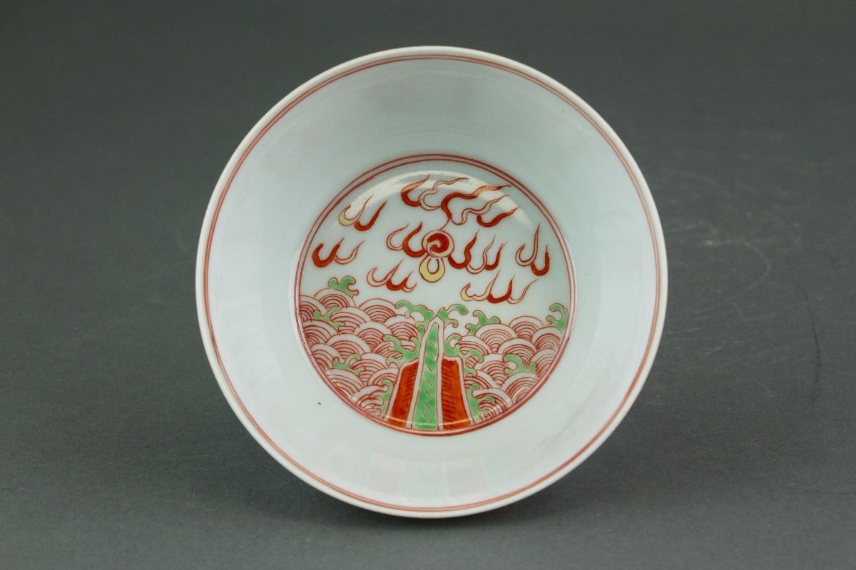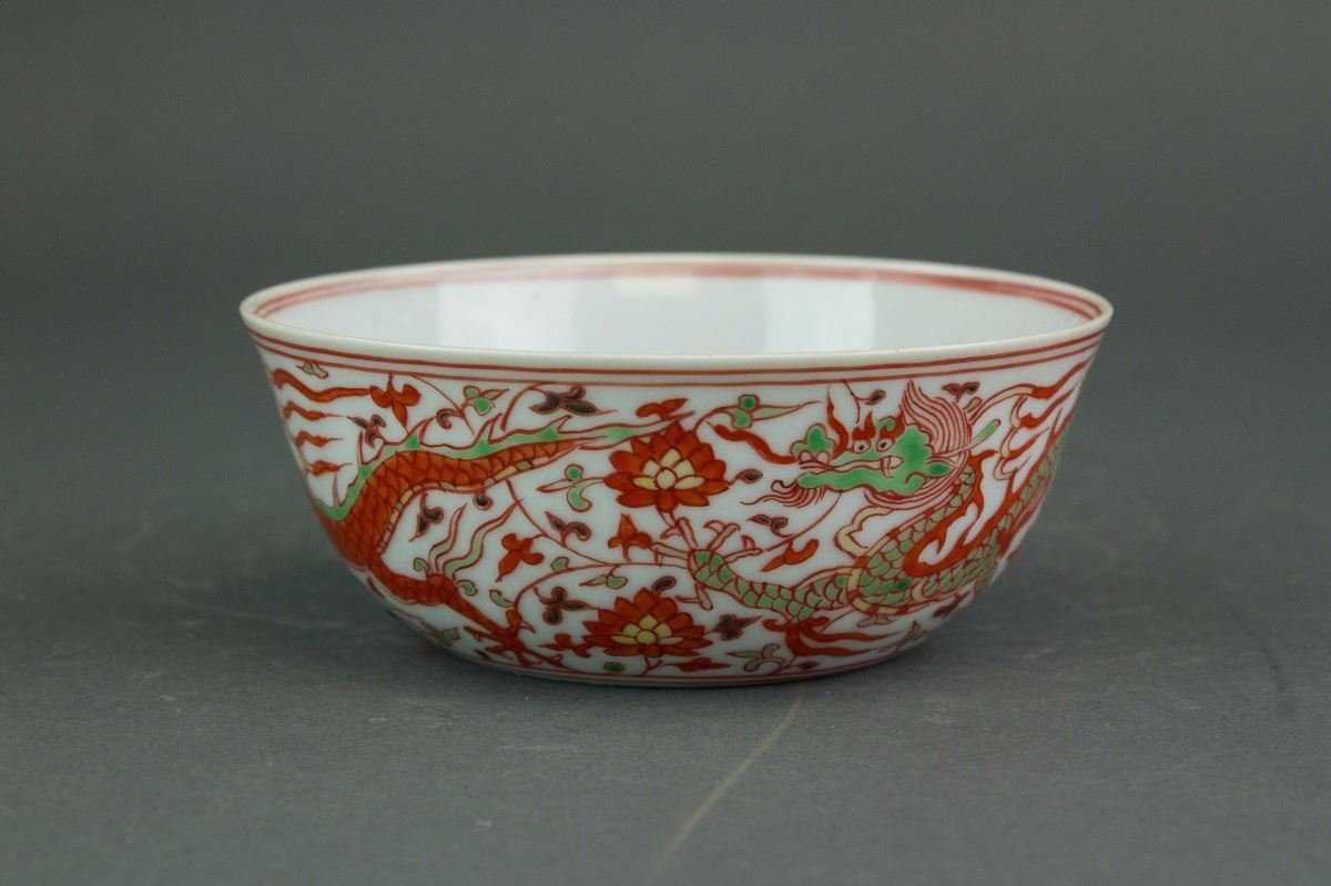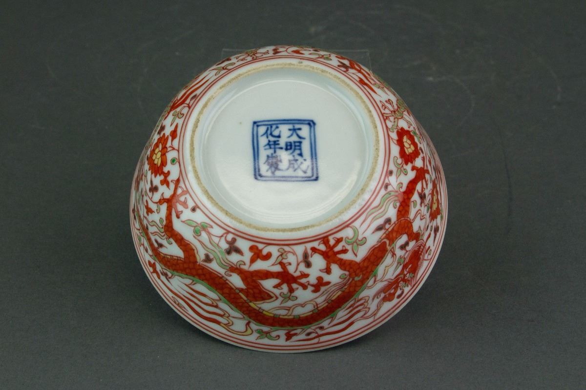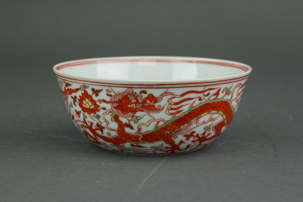 Chinese iron red porcelain cup; of rounded sides with recessed base; the exterior painted in red and green enamel with striding five-clawed dragon amidst lotus scrolls; six-character Ming Chenghua mark on base; H: 44 cm, D: 11 cm, 63 grams