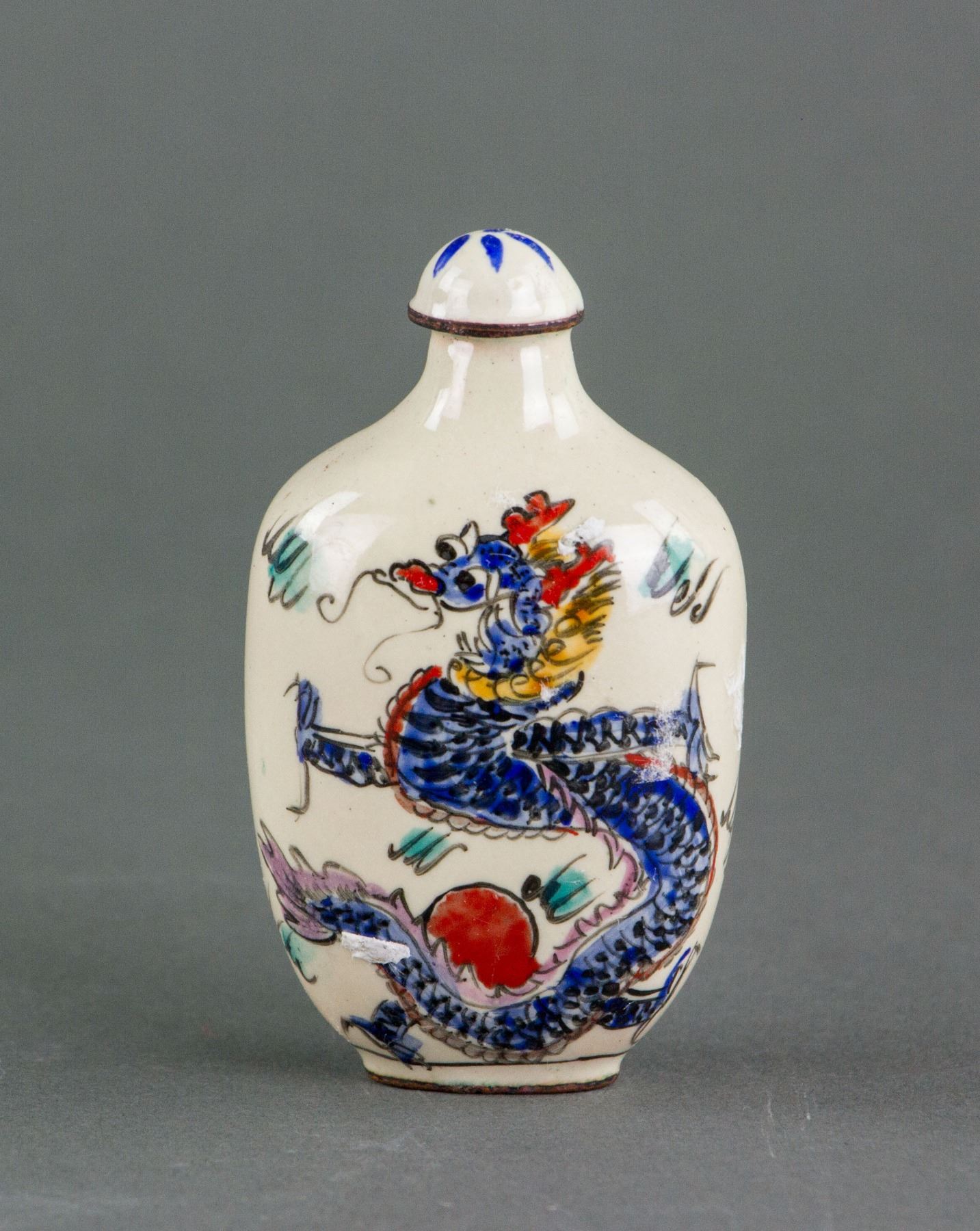 Chinese copper snuff bottle; of flatten ovoid body; painted with dragon and bats; two-character "Da Qing" mark on base; 8 cm x 4.5 cm, 53 grams