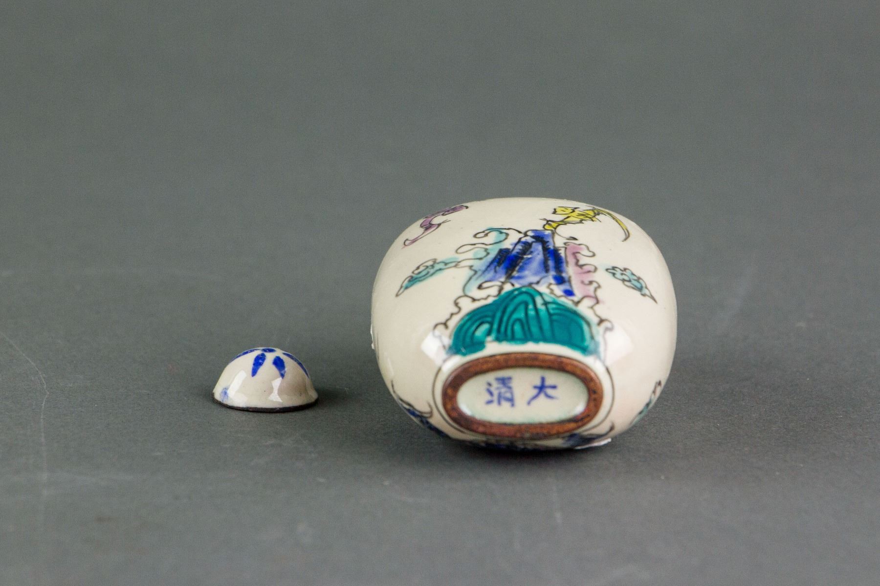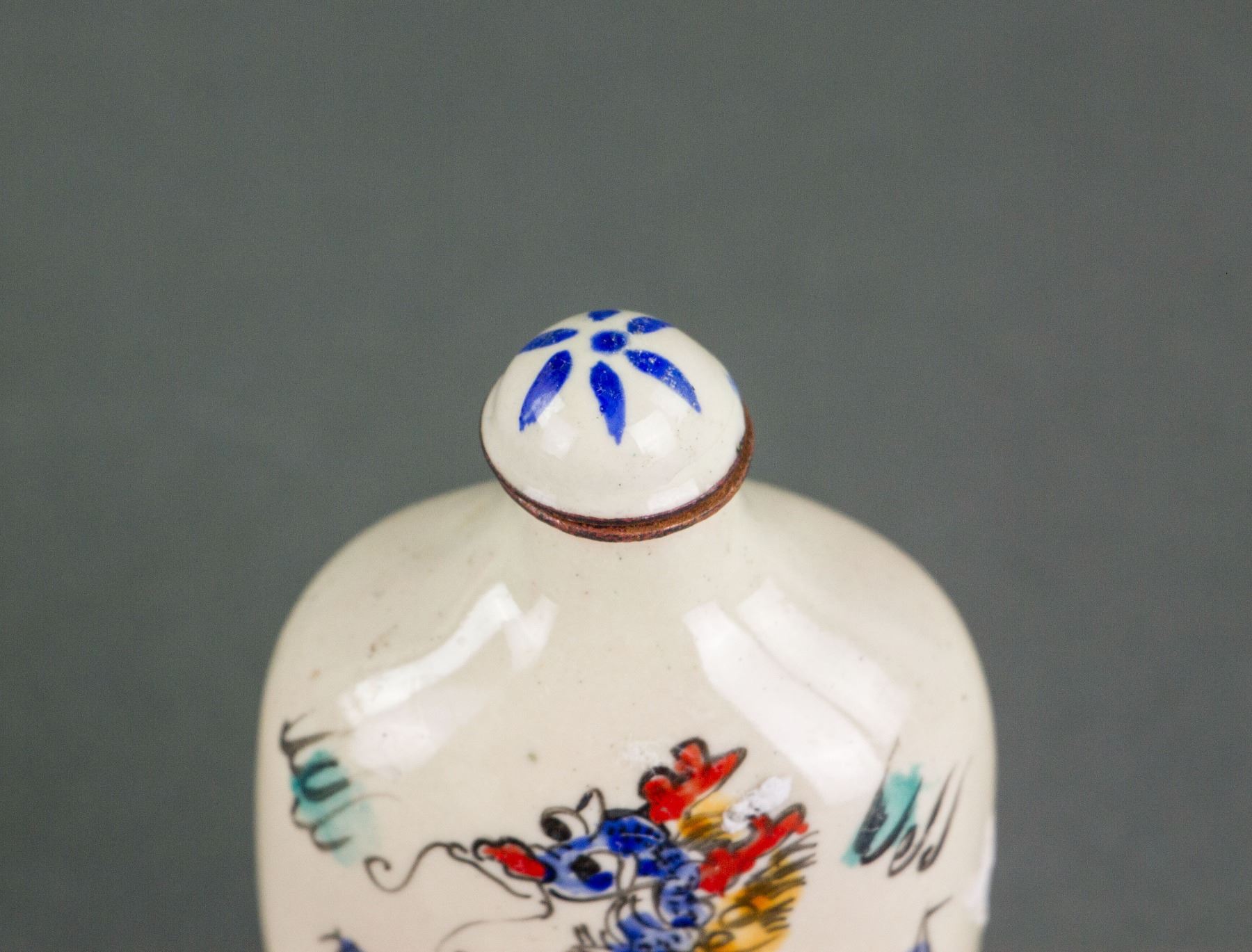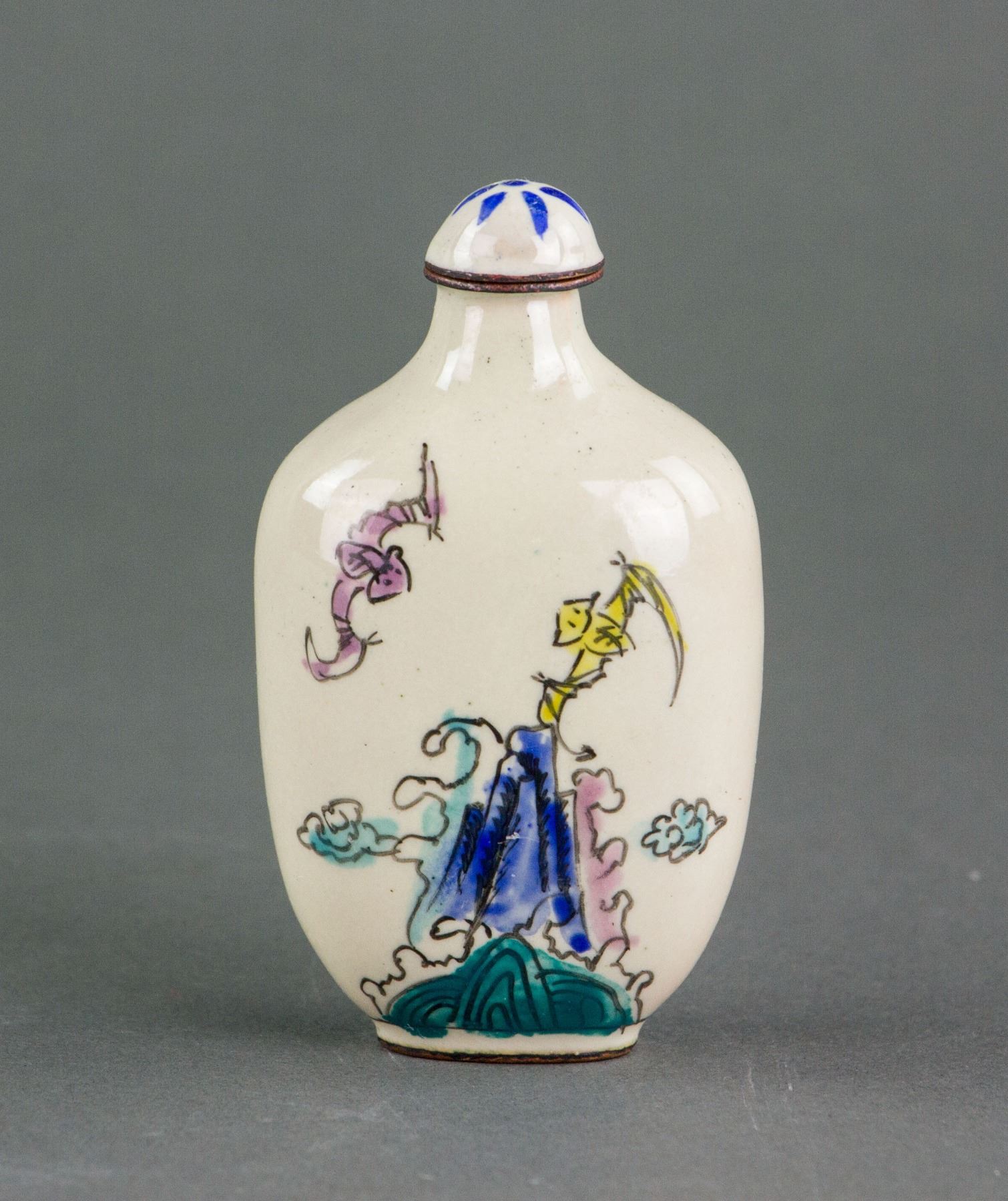 Chinese copper snuff bottle; of flatten ovoid body; painted with dragon and bats; two-character "Da Qing" mark on base; 8 cm x 4.5 cm, 53 grams