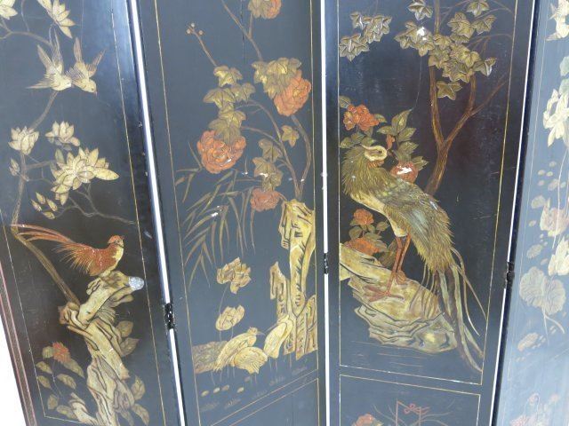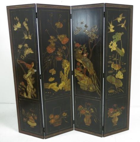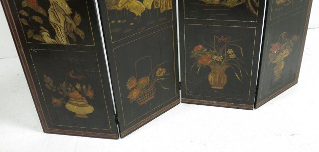 19th century. Black lacquer. Each panel approx. 71" H x 17 3/4" W. Total 79 1/2" W. Cracks. Chips. Some losses.