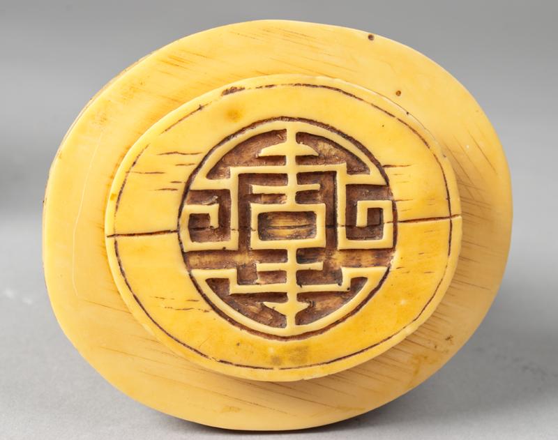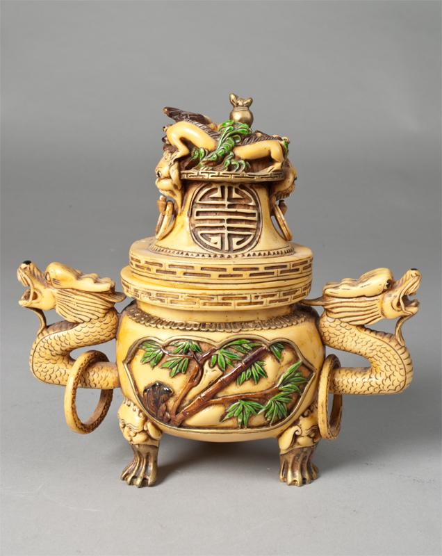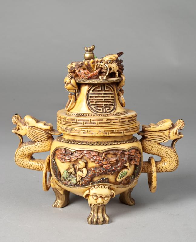 Finely molded to depict a landscape with dragon handles with loose rings and dragon finial with loose rings. 8.5" H x8.5" W, circa 1960's.