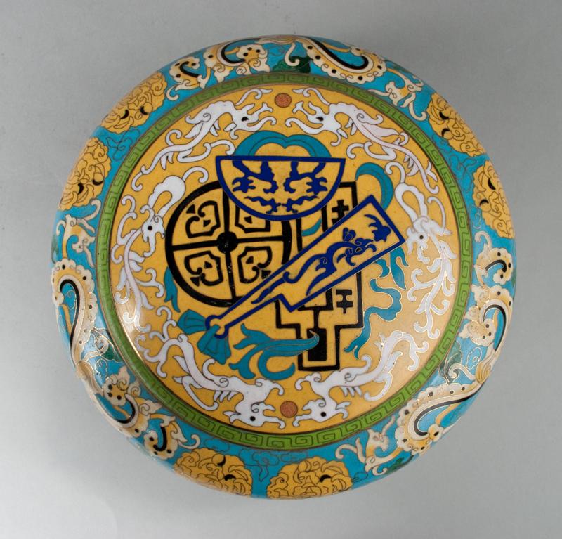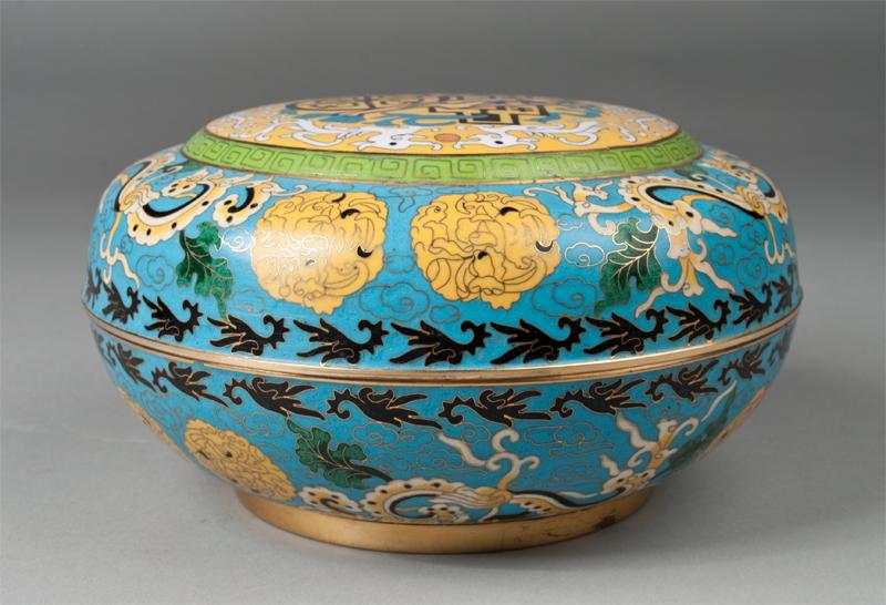 Decorated with chilongs, geometric symbols ant other animal form designs with gilt highlights and gilt Greek key symbols, with interior a rich turquoise. Brass four character mark on underside. 4.5" H x 8.5" Dia., 20th century.