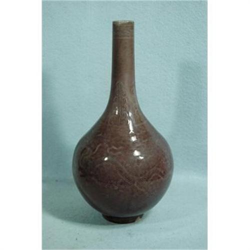 Chinese dark purple glaze stick neck porcelain vase with Qian-Long mark. Decorate with dragon.Good condition. 13" high.