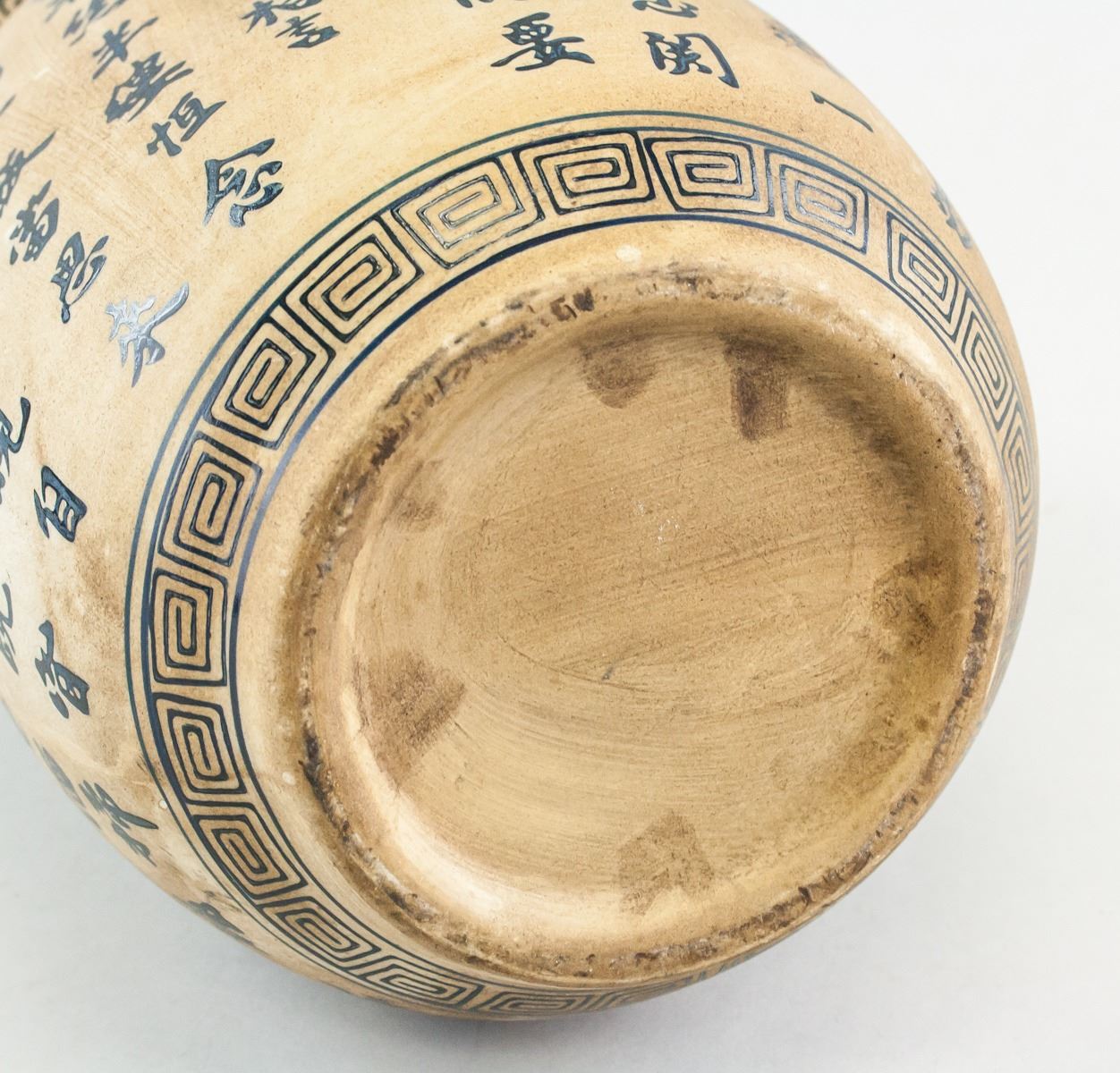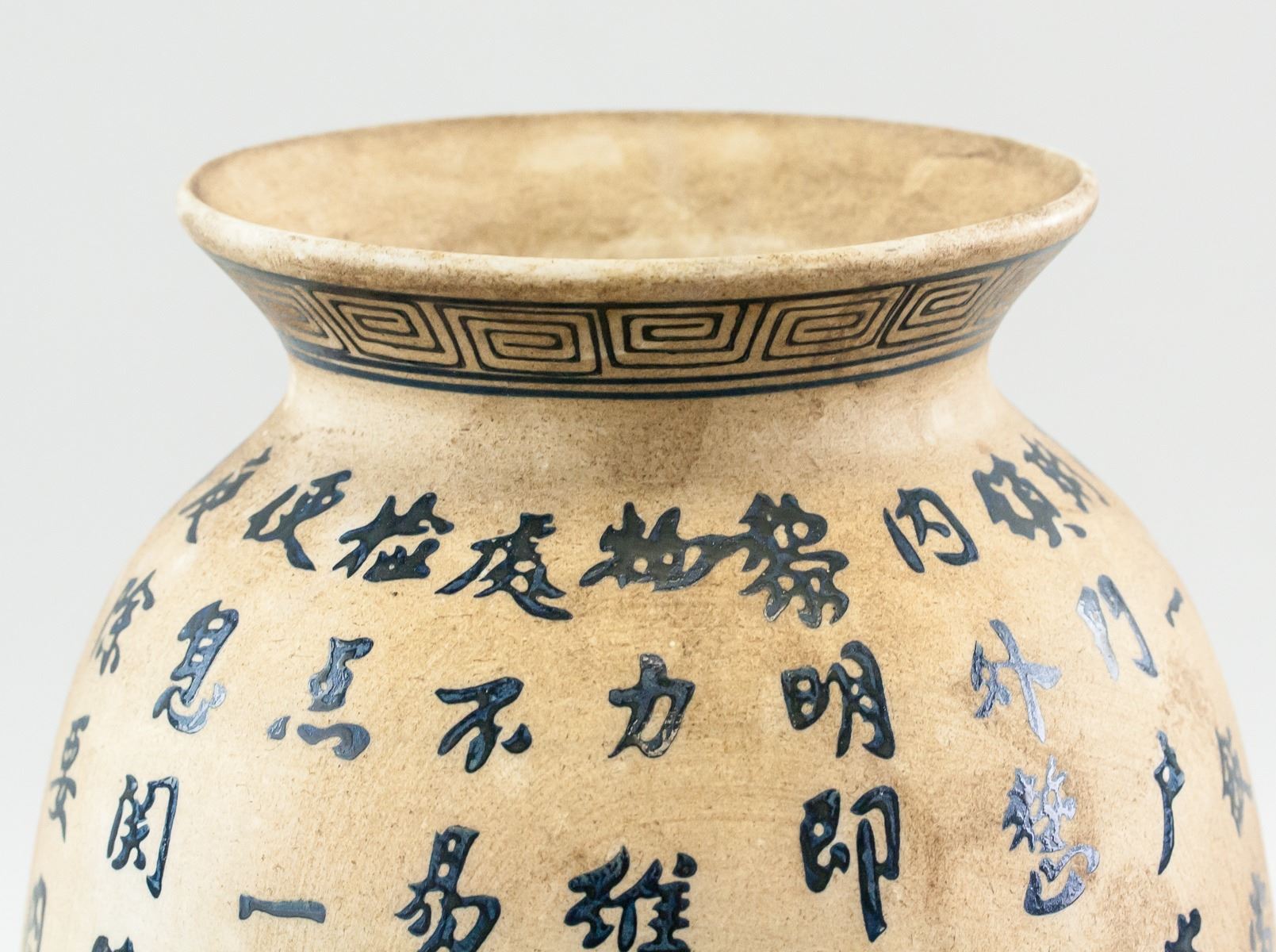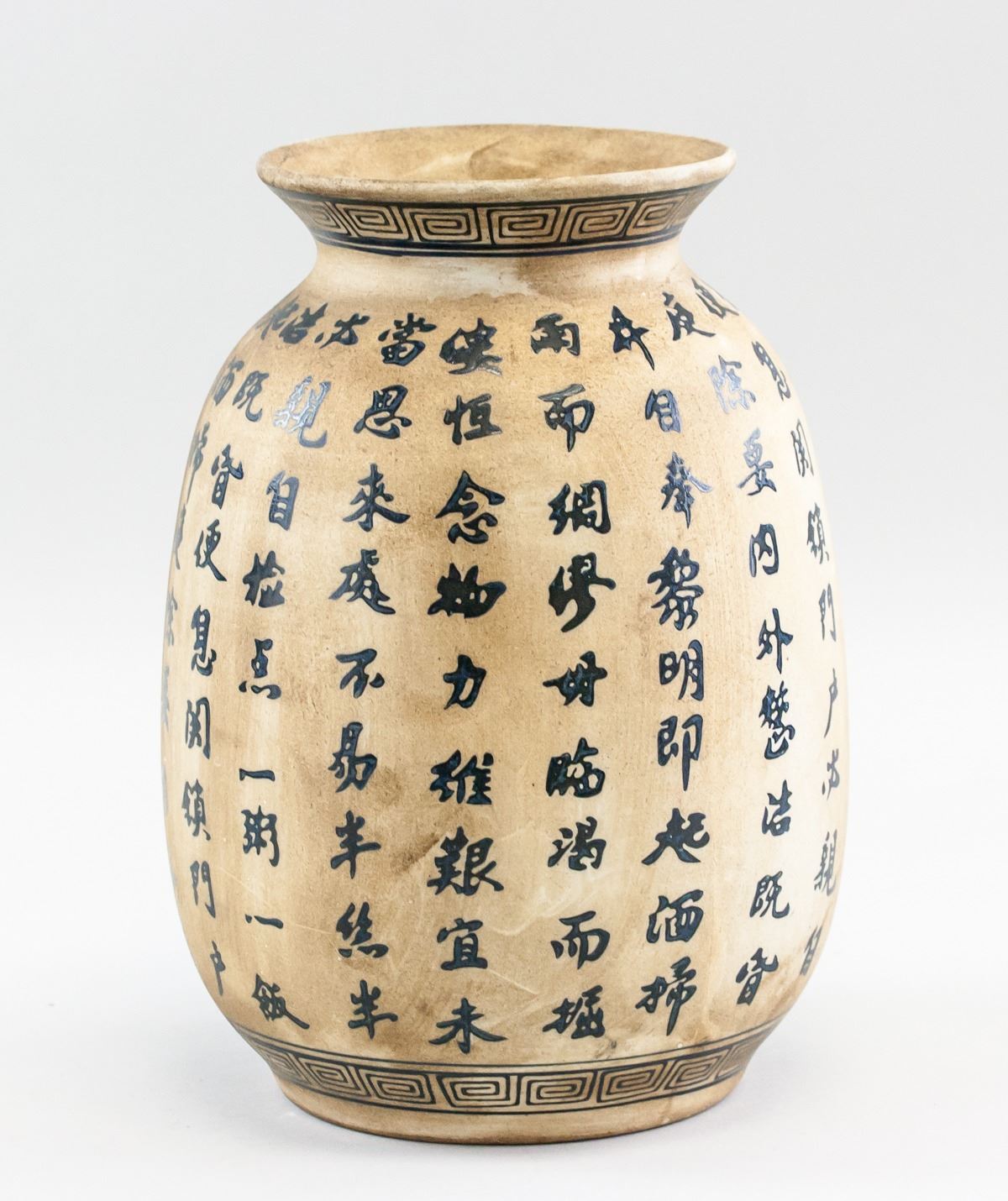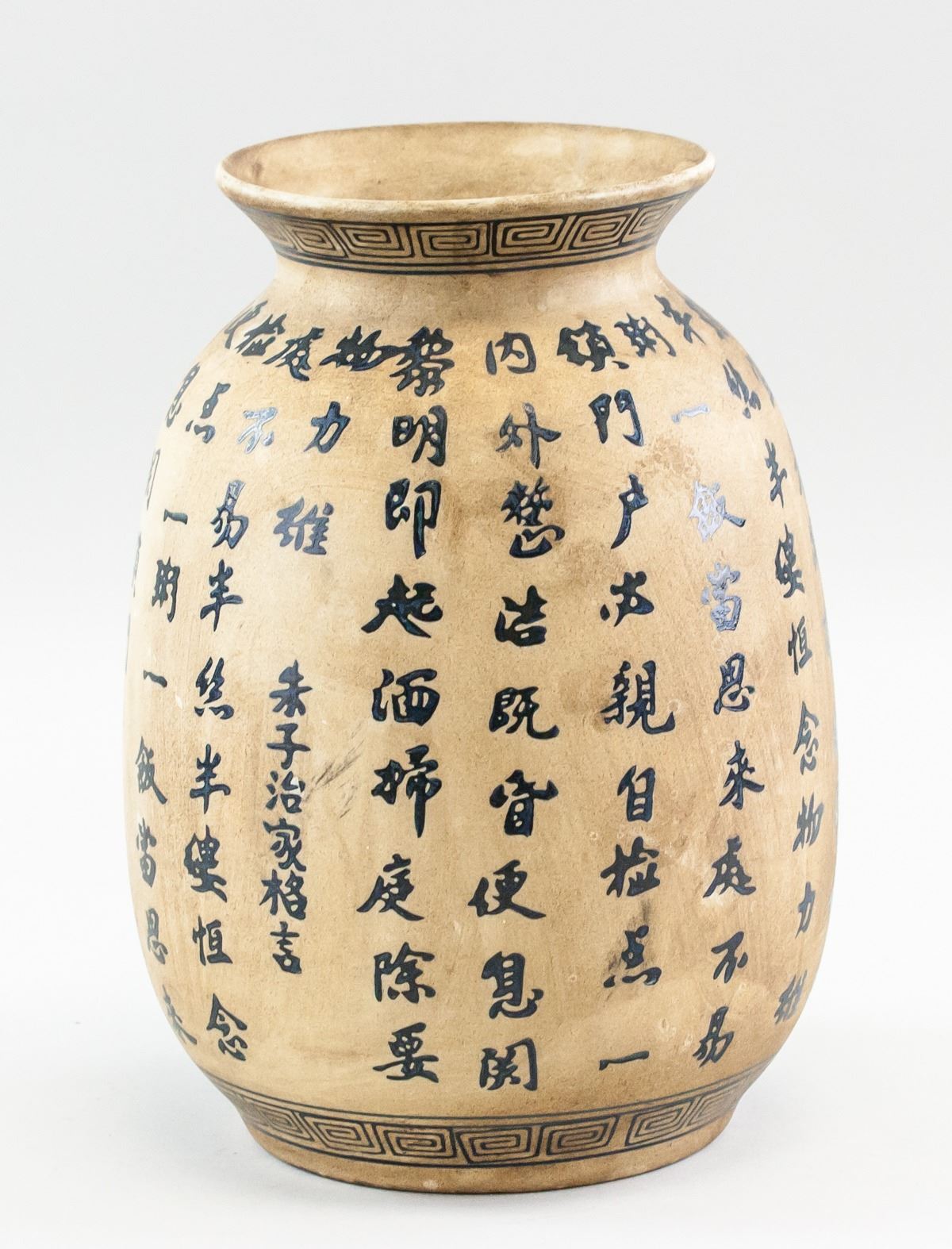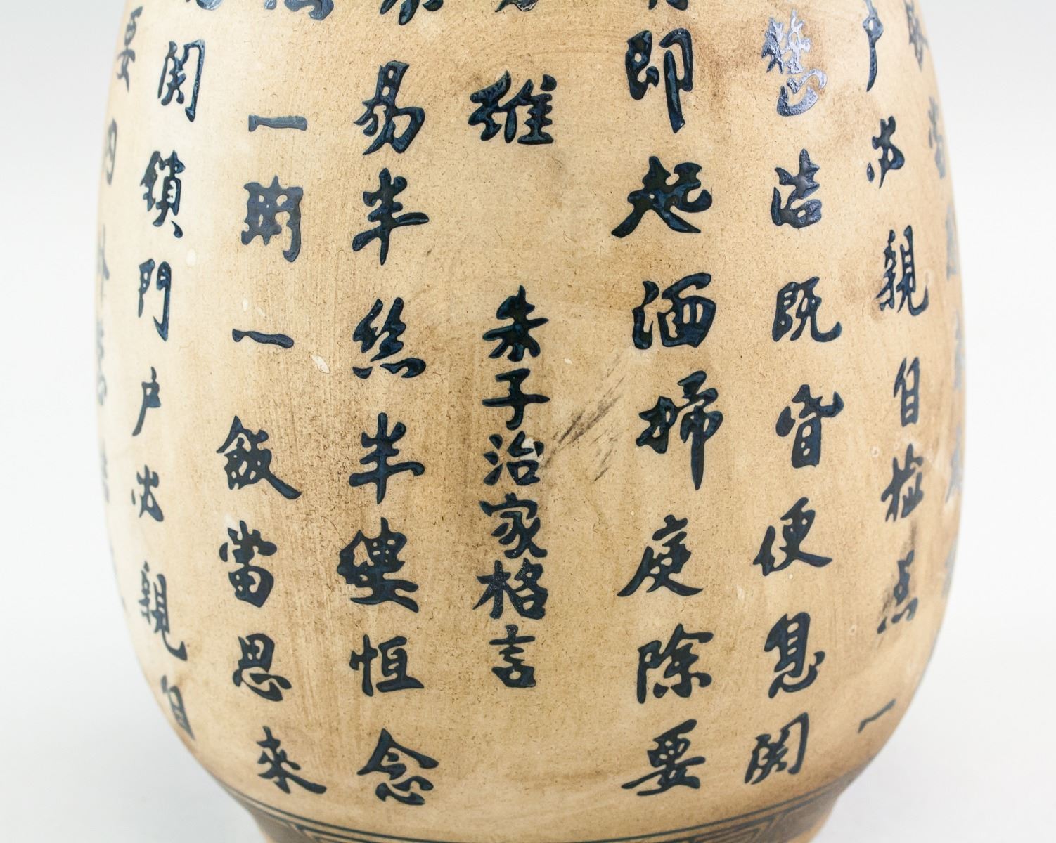 Chinese porcelain vase. Of wide lip, narrow neck, and oval body. Decorated with calligraphy of "Zhu Zi Zhi Jian Ge Yan". 25 x 18 cm, 1546 grams.