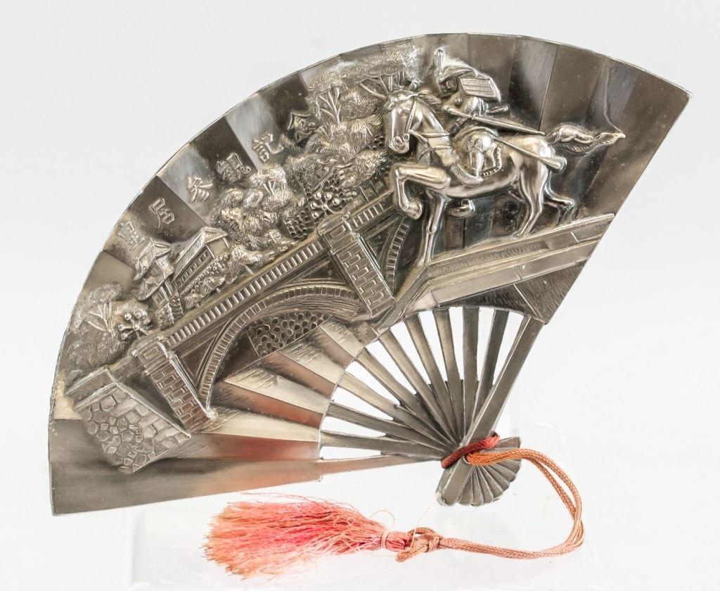 Chinese metal fan. Of decorative nature. Decorated with a man riding a horse. 13 x 21 cm, 199 grams.