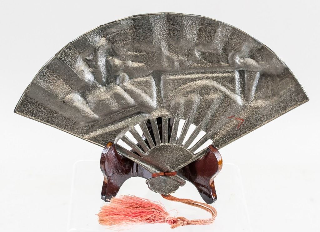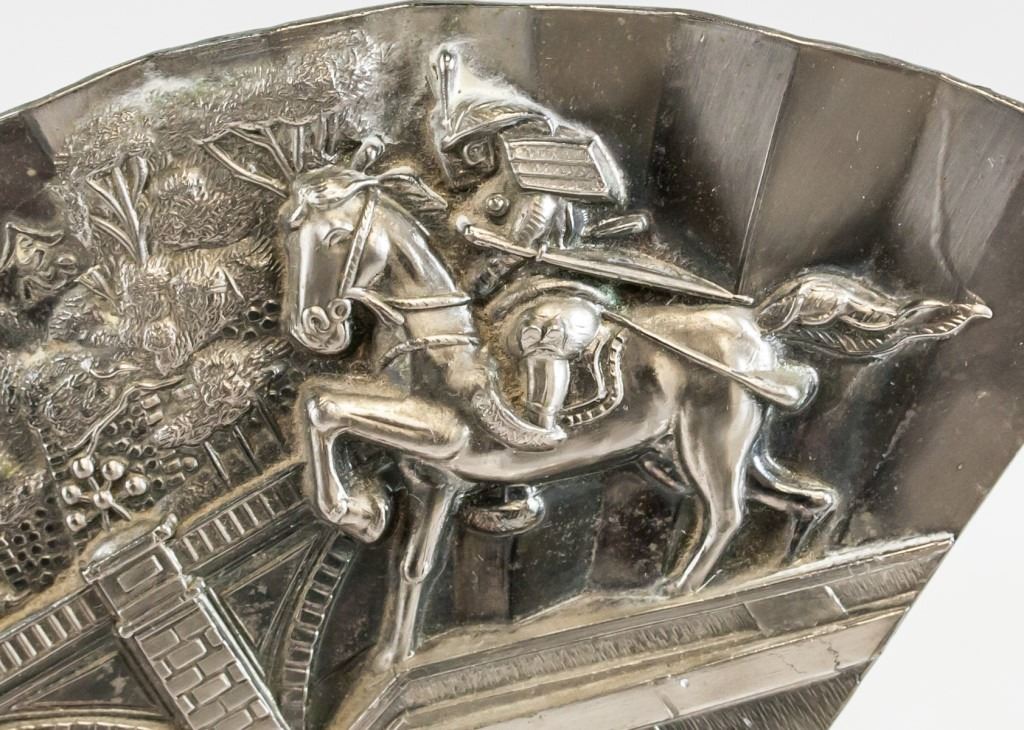 Chinese metal fan. Of decorative nature. Decorated with a man riding a horse. 13 x 21 cm, 199 grams.