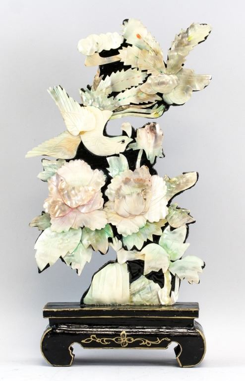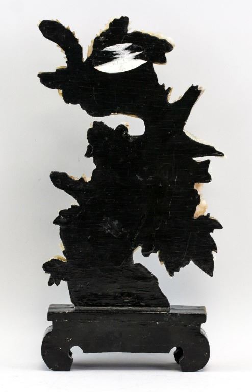 Chinese decorative plaque. Featuring birds and flowers. Rests on rectangular stand. H: 37 cm. W: 16 cm.
